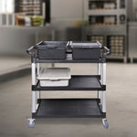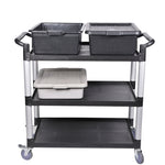 Seamlessly carry a variety of supplies with our RW Clean Black Plastic Small Heavy-Duty Rolling Utility Cart. Made from premium plastic and aluminum, this durable rolling utility cart is built to support up to 220 pounds. This heavy-duty utility cart is great for stowing away dry ingredients, kitchen tools, bus tubs, and more. Featuring a 3-tier design, this storage trolley can hold an assortment of supplies for either transporting or storing products at your foodservice establishment. This metal utility cart is equipped with easy-to-grip handles and swivel wheels to provide excellent control while moving through your dining area. Streamline your janitorial duties by adding our attachable slim trash can and small bus tub (SKU: RWT0464 & RWT0465) to this handy utility cart. Measuring 32 inches long by 17 inches wide by 35.75 inches tall, this 3-tier metal utility card is ideal for all businesses. Sold in a 1 count box.