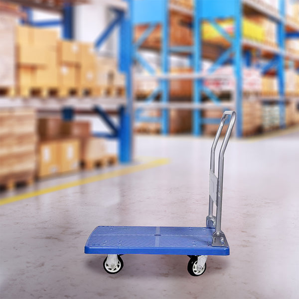 Easily transport heavy boxes with our RW Clean Blue Plastic Small Folding Platform Cart. With a heavy-duty construction, this durable folding platform cart can hold up to 660 pounds of supplies for your catering event, office, restaurant, and more. The rugged design features rubber tires to smoothly transport products without the risk of getting a flat tire. Equipped with a foldable handle, this handy platform dolly is the space-saving solution for easy storage in your restaurant's supply closet or your catering company's truck. Measuring 31.5 inches long by 21 inches wide, this folding flatbed cart can conveniently hold an assortment of heavy products while providing a comfortable handle to easily push or pull heavy loads. Sold in a 1 count box.