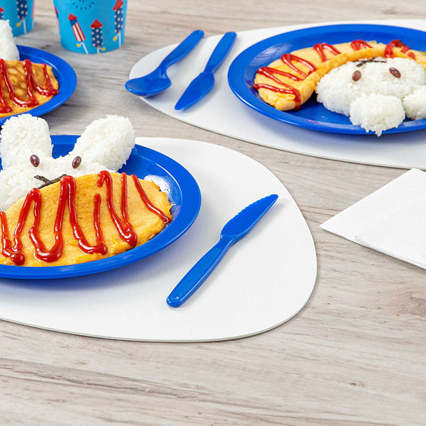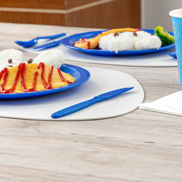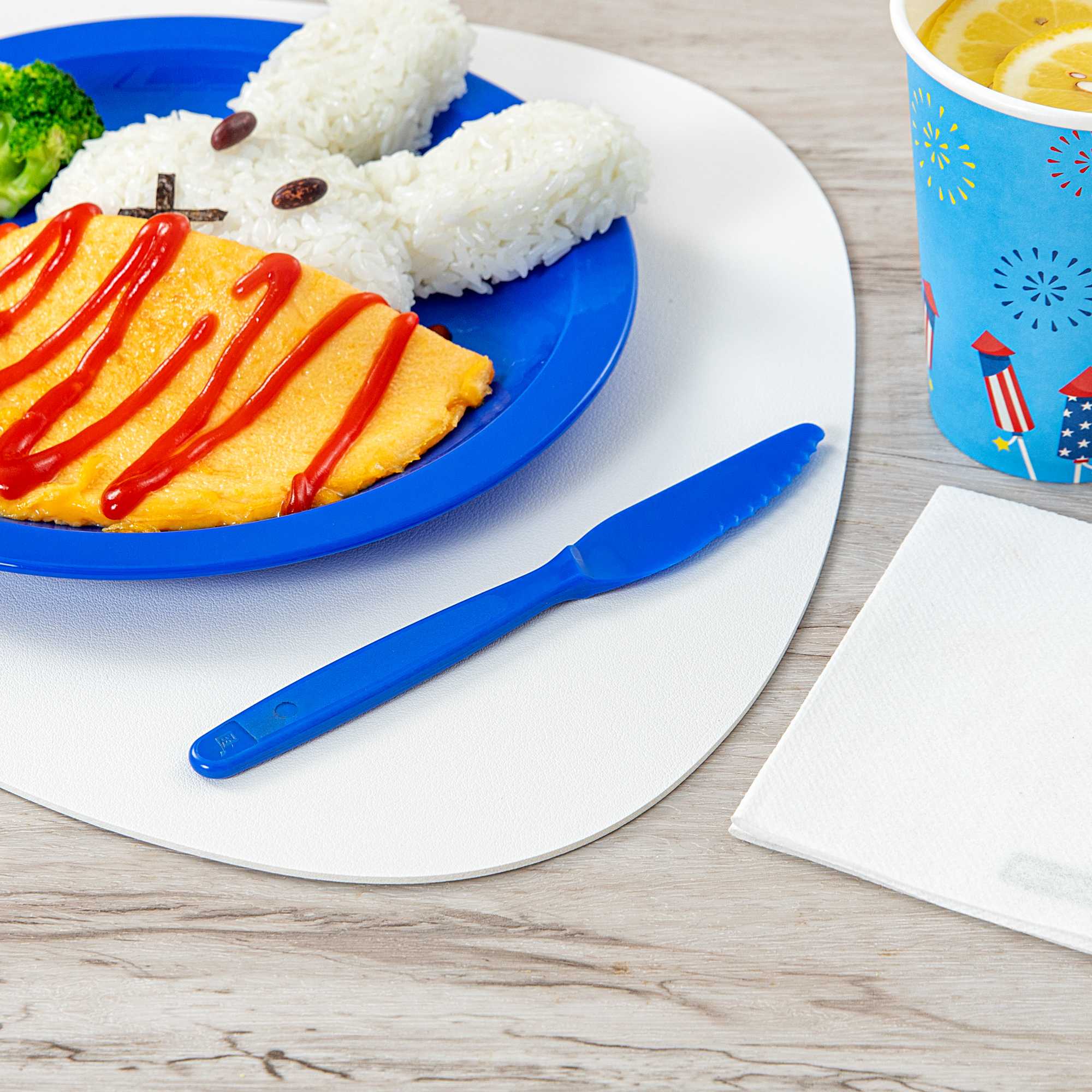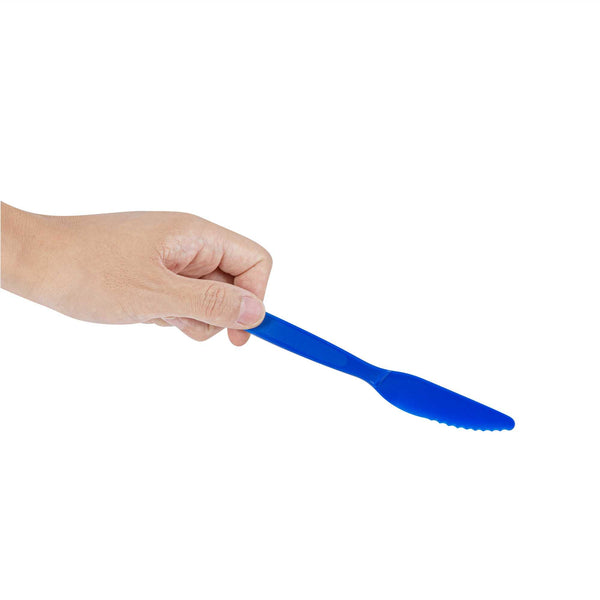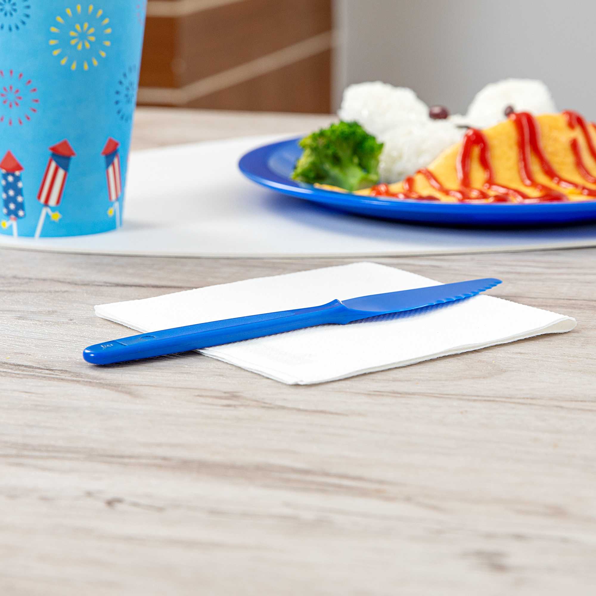 Ensure safe dining with vibrant, child-friendly utensils. The RW Kids Serrated Blade Kids Knife offers a serrated blade that minimizes risk for young diners, providing peace of mind for parents and caregivers. This plastic knife, measuring 7 inches in length, is constructed from virtually unbreakable polycarbonate, ensuring durability and reducing the need for frequent replacements, especially in school cafeterias. Designed with a break-resistant feature, it promises longevity in educational settings while the dishwasher-safe attribute simplifies cleaning in high-volume environments, making it an ideal choice for busy foodservice operations. The ergonomic handle provides a comfortable grip for children, enhancing their dining experience and fostering independence. Add a splash of fun with its vibrant blue color, perfect for children's menus in restaurants and cafes. Equip your establishment with this essential kids knife today. Sold in a 10 count box.