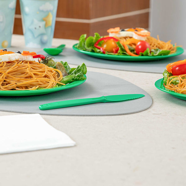 Ensure safe dining with our child-safe knife solution. The RW Kids Serrated Blade Plastic Knife is designed with a serrated blade that cuts food safely for children, making it the perfect addition to any kids' dining setup. Constructed from durable plastic, this 7-inch kids' plastic knife is virtually unbreakable and lightweight, ensuring longevity and reliability while promoting ease of use for small hands. The ergonomic handle provides comfort, while the vibrant green color adds a fun touch to children's dining experiences. Ideal for high-traffic foodservice environments, its dishwasher-safe feature simplifies cleaning in school kitchens, allowing for quick and efficient maintenance. Enhance your foodservice operations with this practical plastic knife, perfect for catering to young diners. Sold in a 10 count box.