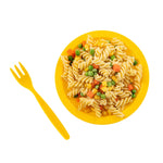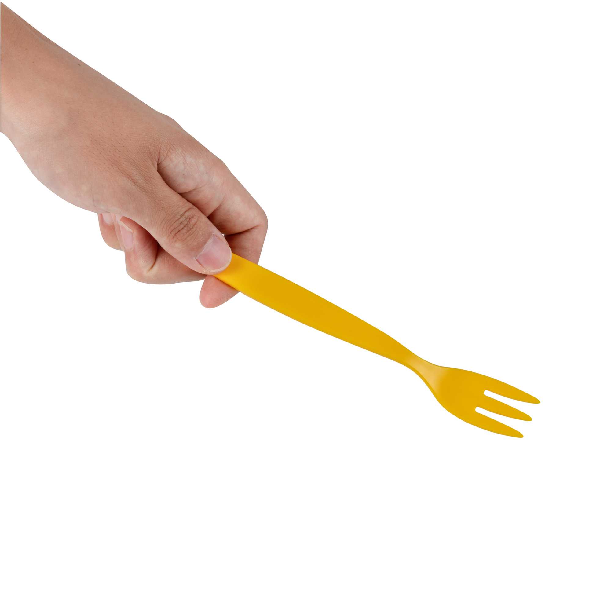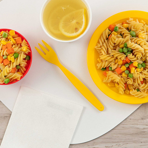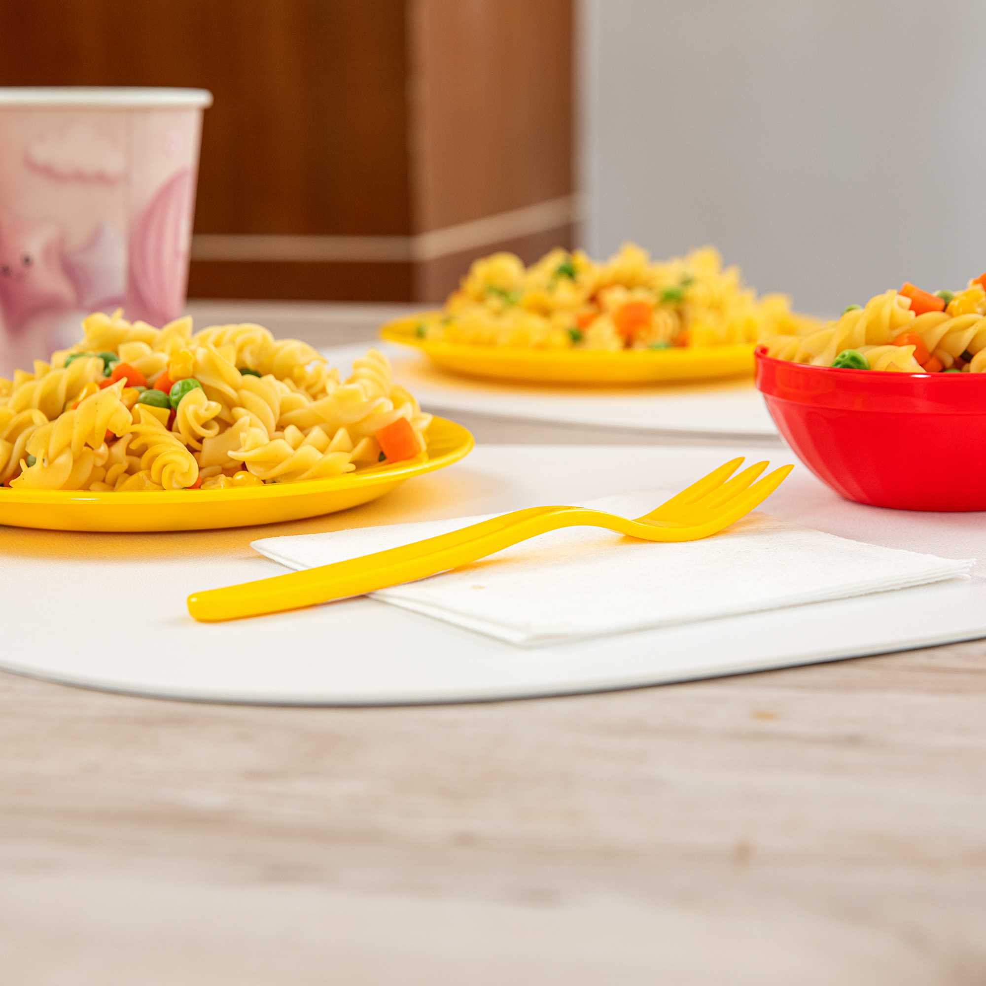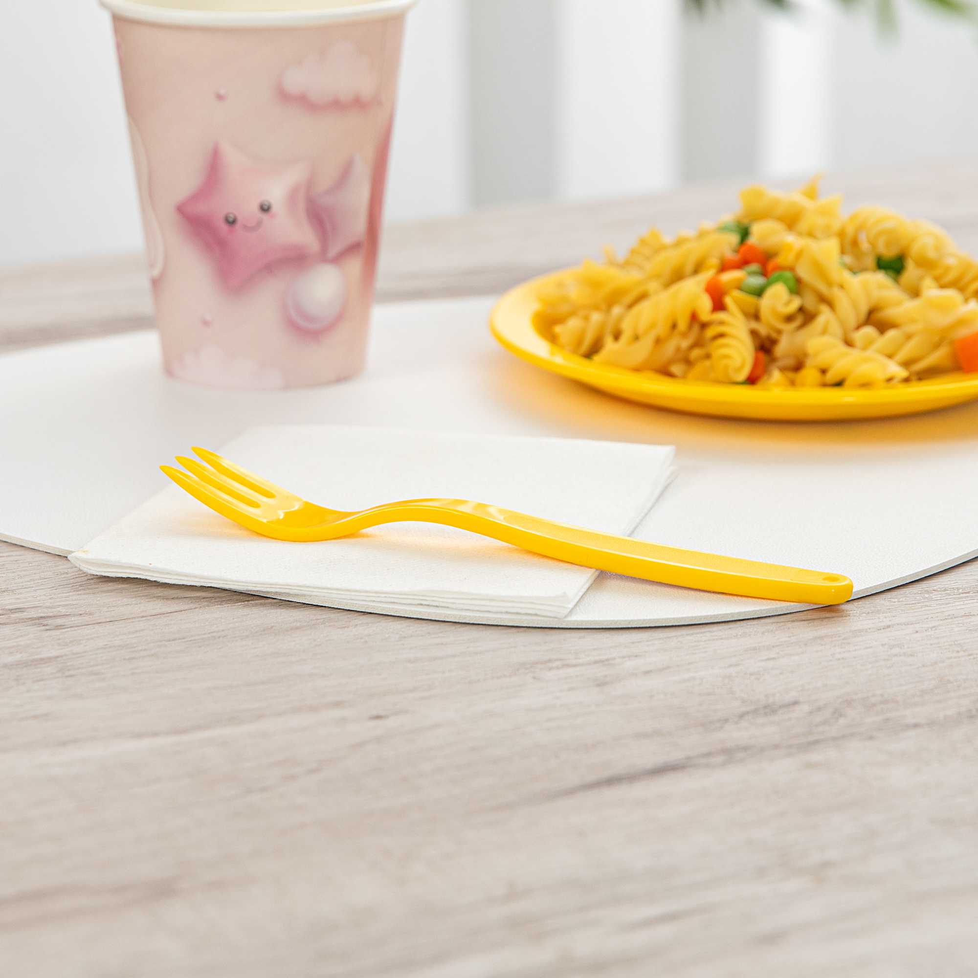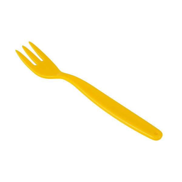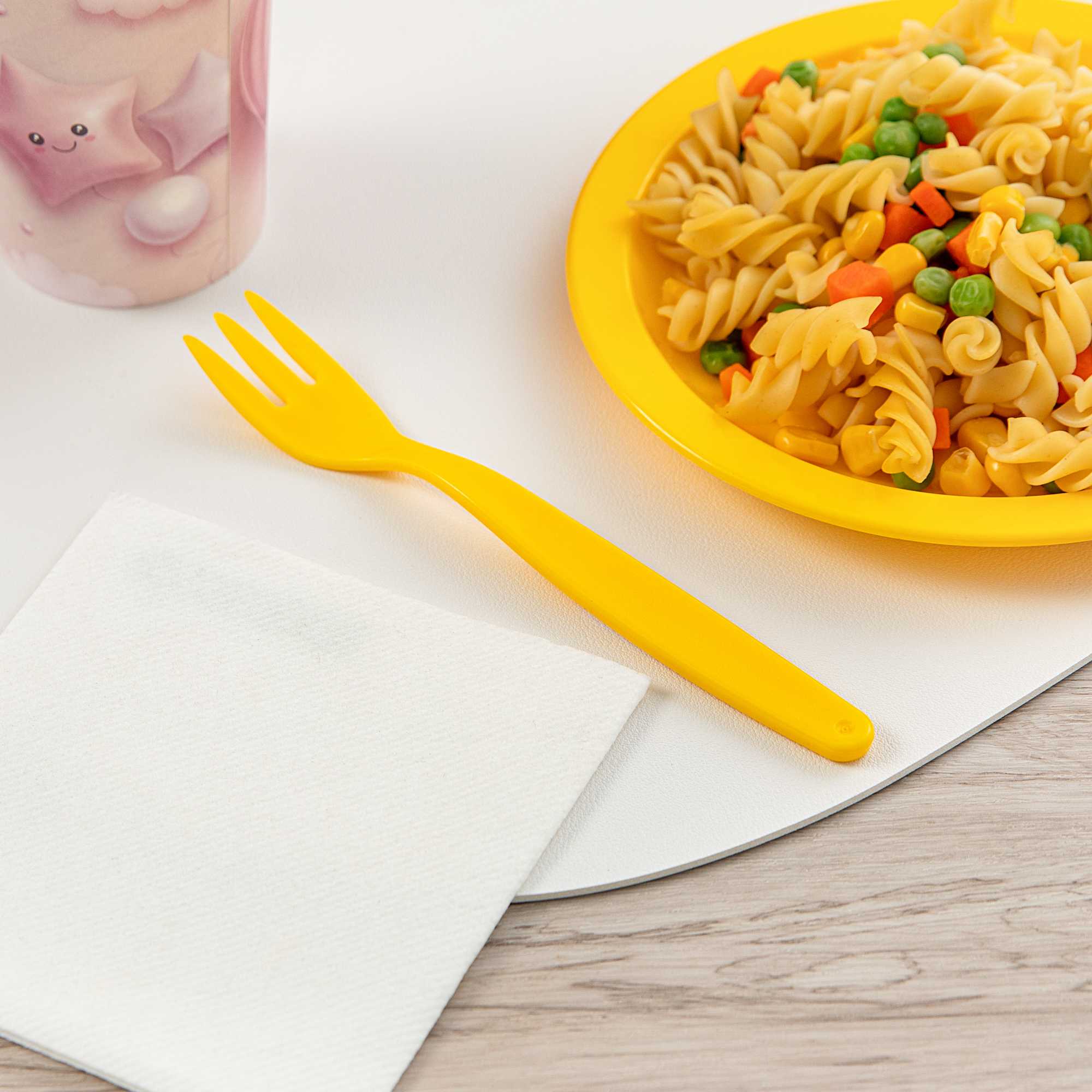 Ensure safe and efficient mealtimes with virtually unbreakable cutlery. RW Kids Yellow Plastic Forks combine a resilient plastic fork construction with a vibrant yellow color, making them ideal for children's flatware in bustling environments. Designed with a 6 3/4 inches length, these forks provide an ergonomic handle that enhances comfort during extended use, perfectly sized for little hands. These forks are also dishwasher safe, ensuring easy sanitation and suitability for sensitive environments. Elevate the dining experience with these engaging and durable utensils, perfect for any child-friendly foodservice setting. Sold in a 10 count box.