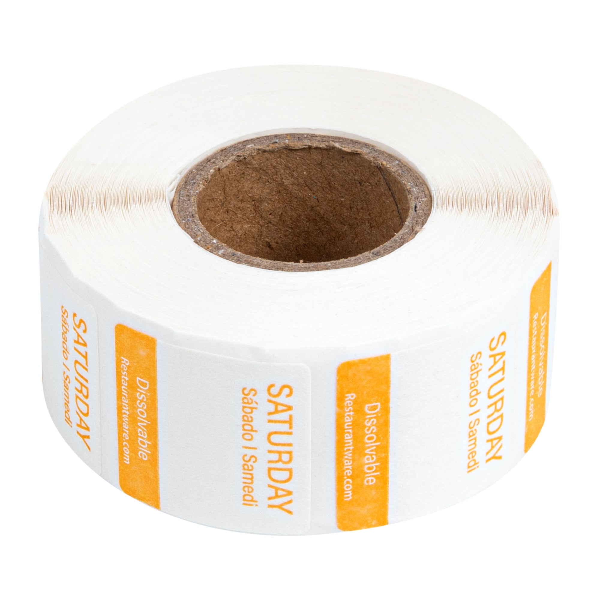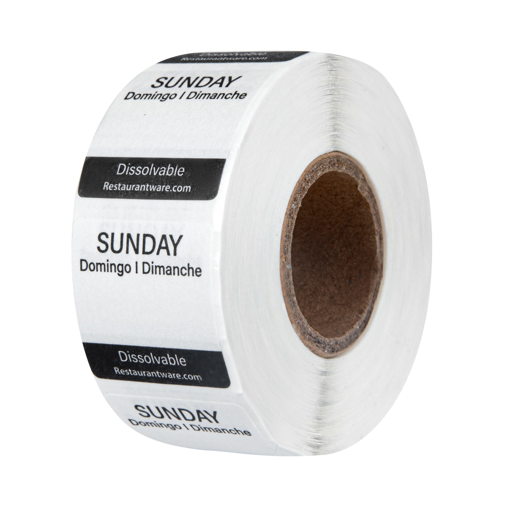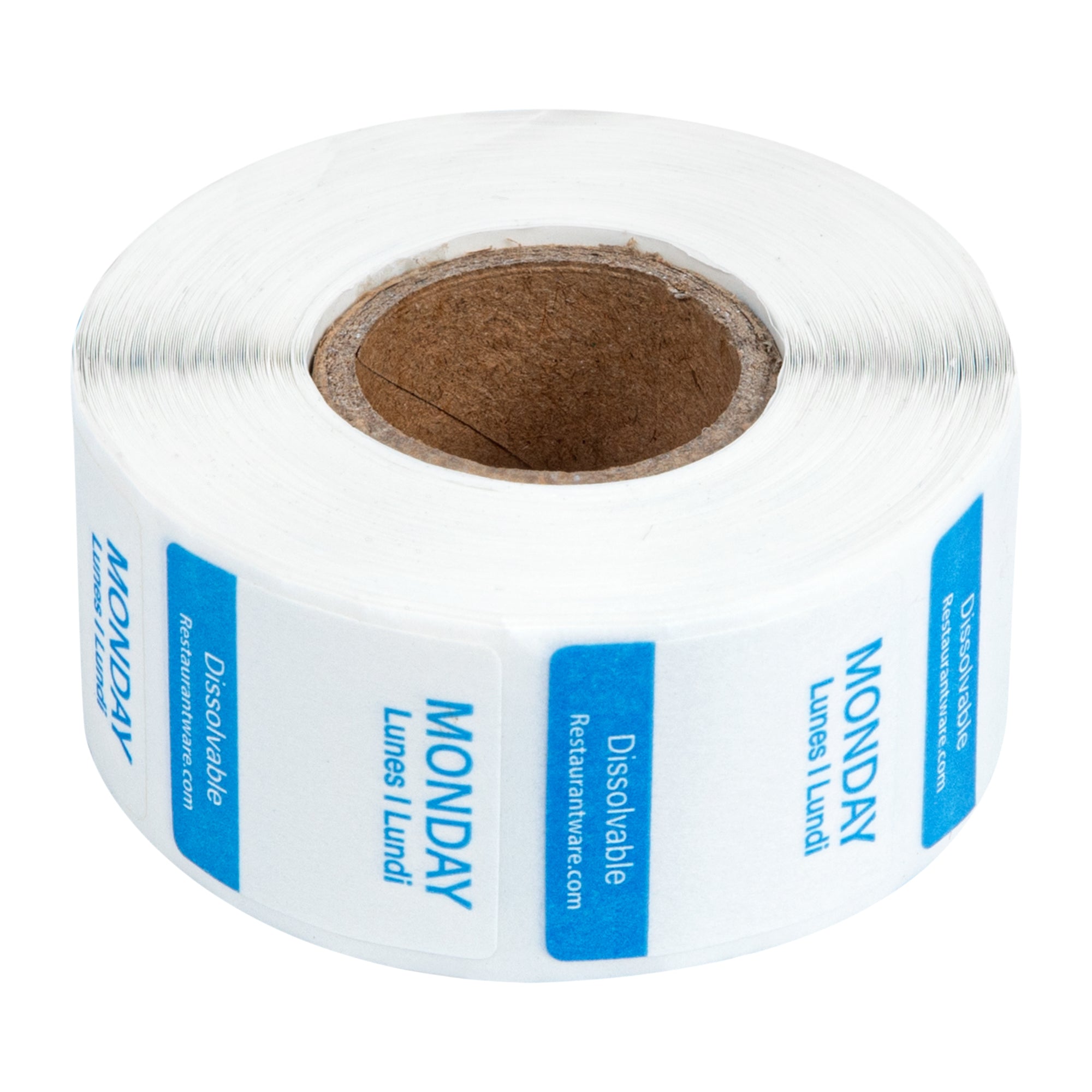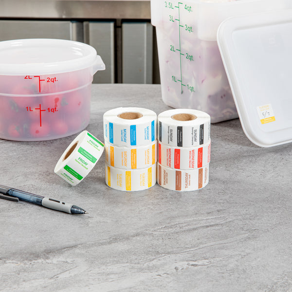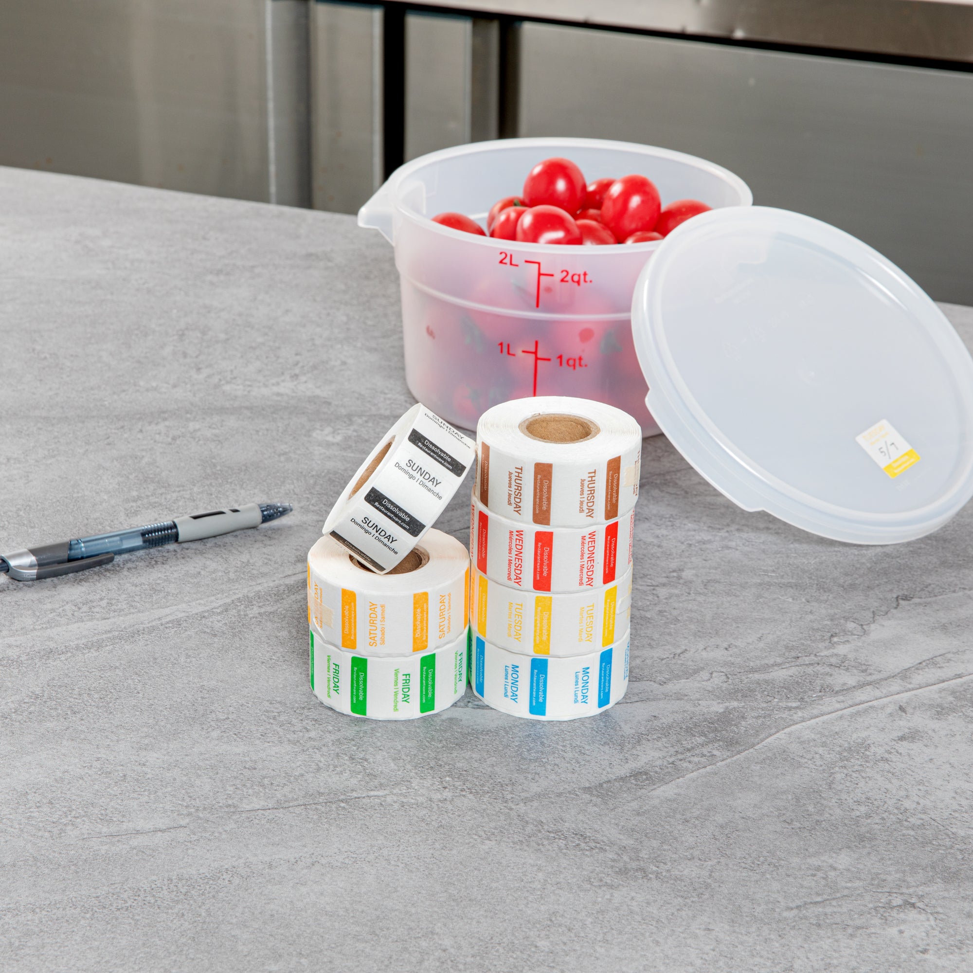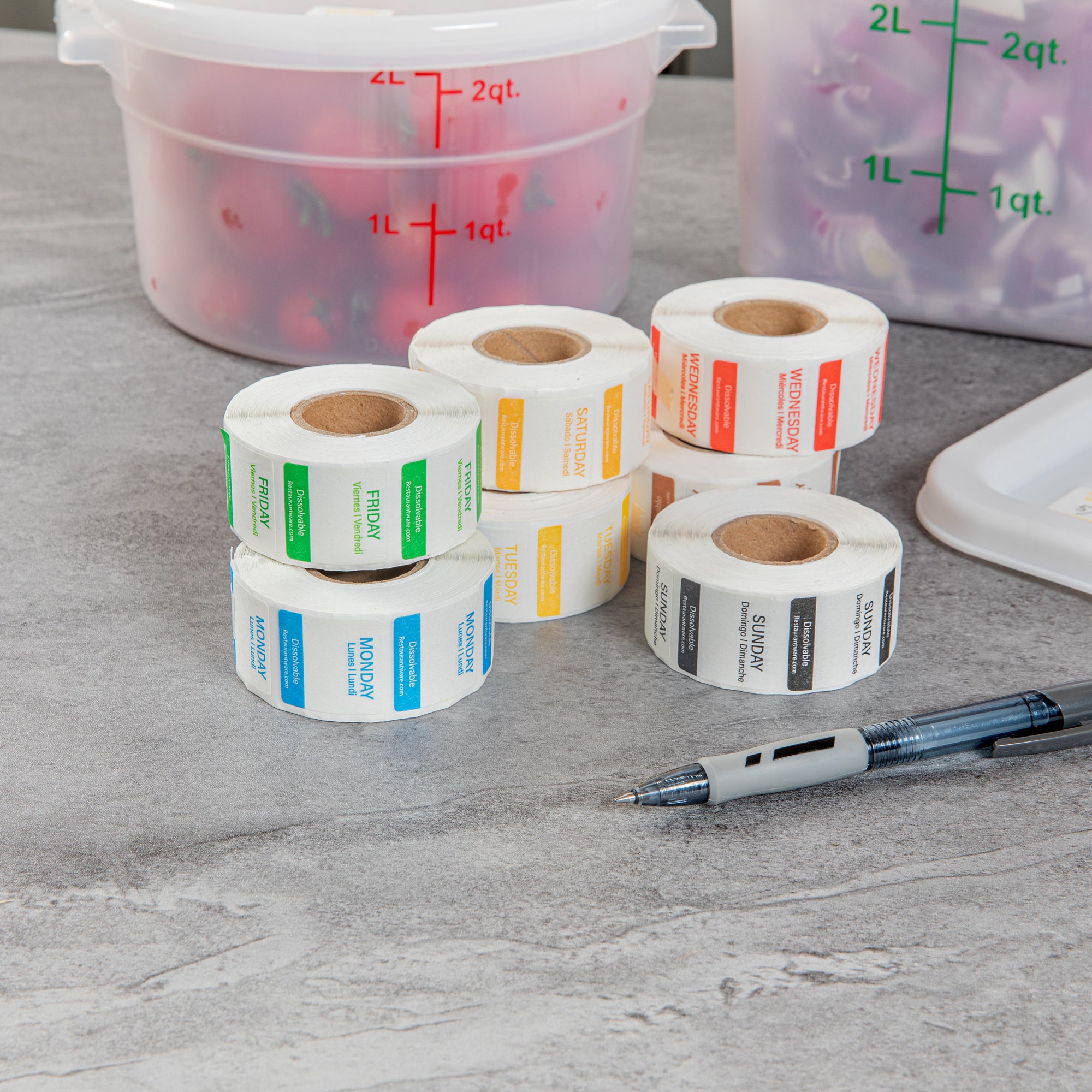 Keep all the materials in your kitchen neatly organized with our RW Smart Assorted Paper 7-Day Weekly Food Rotation Labels. These biodegradable label sticker papers come with 7 different food label rolls, and each roll is titled with a day of the week to allow you to easily keep track of inventory. Reading the days of the week in English, French, and Spanish, these trilingual food product labels make it easy for you to identify when a product was prepared. These charming food rotation labels have a semi-gloss finish and come in various colors, such as yellow, red, orange, and more, to provide a stylish way to label containers and organize your freezer or pantry. With a dissolvable design, these biodegradable food product labels dissolve in 20 seconds when placed under running hot or cold water without leaving any marks or sticky residue. These customizable food rotation labels feature a blank space under the title for writing dates or initials to minimize waste at your bar, restaurant, or other foodservice establishment. Pair these food labels with our RW Smart Clear Acrylic Label Dispenser that includes 7 slots (SKU: RWP0546) or our RW Smart Clear Acrylic Label Dispenser that includes 9 slots and a lid (SKU: RWP0545). Measuring 1 inch long by 1 inch wide, these colorful food storage labels are ideal for your pantry. Shipped with 7 rolls, and each roll comes with 500 labels which contain 3,500 labels. This item will only degrade outside of the traditional solid waste stream. Label dispensers are available and sold separately.
