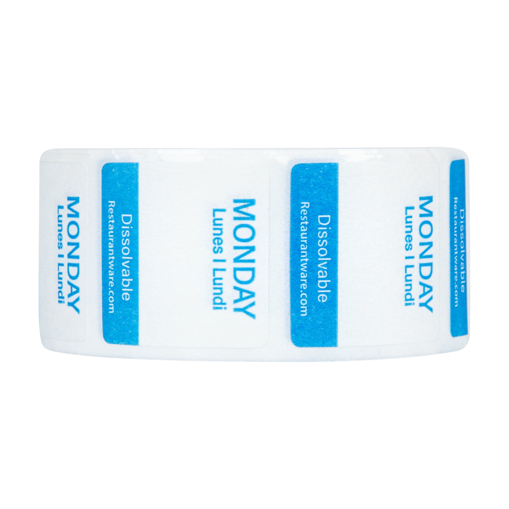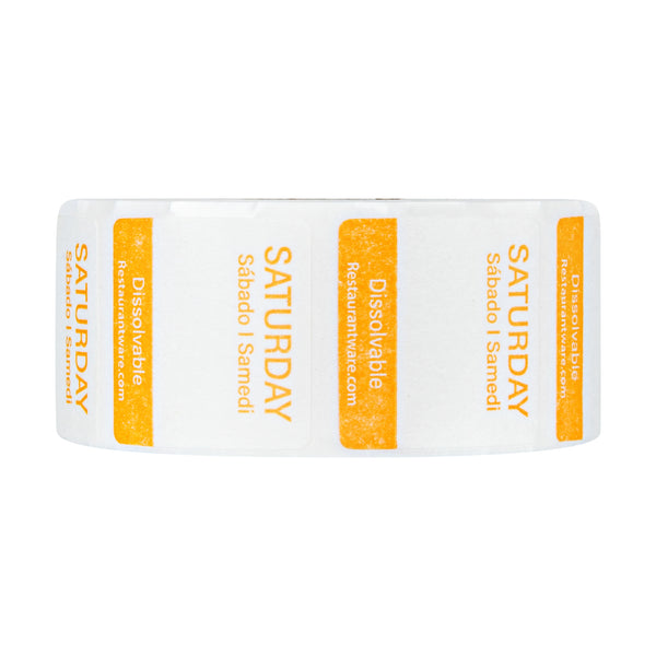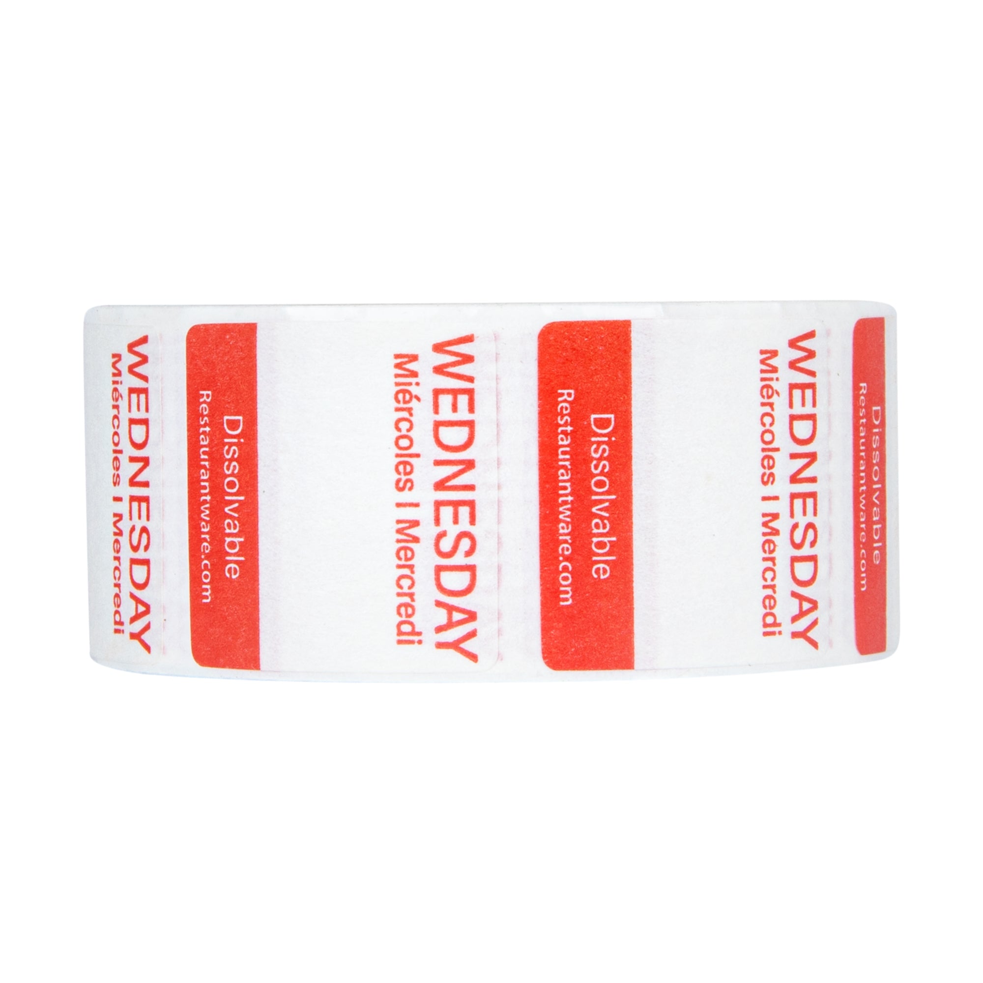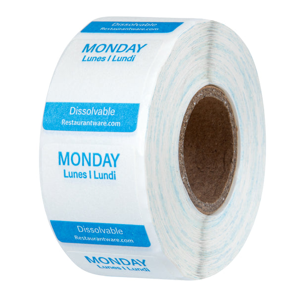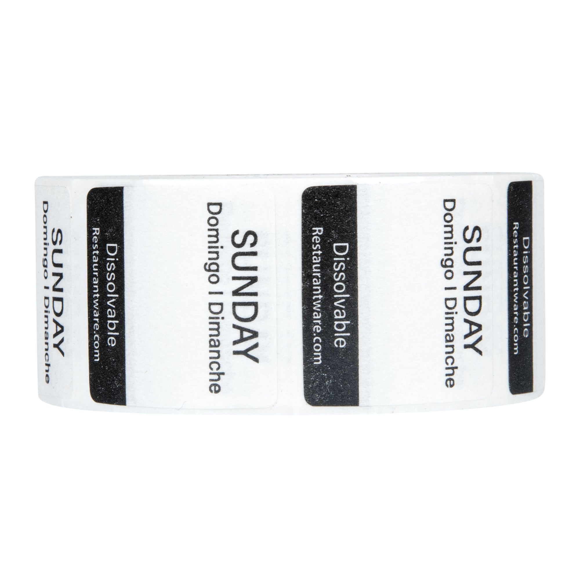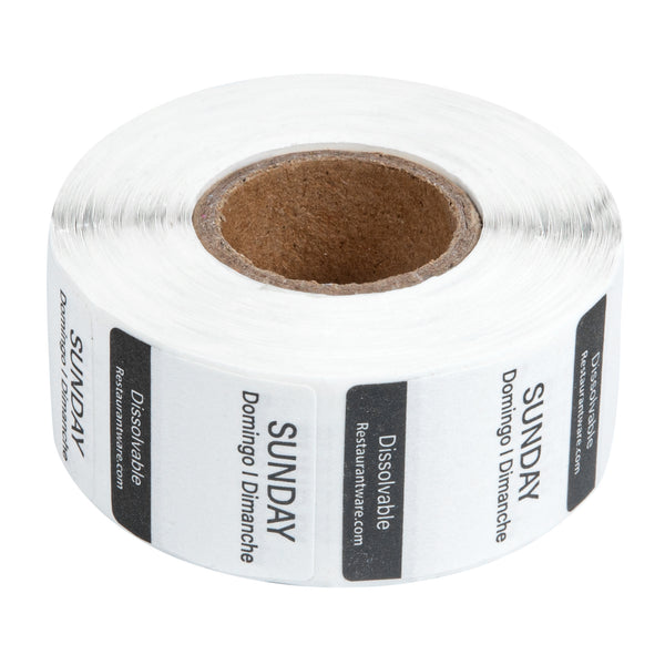Keep all the materials in your kitchen neatly organized with our RW Smart Assorted Paper 7-Day Weekly Food Rotation Labels. These biodegradable label sticker papers come with 7 different food label rolls, and each roll is titled with a day of the week to allow you to easily keep track of inventory. Reading the days of the week in English, French, and Spanish, these trilingual food product labels make it easy for you to identify when a product was prepared. These charming food rotation labels have a semi-gloss finish and come in various colors, such as yellow, red, orange, and more, to provide a stylish way to label containers and organize your freezer or pantry. With a dissolvable design, these biodegradable food product labels dissolve in 20 seconds when placed under running hot or cold water without leaving any marks or sticky residue. These customizable food rotation labels feature a blank space under the title for writing dates or initials to minimize waste at your bar, restaurant, or other foodservice establishment. Pair these food labels with our RW Smart Clear Acrylic Label Dispenser that includes 7 slots (SKU: RWP0546) or our RW Smart Clear Acrylic Label Dispenser that includes 9 slots and a lid (SKU: RWP0545). Measuring 1 inch long by 1 inch wide, these colorful food storage labels are ideal for your pantry. Shipped with 7 rolls, and each roll comes with 500 labels which contain 3,500 labels. This item will only degrade outside of the traditional solid waste stream. Label dispensers are available and sold separately.