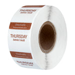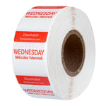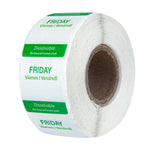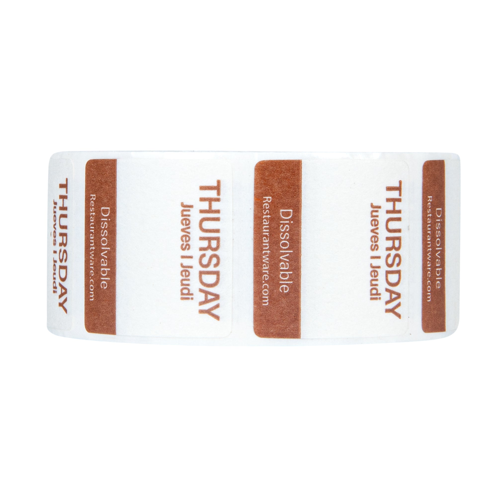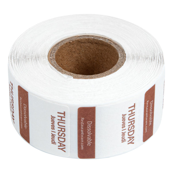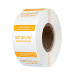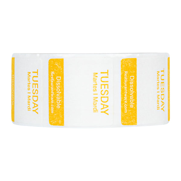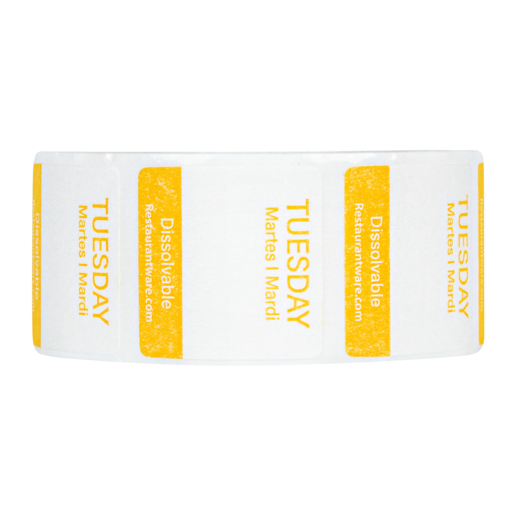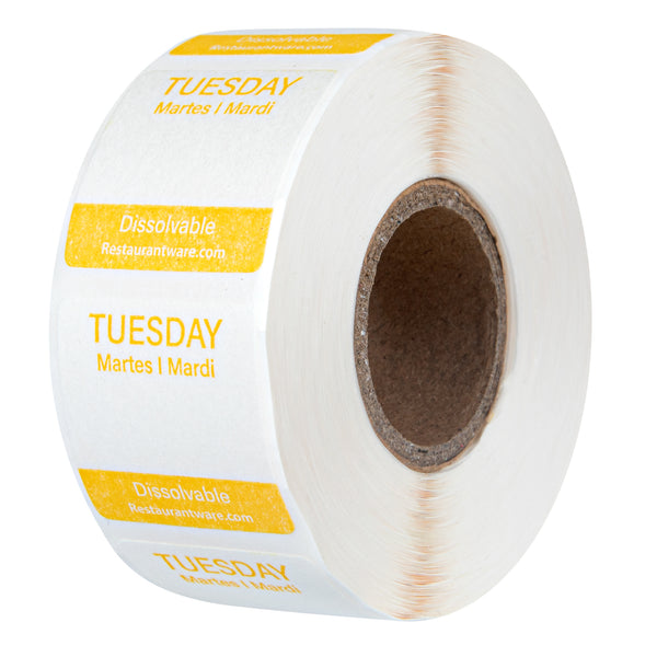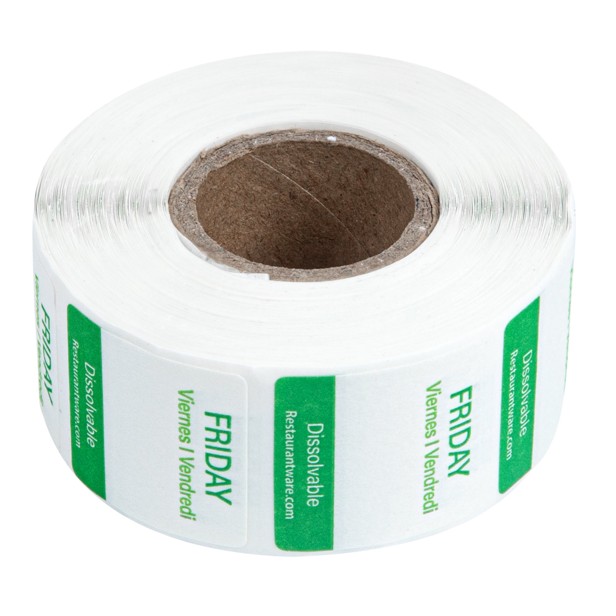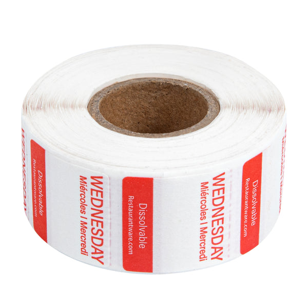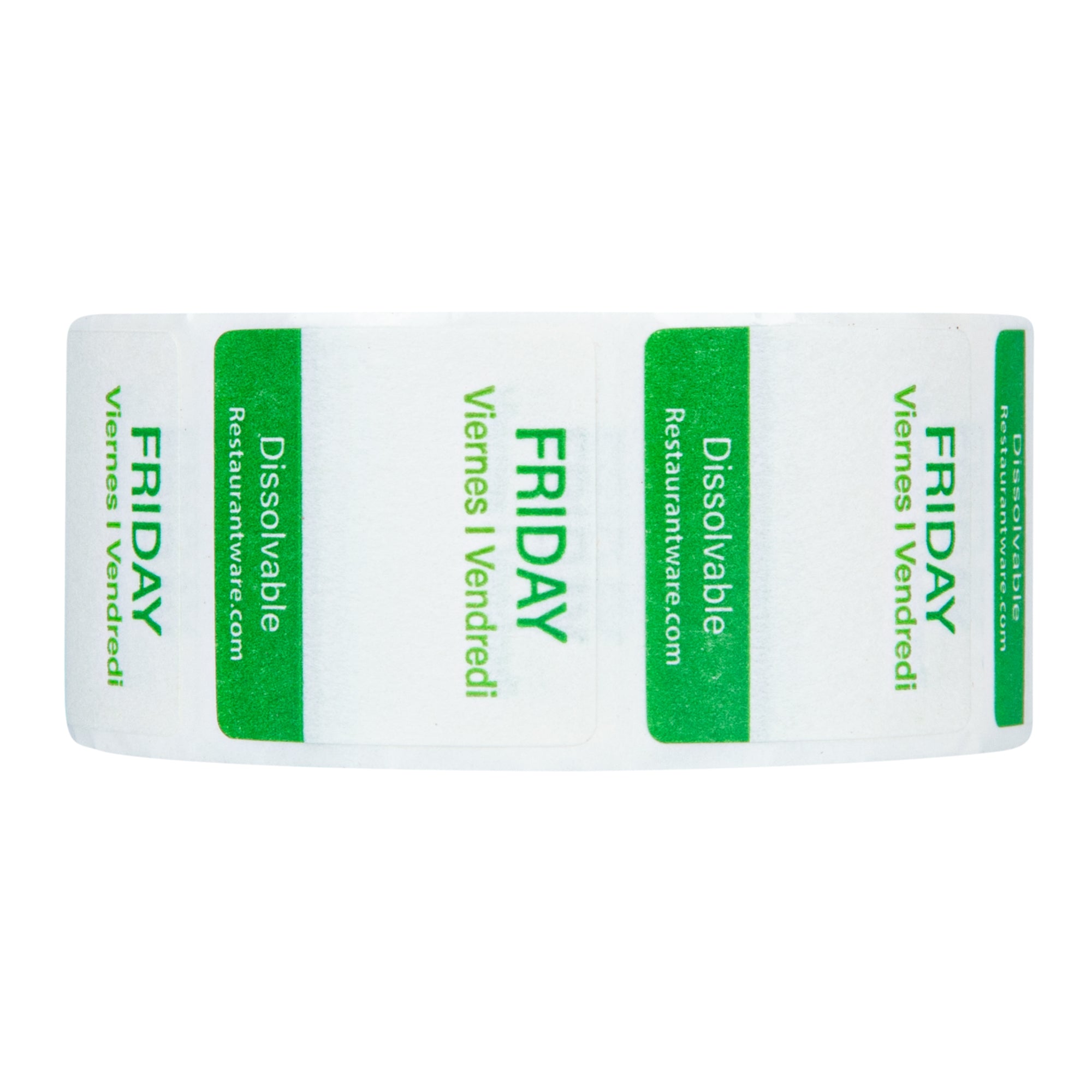 Keep all the materials in your kitchen neatly organized with our RW Smart Assorted Paper 7-Day Weekly Food Rotation Labels. These biodegradable label sticker papers come with 7 different food label rolls, and each roll is titled with a day of the week to allow you to easily keep track of inventory. Reading the days of the week in English, French, and Spanish, these trilingual food product labels make it easy for you to identify when a product was prepared. These charming food rotation labels have a semi-gloss finish and come in various colors, such as yellow, red, orange, and more, to provide a stylish way to label containers and organize your freezer or pantry. With a dissolvable design, these biodegradable food product labels dissolve in 20 seconds when placed under running hot or cold water without leaving any marks or sticky residue. These customizable food rotation labels feature a blank space under the title for writing dates or initials to minimize waste at your bar, restaurant, or other foodservice establishment. Pair these food labels with our RW Smart Clear Acrylic Label Dispenser that includes 7 slots (SKU: RWP0546) or our RW Smart Clear Acrylic Label Dispenser that includes 9 slots and a lid (SKU: RWP0545). Measuring 1 inch long by 1 inch wide, these colorful food storage labels are ideal for your pantry. Shipped with 7 rolls, and each roll comes with 500 labels which contain 3,500 labels. This item will only degrade outside of the traditional solid waste stream. Label dispensers are available and sold separately.