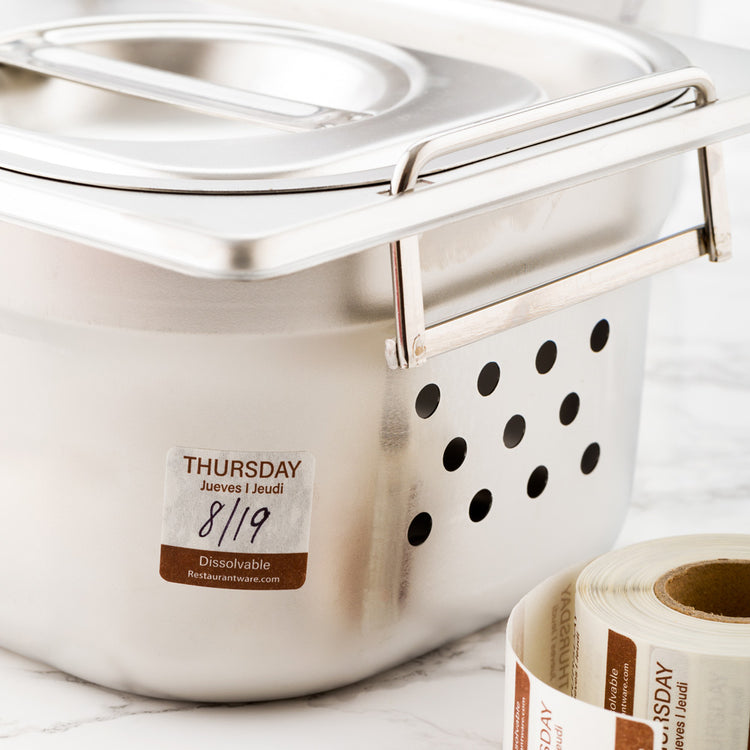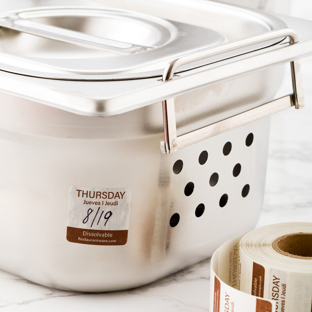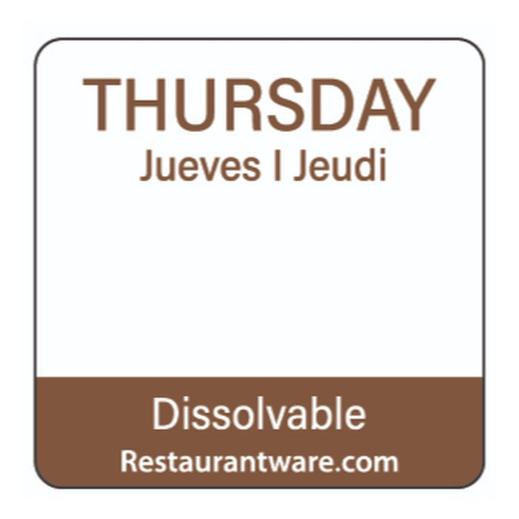 Keep your kitchen supplies in order with our RW Smart Brown Paper Weekly Thursday Food Rotation Labels. Reading "THURSDAY," "JEUDI," and "JUEVES," these trilingual product labels allow your English, French, and Spanish-speaking staff members to quickly identify how long food items have been in the fridge or freezer. These brown and white food packaging labels feature a semi-gloss finish that makes them easy to read and effortlessly gives your containers a delightful touch. Featuring a blank space under the title "Thursday," these biodegradable date labels for food have space for you to jot down initials or dates to conveniently keep track of food items. These product labels are terrific for the First In, First Out (FIFO) organization of supplies in your restaurant, bar, or other foodservice establishment to ensure your employees know when an item was prepared. With a dissolvable design, these biodegradable food product labels dissolve in 20 seconds when placed under running hot or cold water without leaving any marks or sticky residue. Keep your dissolvable food packaging labels neat and tidy with our RW Smart Clear Acrylic Label Dispenser that includes 7 slots (SKU: RWP0546) or our RW Smart Clear Acrylic Label Dispenser that includes 9 slots and a lid (SKU: RWP0545). Measuring 1 inch long by 1 inch wide, these stylish food labels are ideal for all kinds of pantries. Sold in a 500 count box. This item will only degrade outside of the traditional solid waste stream. Label dispensers are available and sold separately.