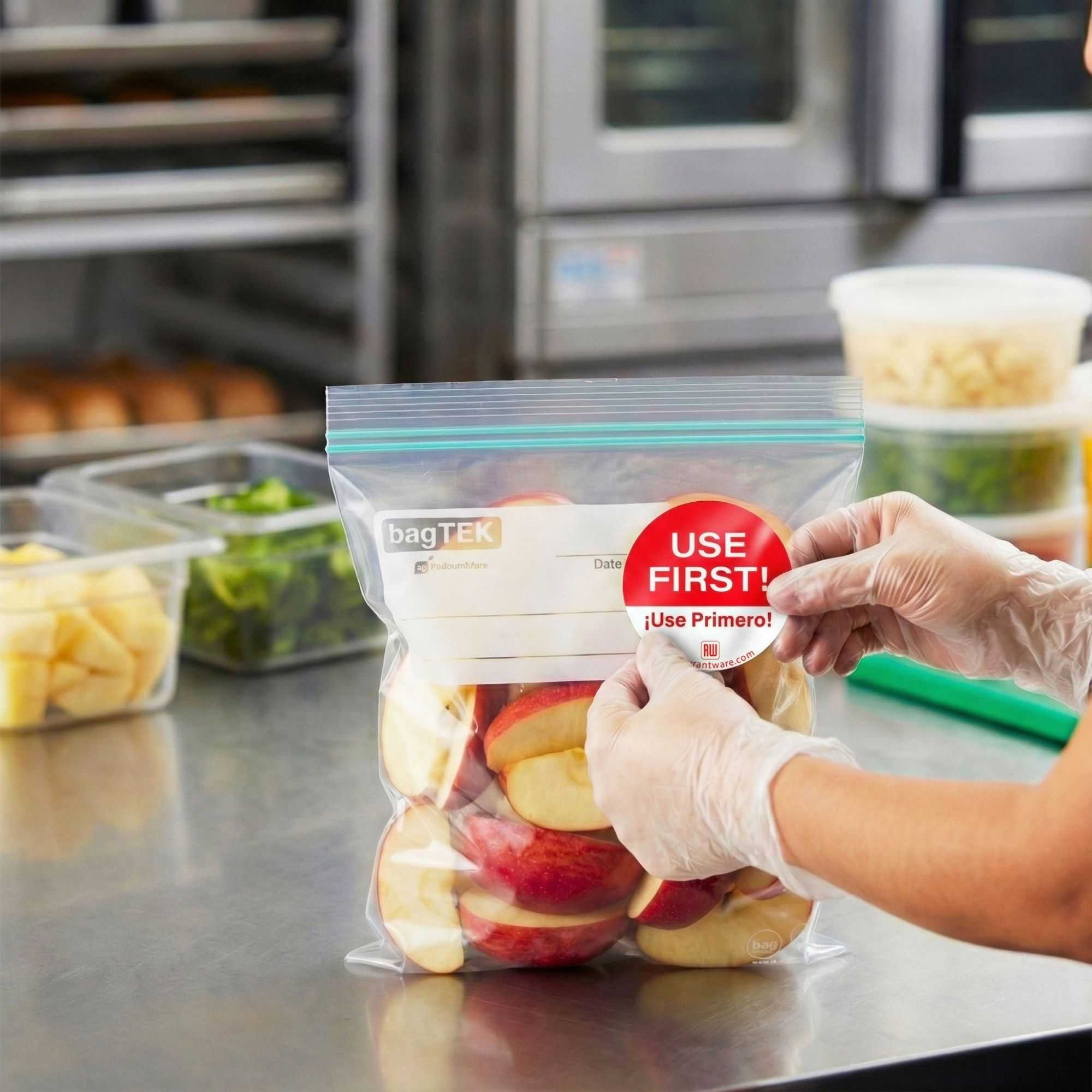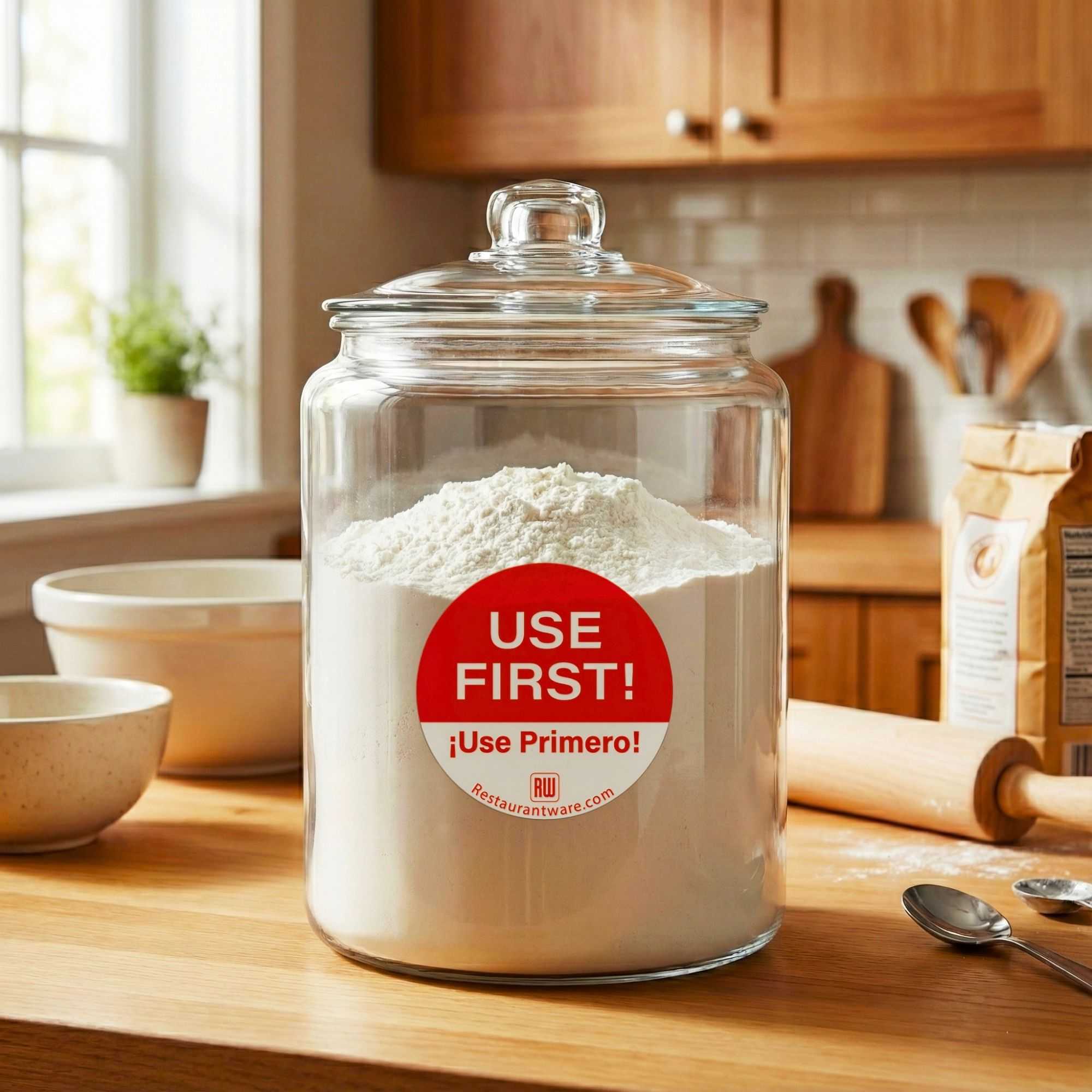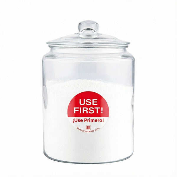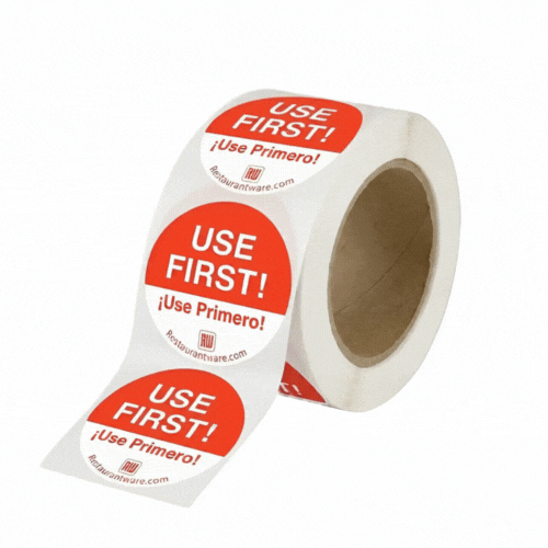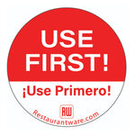 Neatly organize your kitchen with our RW Smart Red Paper Use First Food Rotation Labels. These circular food labels are easily removable, which allows your employees to quickly peel off these stickers without leaving sticky marks on your containers. These food date labels are red and white and instantly catch the attention of your team when they are looking for specific items. Each red sticker label reads "USE FIRST!" and is great for applying to the First In, First Out (FIFO) system at your restaurant, bar, or other foodservice establishment. Also written in Spanish to read "USE PRIMERO!" these labels make it easy for English and Spanish speaking employees to understand these stickers. Measuring 2 inches long by 2 inches wide, these removable food storage labels are available in a 500 count roll. Label dispensers are available and sold separately.