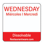 Get rid of the need to mark up containers with our RW Smart Red Paper Weekly Wednesday Food Rotation Labels. These red and white product labels read "Wednesday" in English, Spanish, and French, which makes it easy for trilingual foodservice establishments to understand these unique labels. Featuring a blank space under the title "Wednesday," these elegant food sticker labels have an ample amount of room for you to write initials or dates to keep track of food items. Excellent for First in, First Out (FIFO) organization of perishables in your fridge or pantry, these biodegradable food rotation labels ensure your employees use the correct products. These food storage labels are built to dissolve when you wash them in the dishwasher or under running hot or cold water in less than 20 seconds and won't leave permanent marks on containers. Organize your Wednesday food labels with our RW Smart Clear Acrylic Label Dispenser, which includes 7 slots (SKU: RWP0546), or our RW Smart Clear Acrylic Label Dispenser, which includes 9 slots and a lid (SKU: RWP0545). Measuring 1 inch long by 1 inch wide, these dissolvable food labels are ideal for all kinds of pantries. Sold in a 500 count box. This item will only degrade outside of the traditional solid waste stream. Label dispensers are available and sold separately.