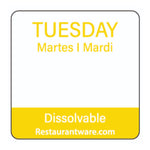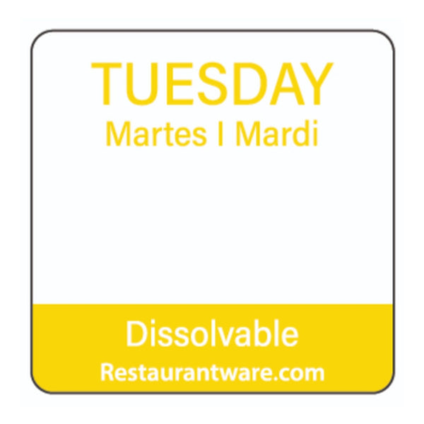 Organize kitchen supplies with our RW Smart Yellow Paper Weekly Tuesday Food Rotation Labels. Reading "TUESDAY," "MARDI," and "MARTI" in yellow font, these food label sticker papers allow your English, French, and Spanish-speaking patrons to quickly understand these trilingual labels. These biodegradable food storage labels dissolve in less than 20 seconds when placed under running hot or cold water and won't leave your food containers marked up. Featuring a semi-gloss finish, these beautiful restaurant food labels are easy to identify and provide a stylish way to label your containers. These labels are excellent for the First In, First Out (FIFO) organization of items in your restaurant, bar, or other foodservice establishment to guarantee your staff is aware of when a product was prepared. Keep your food storage labels neat and tidy with our RW Smart Clear Acrylic Label Dispenser that includes 7 slots (SKU: RWP0546) or our RW Smart Clear Acrylic Label Dispenser that includes 9 slots and a lid (SKU: RWP0545). Measuring 1 inch long by 1 inch wide, these dissolvable food labels are ideal for all kinds of food pantries. Shipped in a 500 count box. This item will only degrade outside of the traditional solid waste stream. Label dispensers are available and sold separately.
