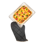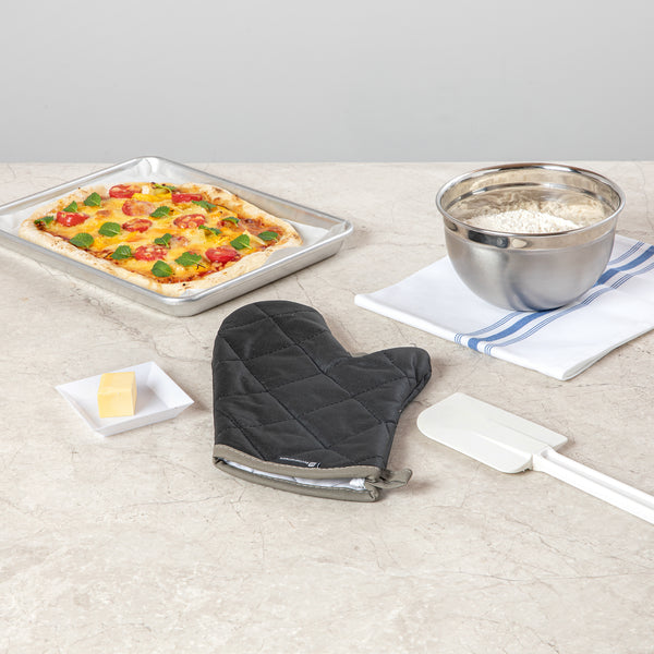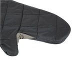 Safely handle hot pans in your busy kitchen with our RW Threads Black Cotton Oven Mitt. Featuring heat and flame-resistant capabilities, this durable oven mitt protects your hand from accidental burns, repels flames, and can endure high temperatures up to 500 degrees Fahrenheit. With a built-in thumb guard, this oven glove provides extra coverage between the thumb and forefinger, allowing you to hold hot pans and oven sheets for a longer amount of time. This long-lasting cooking glove is great for sauteing fresh vegetables or transferring large pots of savory soup from the stove to kitchen countertops at your restaurant, buffet, catering company, and more. This convenient machine washable glove measures 13.8 inches long by 8 inches wide. Sold in a 1 count box.