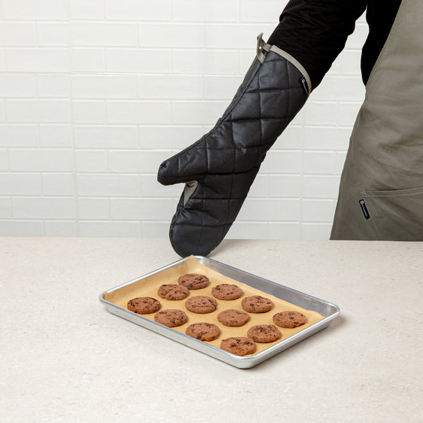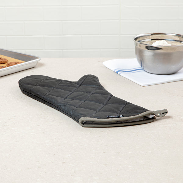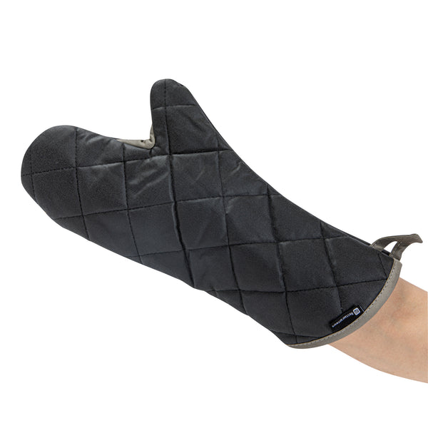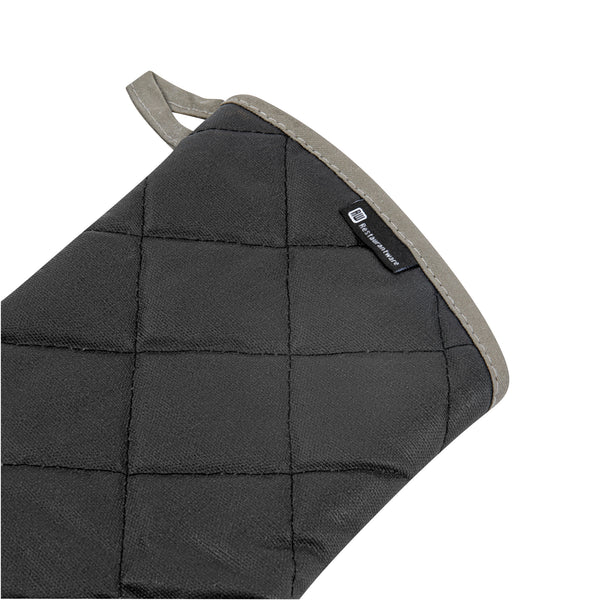 Safely cook delicious dishes with our RW Threads Black Cotton Oven Mitt. Equipped with a heat-resistant thumb guard, this long oven mitt provides thick insulation between the forefinger and thumb, allowing you to handle hot pans or transfer large pots easily. Featuring a flame retardant coating, this grill glove can withstand temperatures up to 500 degrees Fahrenheit and repels open flames. With a built-in hanging loop, this durable oven mitt provides easy storage and is conveniently machine-washable. This oven mitt measures 17 inches long by 8 inches wide and is essential for your restaurant, buffet, catering company, and more. Shipped in a 1 count box.
