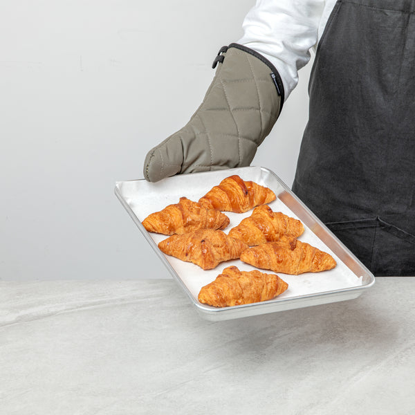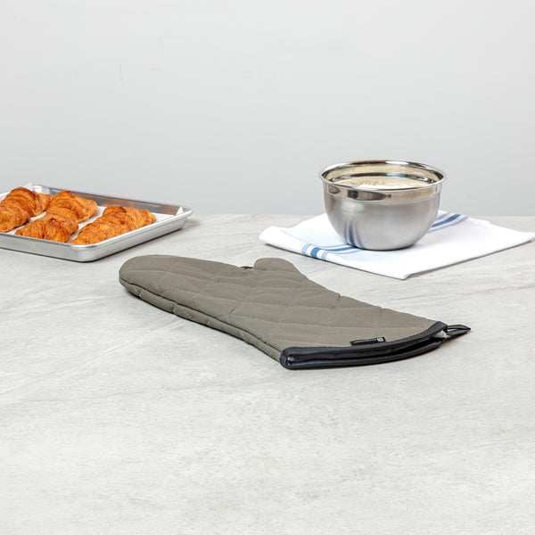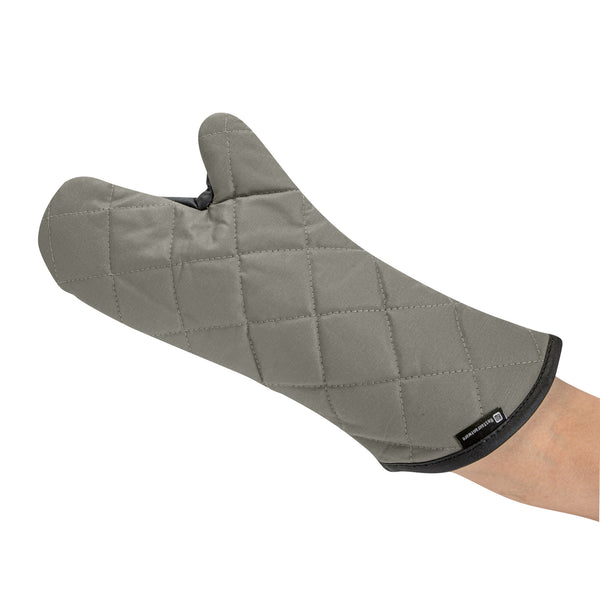 Shield your hands from hot, greasy splatters and open flames with our RW Threads Gray Cotton Oven Mitt. This heat-resistant baking mitt can endure high temperatures up to 500 degrees Fahrenheit. Featuring a built-in thumb guard, this durable oven mitt provides thick insulation, allowing you to safely grip hot pots and pans for a longer period of time than average oven mitts. With a flame-retardant coating, this heat-resistant oven glove extinguishes flames and prevents accidental burns and injuries. This long-lasting cooking mitt is equipped with a hanging loop for easy storage and is conveniently machine-washable. Measuring 17 inches long by 8 inches wide, this oven glove is a must-have for any commercial kitchen. Sold in a 1 count box.