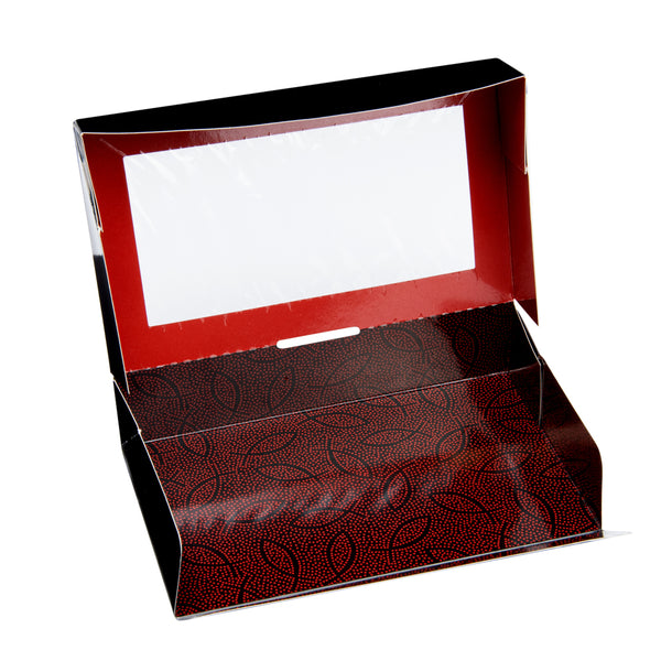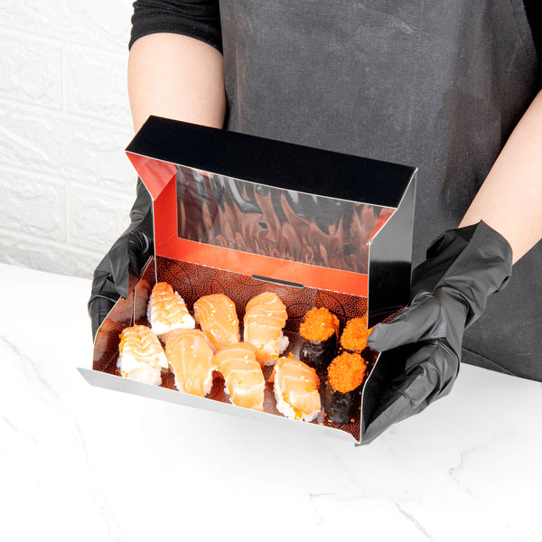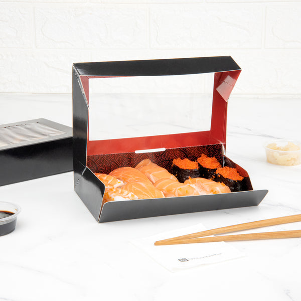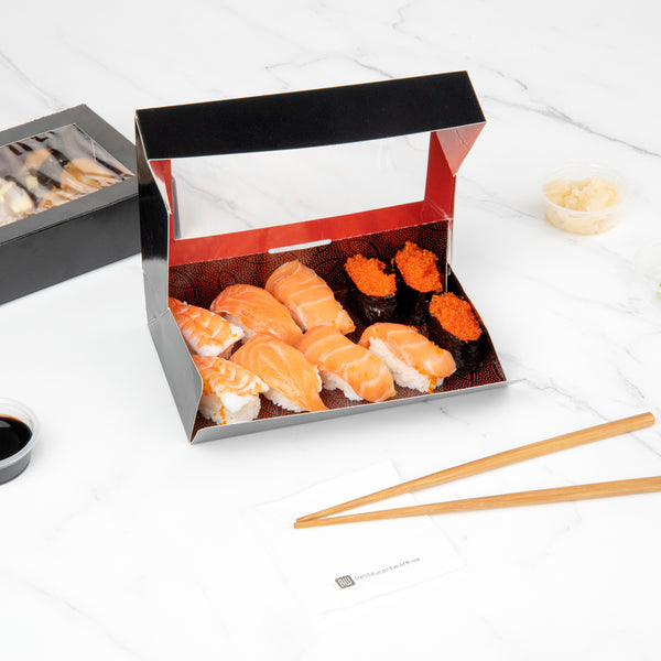 Elegantly display sushi with our Sakura Vision Black Paper Large Window Sushi Boxes. These sushi black boxes have premium paper construction for durability and ensure secure transport and handling of during delivery. Each maki box has a large rectangular window display to allow guests to see the fresh sushi inside, enticing their appetites. These sushi packaging boxes have an red ichthys design at the bottom interior to adds a splash of color to accent sushi rolls and nigiri. The black exterior of these paper sushi containers provides a sleek, sophisticated appearance. These nigiri boxes have a flat opening front to provide easy access for placing sushi inside and removing it to serve. To save time in setting up, these sushi boxes can be easily assembled. These rectangular window boxes measure 8 inches in length by 4.75 inches in width by 1.75 inches in height. Sold in a pack of 200.