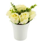 YELLOW PLASTIC ROSES IN PORCELAIN POT - 7 BLOOMS