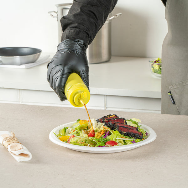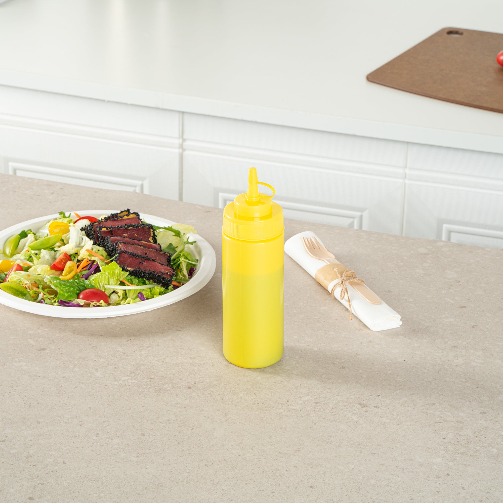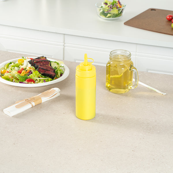 Our Sauce Tek 12-ounce Yellow Plastic Squeeze Bottle is the ideal solution for neatly storing and dispensing condiments. Made from food-safe plastic, this squeeze dispenser ensures your sauces are stored safely and without contamination. The included cap on this condiment dispenser prevents leaks and keeps contents fresh for longer periods. Featuring a wide mouth squeeze bottle design, this bottle facilitates easy refilling and cleaning after use. With a vibrant yellow finish, this refillable squeeze bottle is easily identified as a mustard bottle, even when stored with other condiments. Perfectly sized, this sauce bottle holds 12 ounces and measures 2.32 inches in diameter by 7.87 inches in height, fitting seamlessly into any kitchen setup. Sold in a 1 count box.