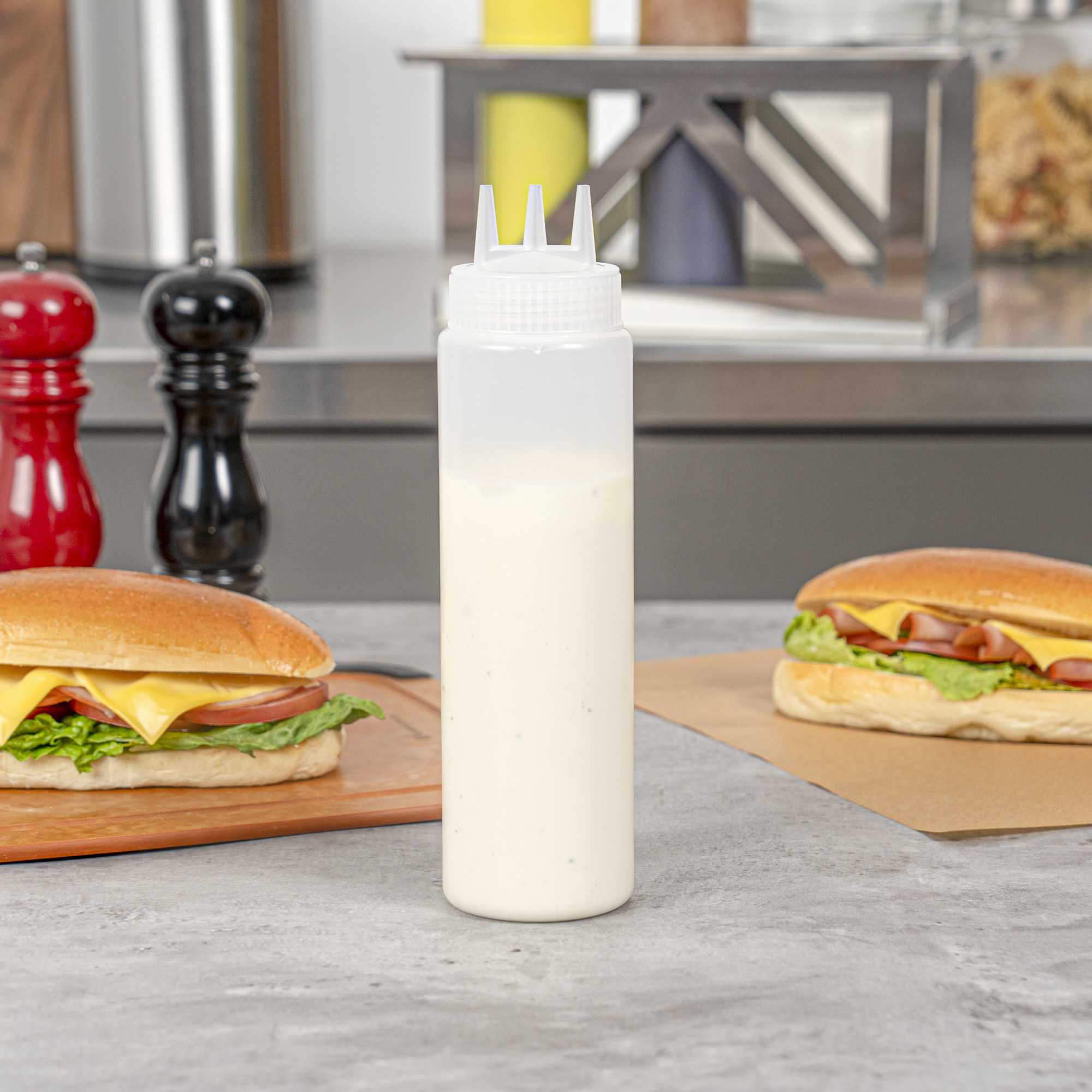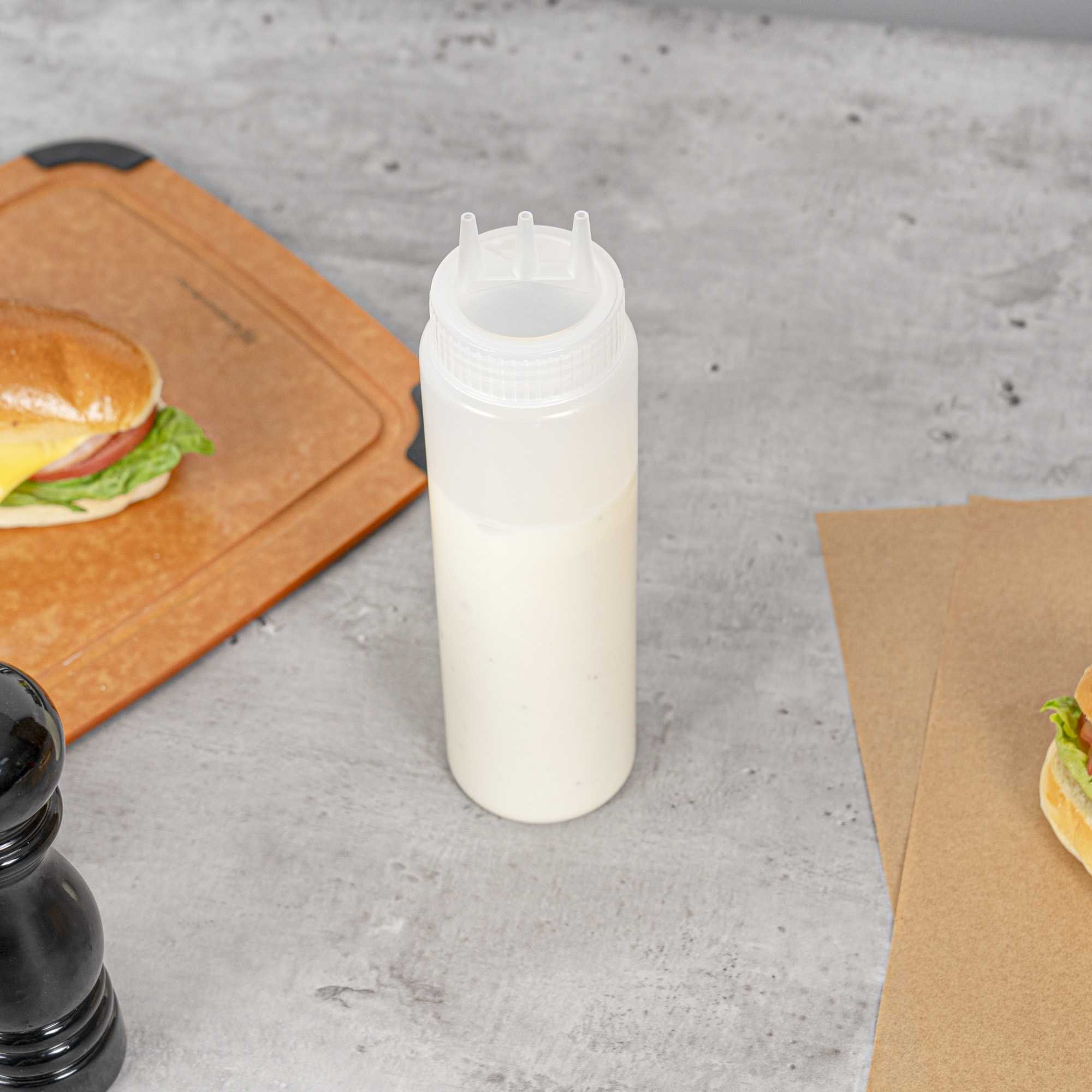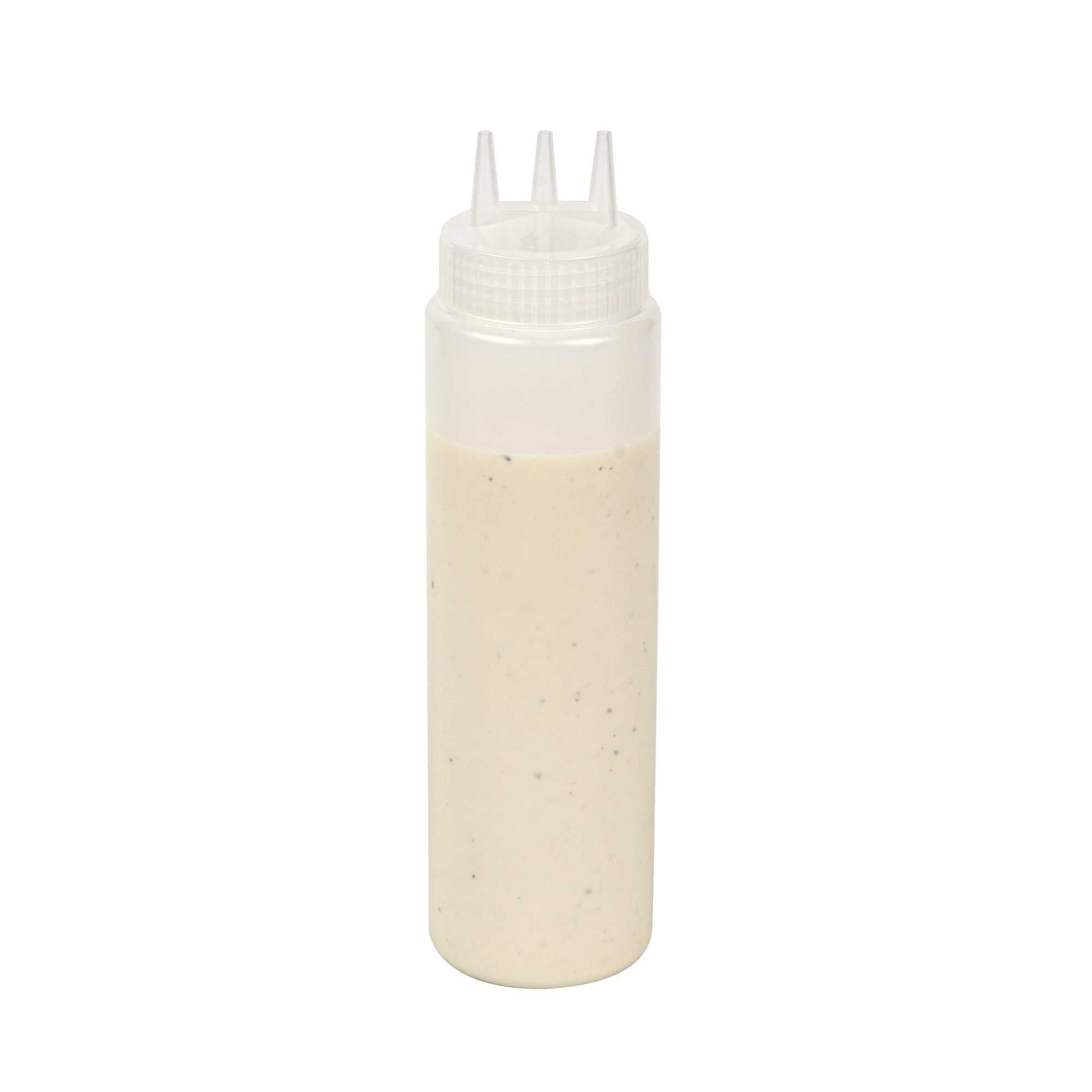 Efficiently drizzle condiments with our Sauce Tek 24-ounce Clear Plastic All-Purpose Squeeze Bottles. The built-in triple dispersion tip of these empty condiment bottles allows sauces to seamlessly flow out of each tip to quickly top off your entrees or side dishes. Crafted from premium plastic, these squeeze bottles provide a comfortable grip when squeezing out mayonnaise, oils, dressings, and other condiments. With a wide opening, these mayonnaise squeeze bottles can be quickly refilled during busy shifts at your restaurant, food truck, or food stand. Featuring a clear finish, these restaurant squeeze bottles display the colors of individual condiments which helps your employees quickly identify sauces while preparing dishes. These 24-ounce clear squeeze bottles measure 2.5 inches in diameter and are 9.75 inches tall. Sold in a 6 count box.