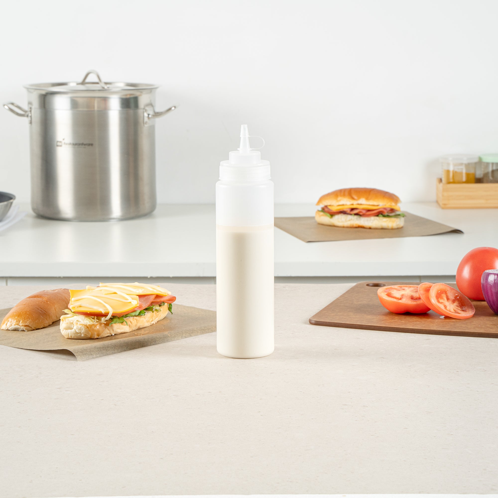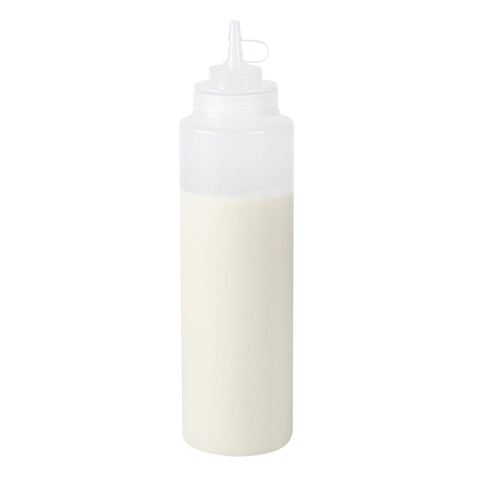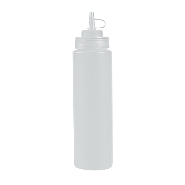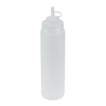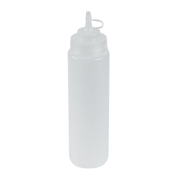 Efficiently store and dispense condiments with our Sauce Tek 24-ounce Clear Plastic Squeeze Bottle. This squeeze dispenser is crafted from food-safe plastic to ensure safe storage of your favorite sauces. Featuring an included cap, this condiment dispenser prevents leaks and keeps contents fresh for longer periods. The wide mouth squeeze bottle design facilitates easy refilling and cleaning after use, ensuring convenience in every kitchen. With a clear finish, this sauce bottle beautifully showcases the vibrant colors of your condiments, adding an attractive element to your food presentation. Boasting a generous 24-ounce capacity, this refillable squeeze bottle measures 2.6 inches in diameter by 10.24 inches in height, making it a versatile addition to any foodservice establishment. Sold in a 1 count box.