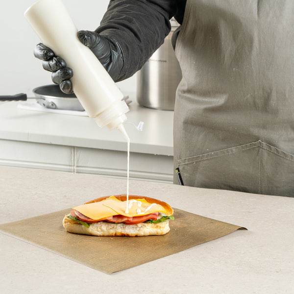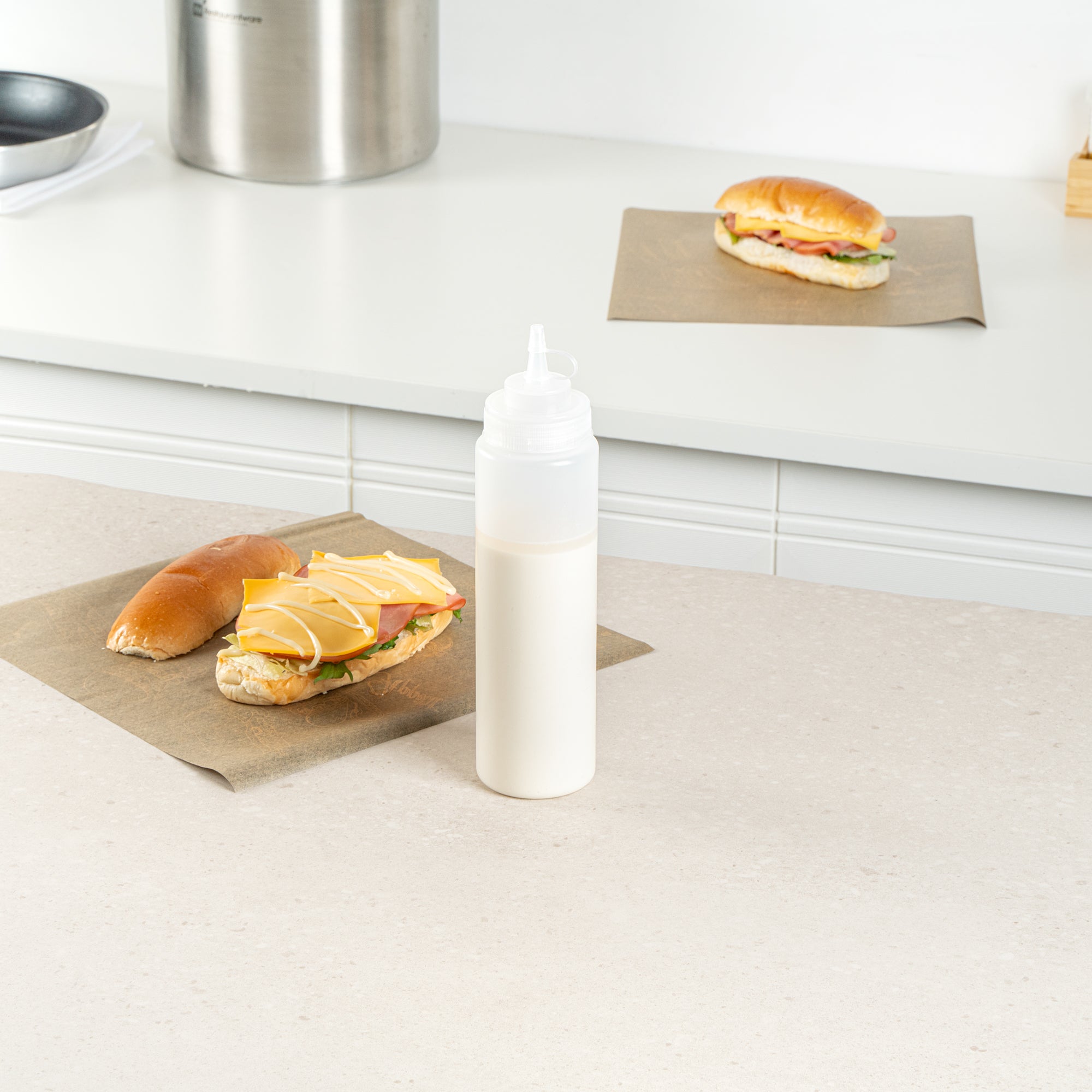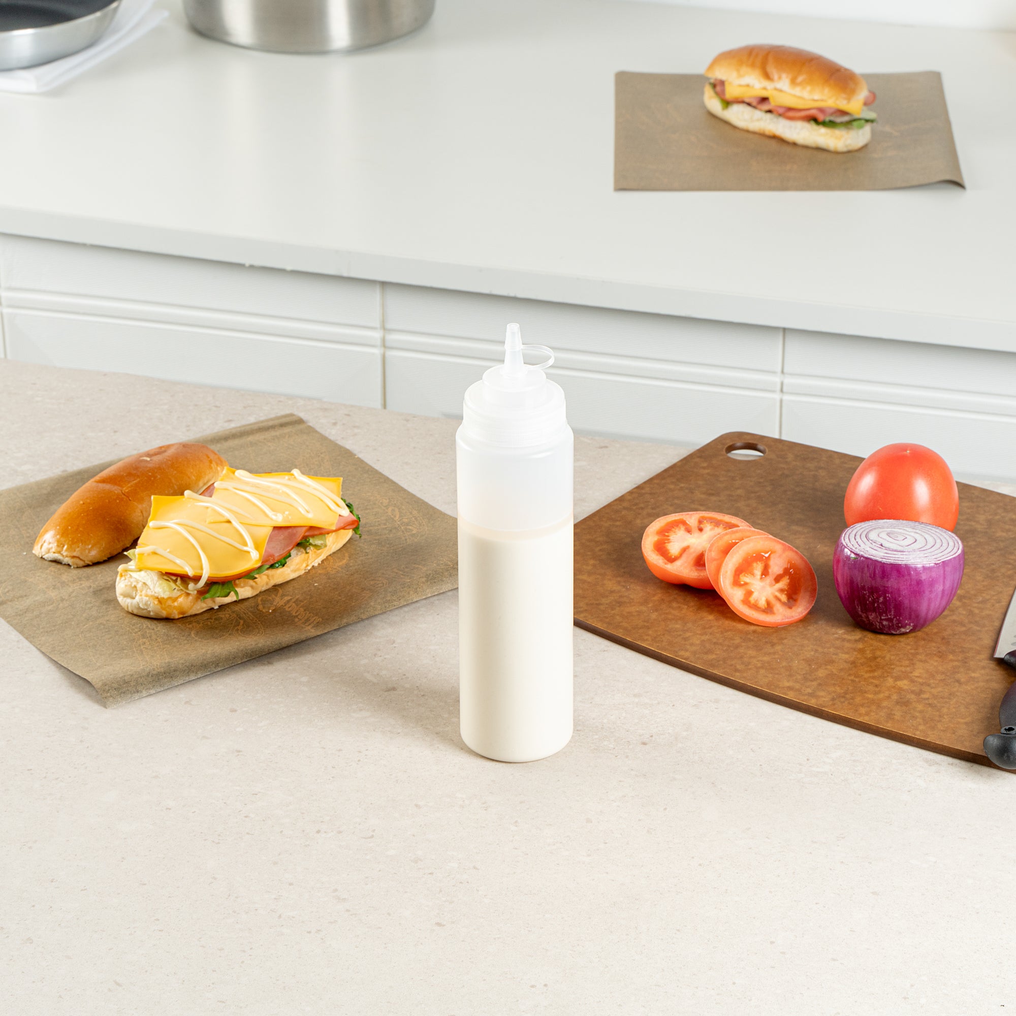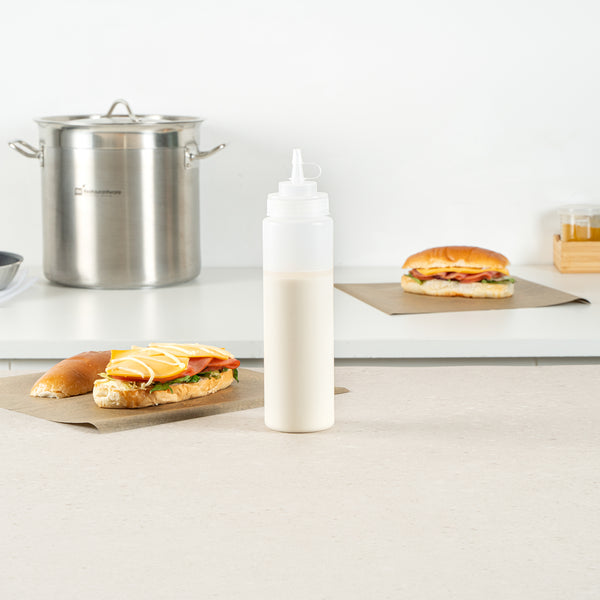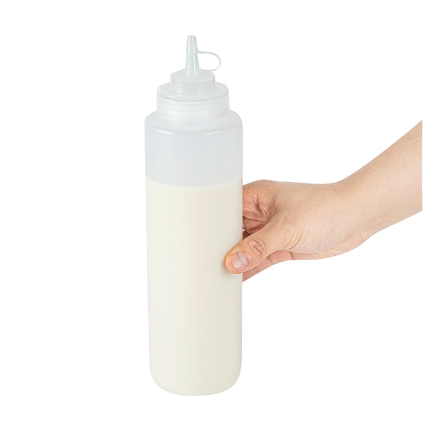 Efficiently store and dispense condiments with our Sauce Tek 24-ounce Clear Plastic Squeeze Bottle. This squeeze dispenser is crafted from food-safe plastic to ensure safe storage of your favorite sauces. Featuring an included cap, this condiment dispenser prevents leaks and keeps contents fresh for longer periods. The wide mouth squeeze bottle design facilitates easy refilling and cleaning after use, ensuring convenience in every kitchen. With a clear finish, this sauce bottle beautifully showcases the vibrant colors of your condiments, adding an attractive element to your food presentation. Boasting a generous 24-ounce capacity, this refillable squeeze bottle measures 2.6 inches in diameter by 10.24 inches in height, making it a versatile addition to any foodservice establishment. Sold in a 1 count box.
