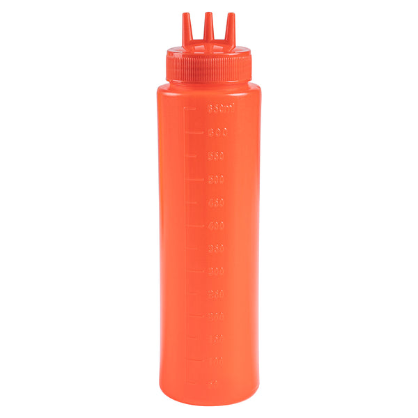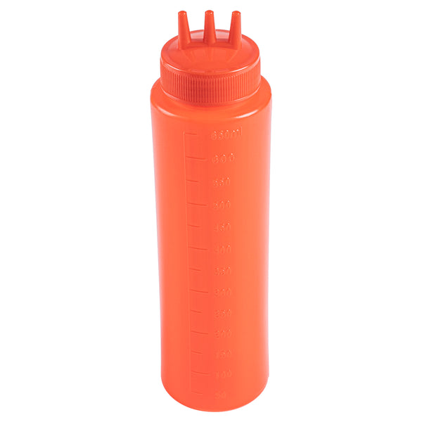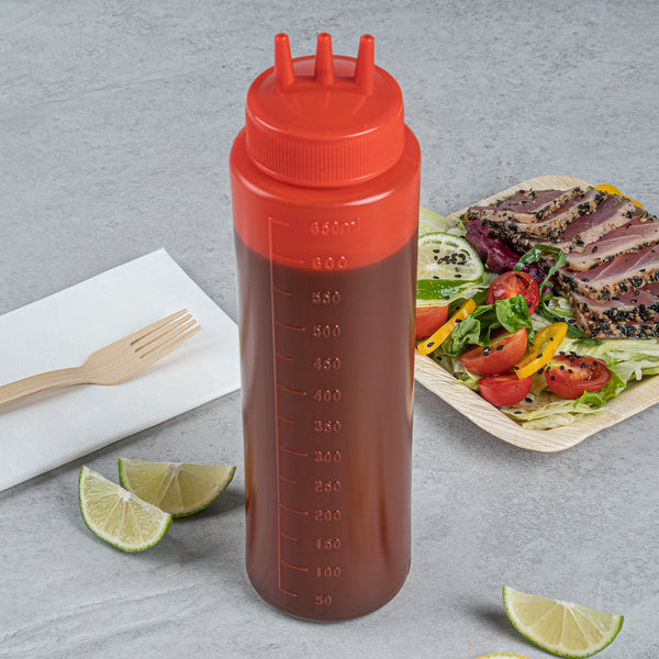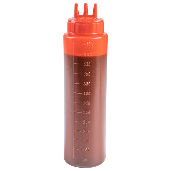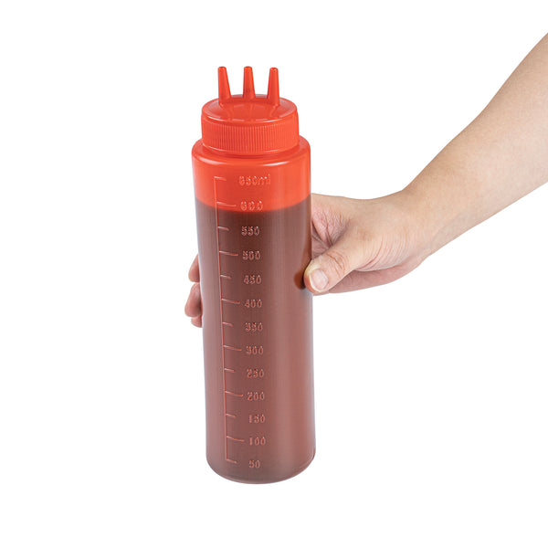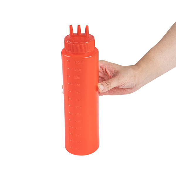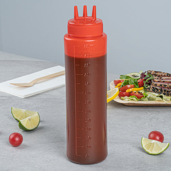 Quickly cover corn dogs, burgers, and sandwiches with sauce using our Sauce Tek 24-ounce Red Plastic Ketchup Squeeze Bottles. These plastic squeeze bottles feature a triple dispersion tip that is ideal for quickly and evenly coating meals with classic condiments. Made from premium plastic, these ketchup squeeze bottles are flexible yet durable to create a comfortable grip during use. These red squeeze bottles make it easy to identify where ketchup is stored in your restaurant, food truck, or other foodservice establishment. Designed with a wide mouth, these plastic squeeze bottles are easy to refill and clean during peak hours. The tight-fitting lid on these ketchup squeeze bottles prevents spills or leaks for mess-free dining. Measuring 2.5 inches in diameter by 9.75 inches in height, these red squeeze bottles hold up to 24 ounces of your favorite condiments. Shipped in a 6 count box.