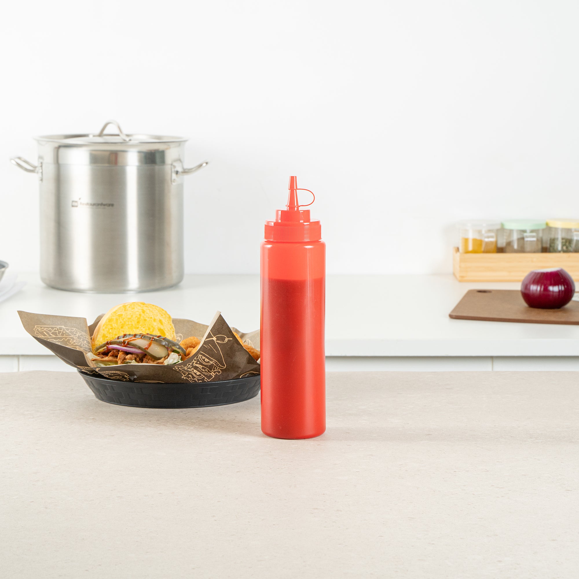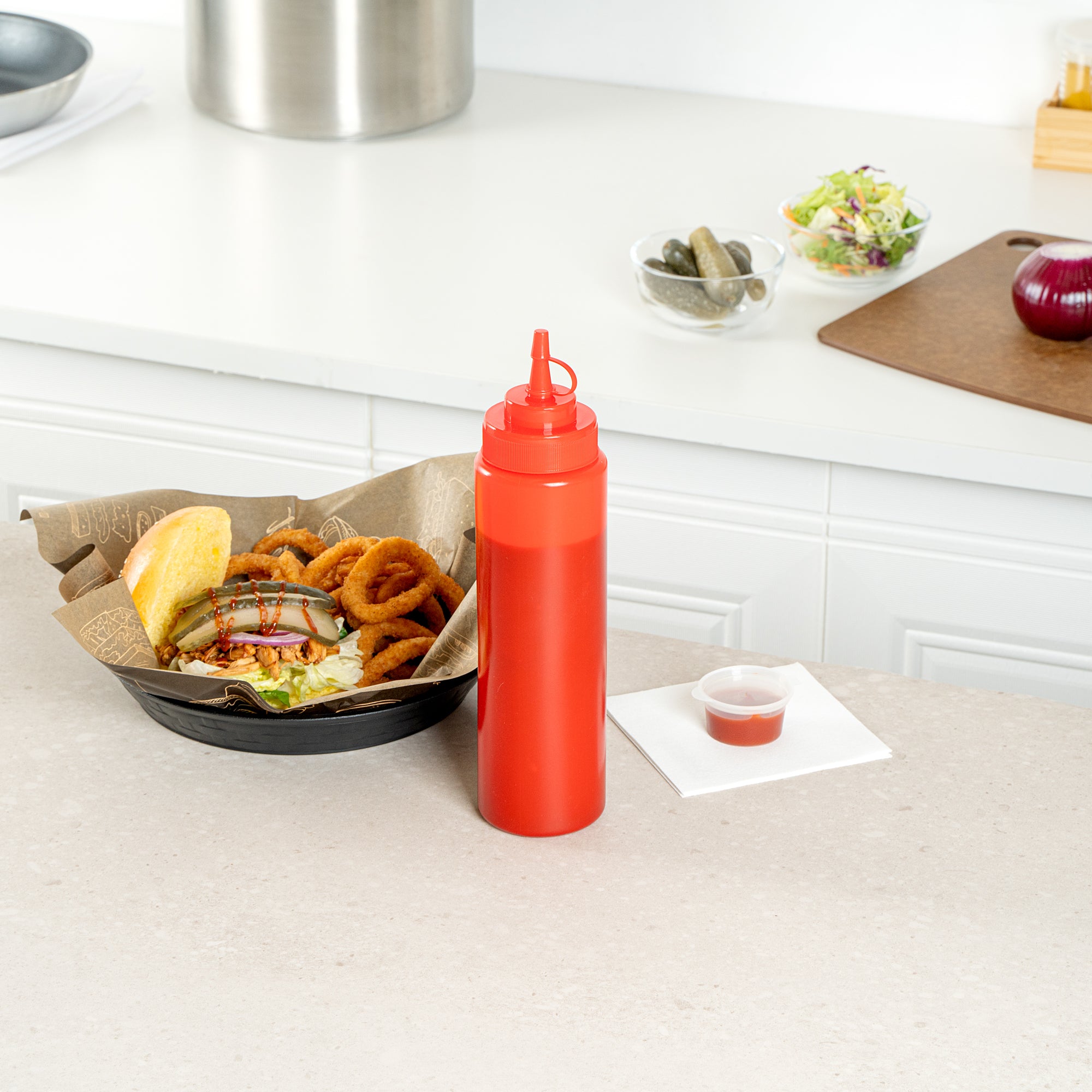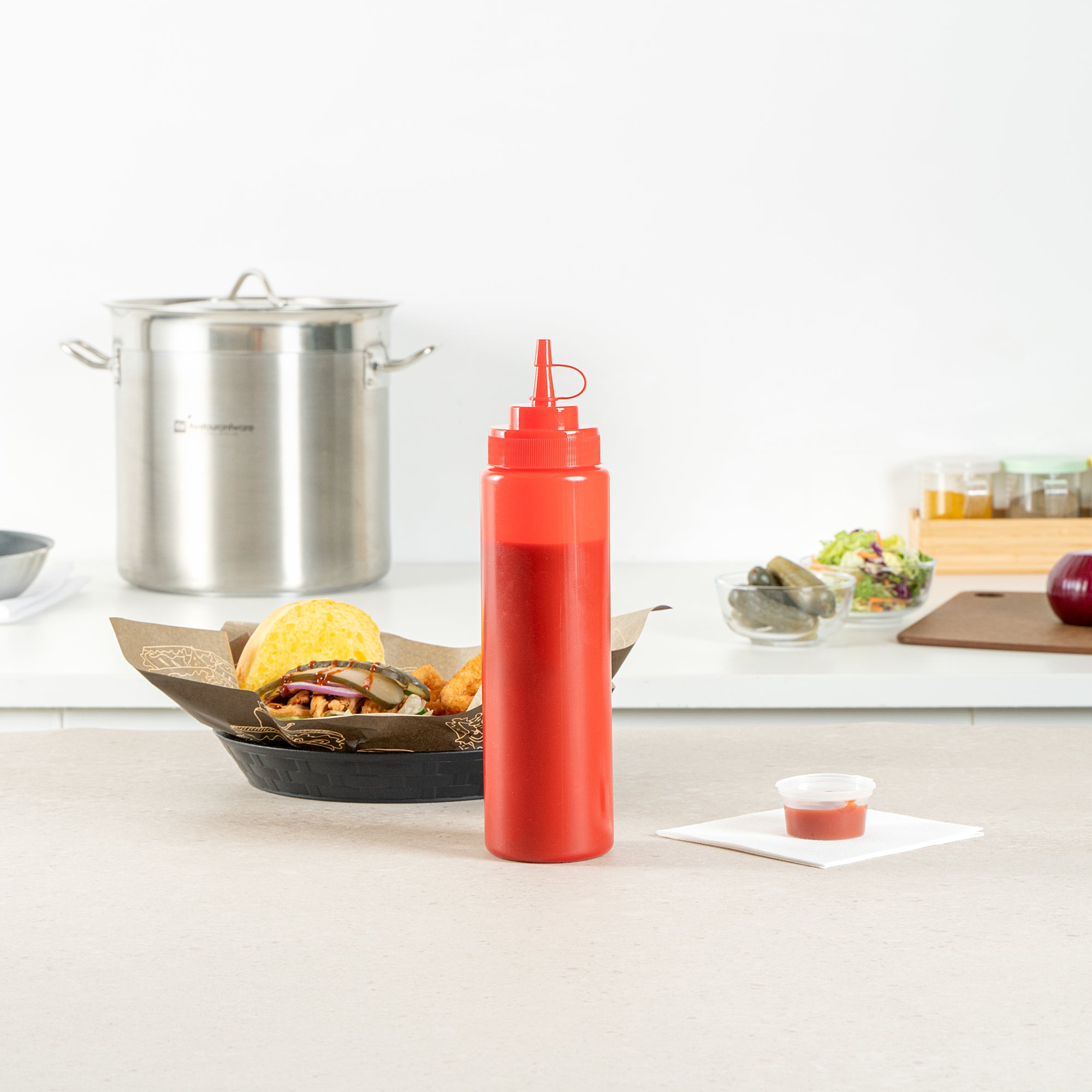 Enhance your kitchen efficiency with our Sauce Tek 24-ounce Red Plastic Squeeze Bottle. This squeeze dispenser is crafted from food-safe plastic, making it perfect for storing a variety of condiments. Featuring an included cap, this condiment dispenser prevents leaks and keeps its contents fresh. The wide mouth squeeze bottle design facilitates easy refilling and cleaning after use. Designed with a striking red finish, this sauce bottle is easily recognizable as ketchup bottles. With a capacity of 24 ounces, this refillable squeeze bottle measures 2.6 inches in diameter by 10.24 inches in height. Sold in a 1 count box.