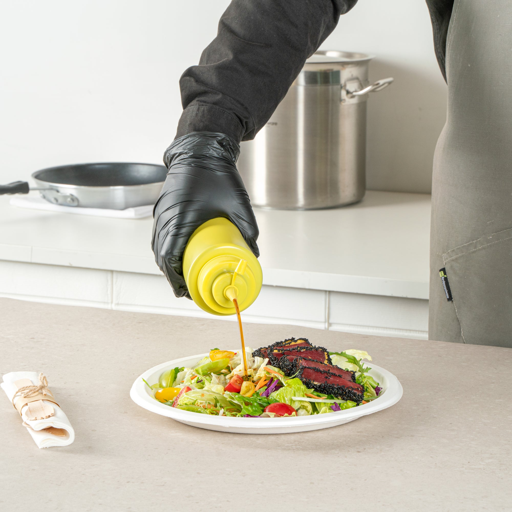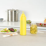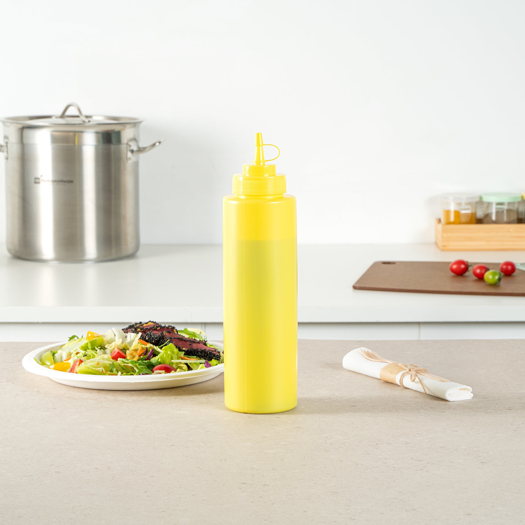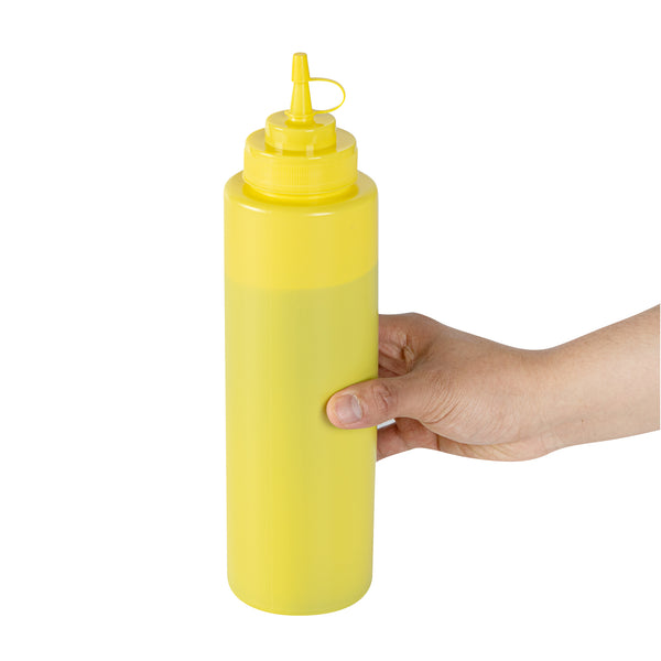 Introducing our Sauce Tek 32-ounce Yellow Plastic Squeeze Bottle, the ultimate solution for storing and dispensing condiments efficiently. This squeeze dispenser is crafted from food-safe plastic, ensuring your sauces and dressings remain fresh and uncontaminated. Equipped with an included cap, this condiment dispenser prevents leaks, maintaining the integrity of your kitchen or dining space. The wide mouth squeeze bottle design allows for easy refilling and hassle-free cleaning, saving you valuable time during busy service hours. With its bright yellow finish, this refillable squeeze bottle is easily recognized as a mustard container, preventing mix-ups with other condiments. Measuring 3.07 inches in diameter by 11.42 inches tall, this sauce bottle holds an impressive capacity of 32 ounces, providing ample space for your favorite dressings or condiments. Sold in a 1 count box.