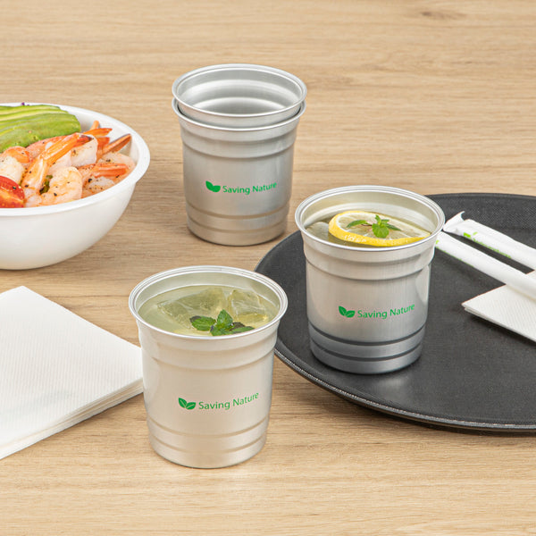 Enhance your beverage service with eco-friendly, reusable drinkware. The Saving Nature Recyclable Reusable Aluminum Tumbler boasts a dishwasher-resistant design that ensures each tumbler emerges spotless and gleaming, reducing cleaning time and enhancing presentation. This anodized aluminum cup features easy stacking and transport, streamlining your beverage service and maximizing storage efficiency for busy bars and cafes. Made from recyclable aluminum, this silver tumbler is lightweight yet durable, measuring 3.5 inches in diameter and 3.1 inches in height, and offers a generous 10-ounce capacity. Its food-safe, BPA-free construction appeals to health-conscious patrons and ensures safe usage for both cold and hot beverages. By eliminating the need for single-use plastics, this dishwasher-safe aluminum cup is perfect for serving water, soda, or any beverage while promoting sustainability. Each order includes 100 Saving Nature Recyclable Reusable Aluminum Tumblers.