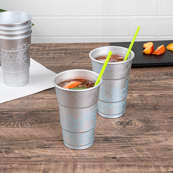 Enhance your beverage service with a visually striking twist. Saving Nature Color-Changing Aluminum Cups transform any drink presentation with their captivating color-changing feature, creating an eye-catching visual effect that delights guests. Crafted from robust aluminum, these 3.5-inch by 5.5-inch metal cups are designed to keep your drinks refreshingly cool, making them perfect for serving chilled cocktails or sodas. Their cold food-friendly design ensures that beverages maintain their optimal freshness, while the freezer-safe capability allows for convenient make-ahead drink prep, ideal for busy service environments. The reusable cups are also recyclable, supporting sustainable practices in your establishment. Elevate your drinkware collection with these innovative and stylish solutions, perfect for any occasion. Each order includes 48 Saving Nature Color-Changing Aluminum Cups.