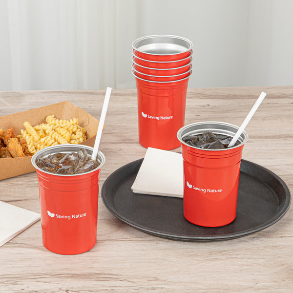 Serve drinks sustainably with stylish red aluminum tumblers. The Saving Nature Recyclable Aluminum Tumbler, with dimensions of 3.9 inches by 3.9 inches by 5 inches, is crafted from 100% recyclable aluminum, offering a lightweight, durable alternative to single-use plastics. Dishwasher-safe, these tumblers ensure a spotless and gleaming finish, making them the perfect anodized aluminum cup for busy foodservice establishments. The easy-stack feature simplifies transport and storage, saving valuable back-of-house space. Ideal for versatile beverage serving, these tumblers are cold and hot food friendly, ensuring seamless service of drinks from iced coffees to hot teas. Use these cold drink cups to enhance your beverage presentation while supporting eco-friendly practices. Each order includes 100 Saving Nature Recyclable Aluminum Tumblers.