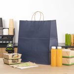 The rectangular base of these paper bags with handles provides a flat surface that evenly distributes weight to reliably hold heavy items without tearing. Open-top design for easy access!