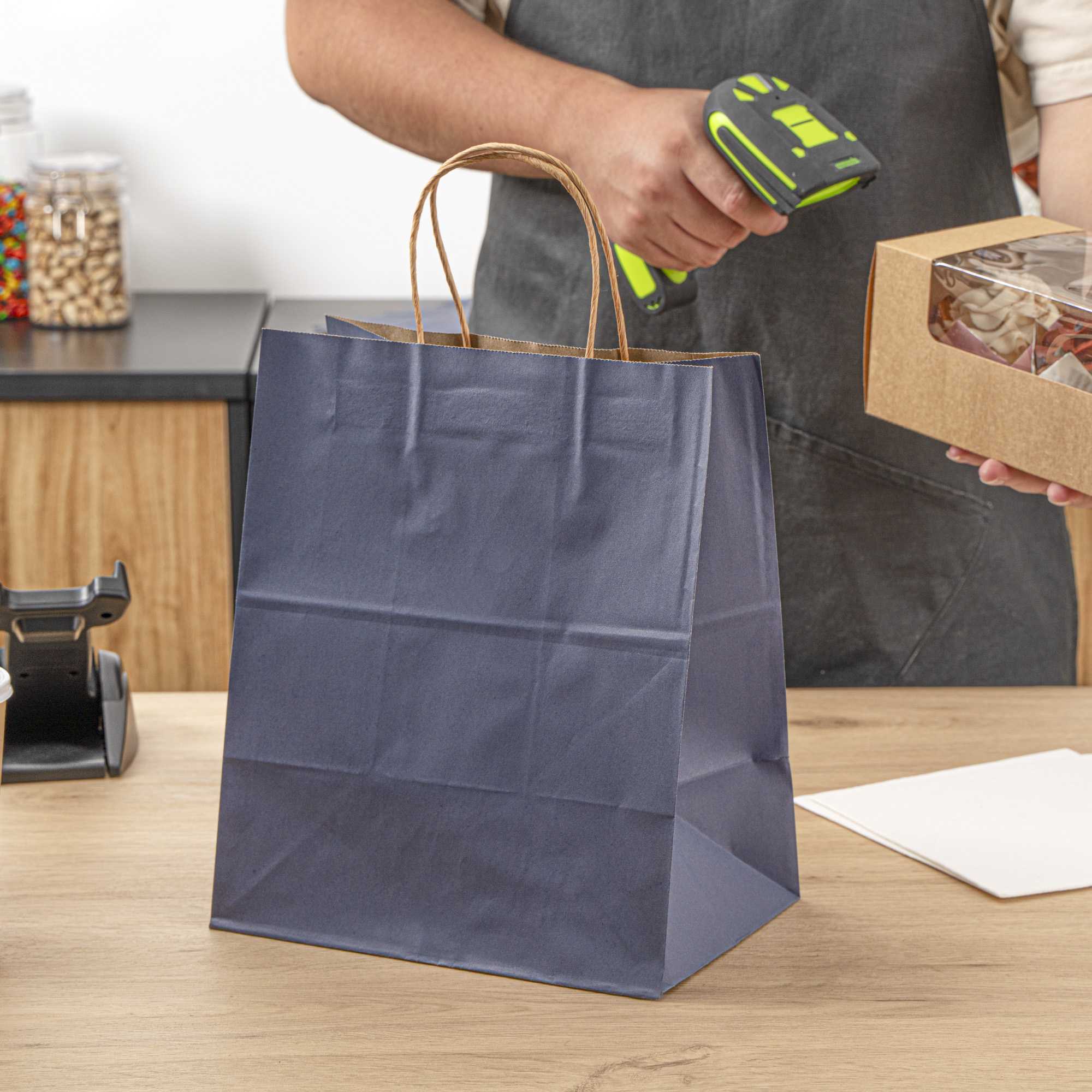 The rectangular base of these paper bags with handles provides a flat surface that evenly distributes weight to reliably hold heavy items without tearing. Open-top design for easy access!