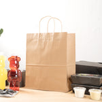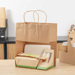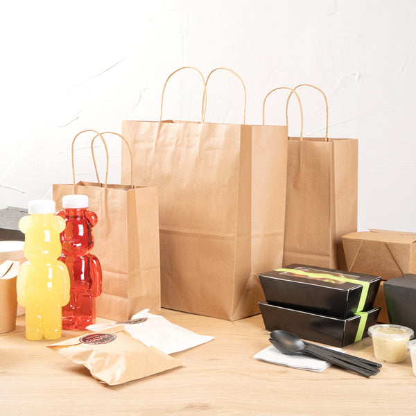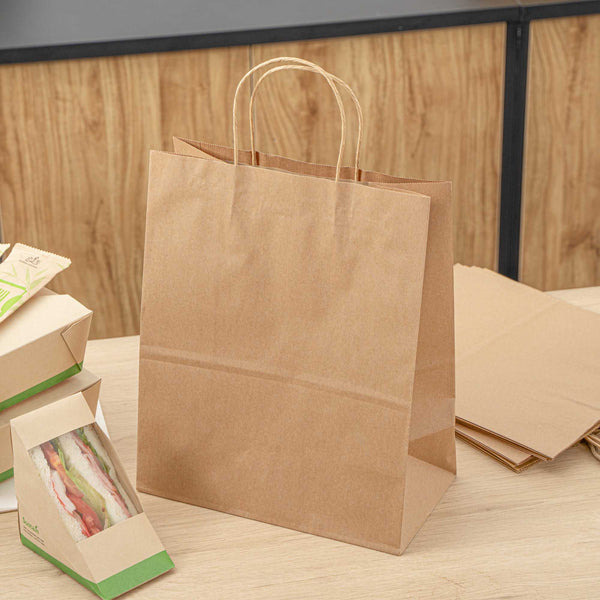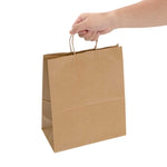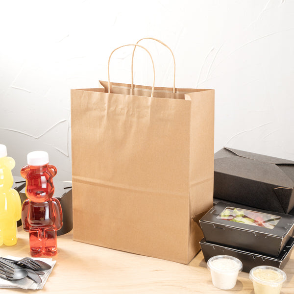 Pack up orders easily with our Saving Nature Kraft Paper Retail Bags. These paper gift bags have built-in handles so customers can effortlessly take their orders on the go. Constructed from 90 gsm kraft paper, these brown paper bags are strong and sturdy for holding items without having them fall through the bottom. Designed with a kraft finish, these grocery paper bags do not contain bleach. With a stand-open structure, these paper grocery bags can be opened upright to easily pack up merchandise in an efficient manner. For a sustainable cleanup at your foodservice establishment, these takeaway paper bags are recyclable and commercially compostable. These paper carry bags measure 10.25 inches long by 5.5 inches wide by 12.5 inches tall. Sold in a 100 count box.