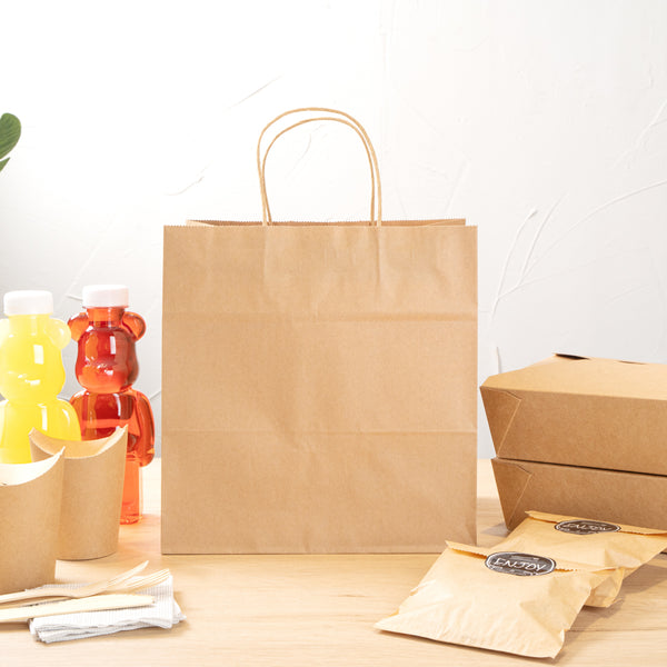 Pack up your take out with our Saving Nature Kraft Paper Retail Bags. Great for restaurants or bakeries, these paper bags have handles to easily take multiple items on the go. Made from 90 gsm kraft paper, these takeaway bags are strong and sturdy for carrying hefty meals. With a kraft finish, these grocery paper bags do not contain bleach, making them safe for food. Featuring a stand-open structure, these paper bags stand upright to make it easy to fill bags while wrapping up merchandise. These grocery paper bags are recyclable and commercially compostable for a sustainable cleaning process at your establishment. Measuring 10.25 inches long by 7.75 inches wide by 10.5 inches tall, these commercially compostable paper bags are perfect for stylishly packaging take out. Sold in a 100 count box.