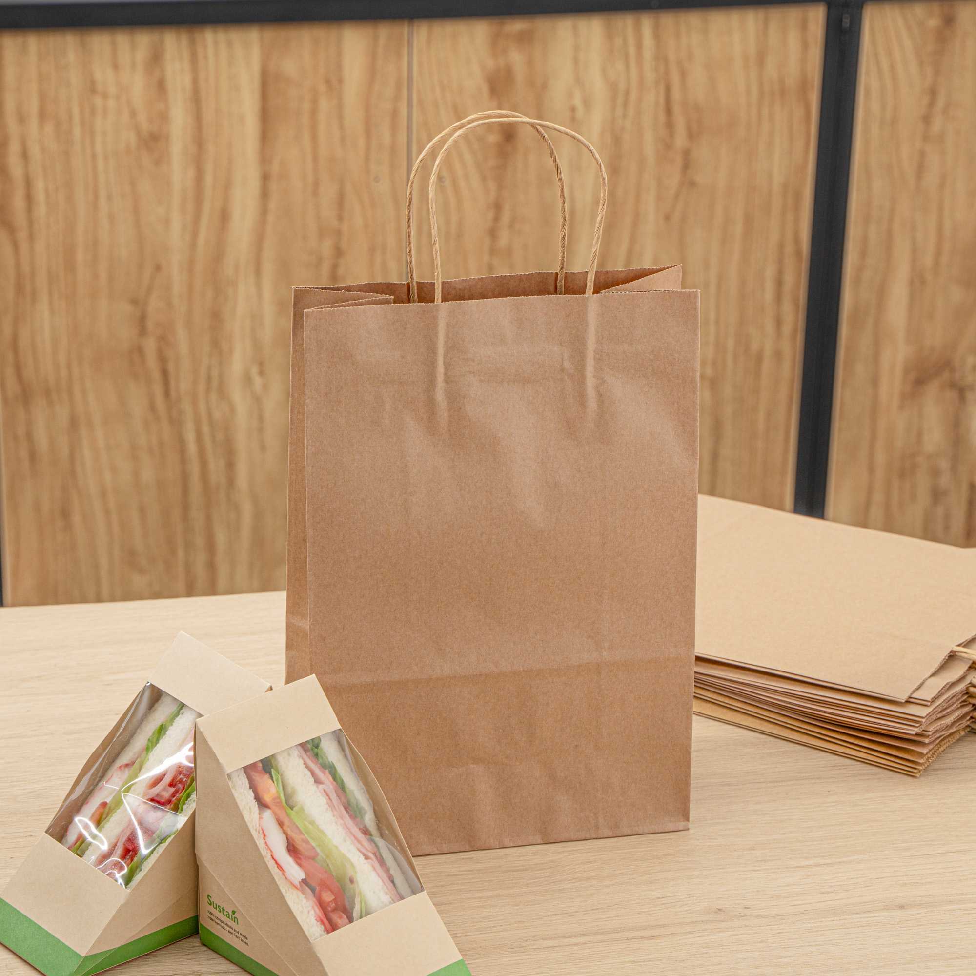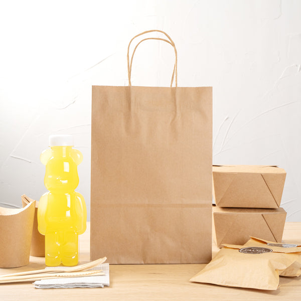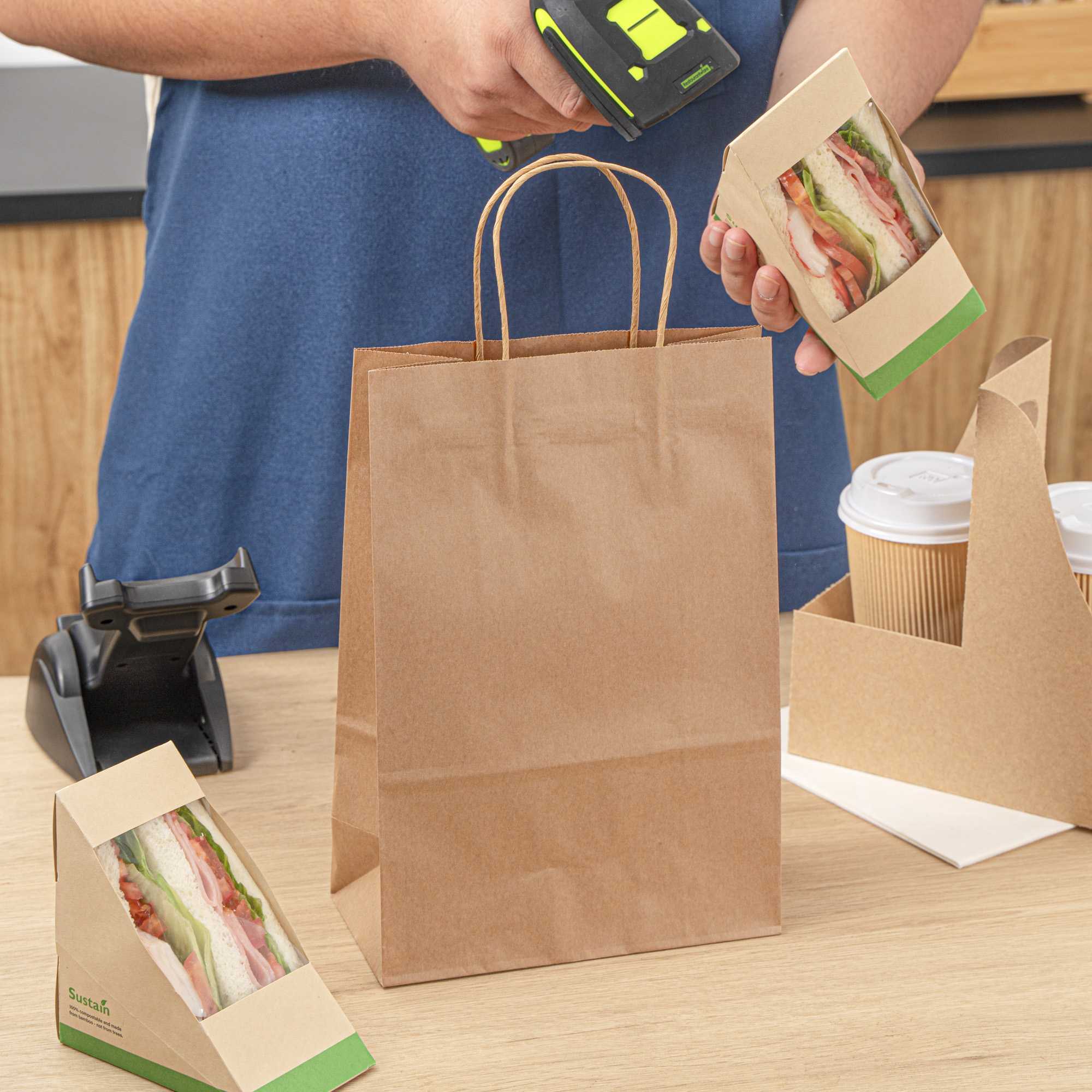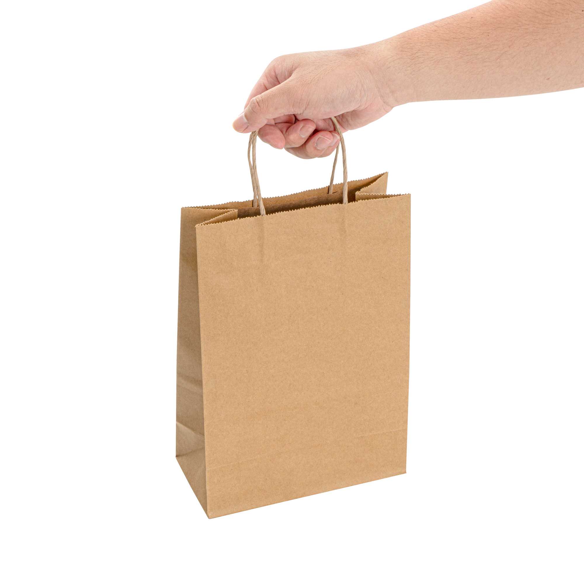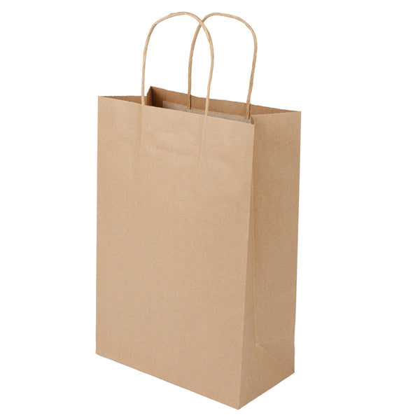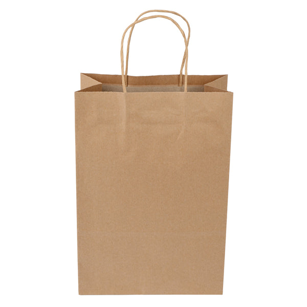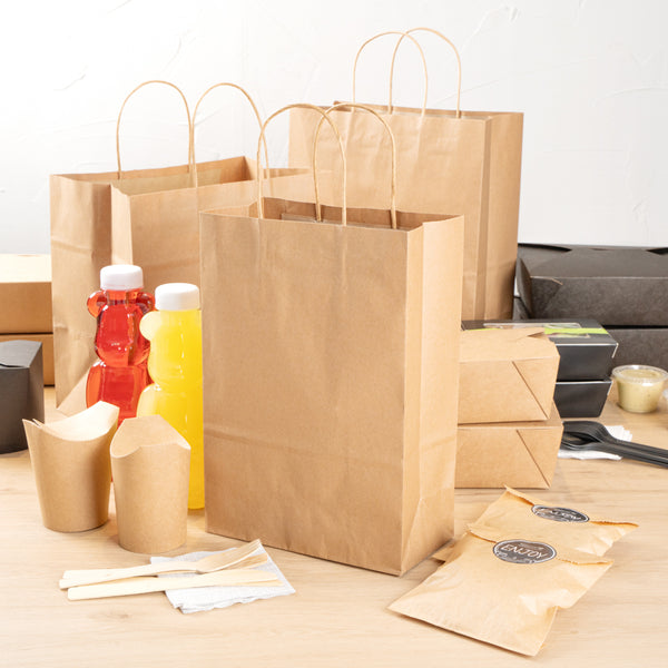 Pack up retail items with our Saving Nature Kraft Paper Retail Bags. To easily take multiple meals on the go, these paper shopping bags have built-in handles. Made from 90 gsm kraft paper, these brown takeaway bags are strong and sturdy for sustaining the weight of hefty fare. Featuring a kraft finish, these kraft gift bags are made without bleach to avoid food contamination. The stand-open structure of these brown take away bags allows you to easily stack boxes inside when wrapping up orders. To reduce your carbon footprint at your restaurant or bakery, these paper gift bags are recyclable and commercially compostable. These paper grocery bags measure 7.75 inches long by 4 inches wide by 11.5 inches tall. Sold in a 100 count box.
