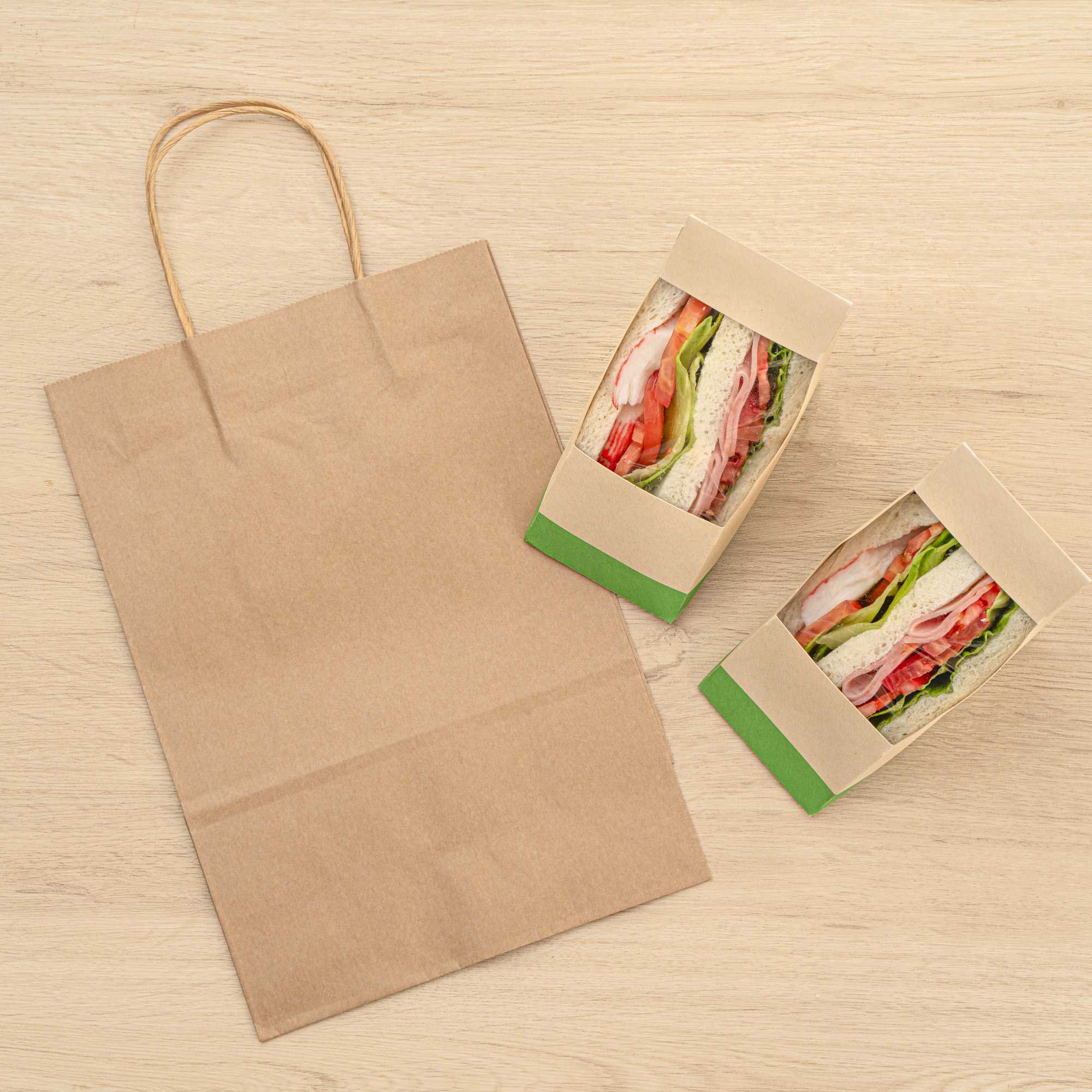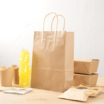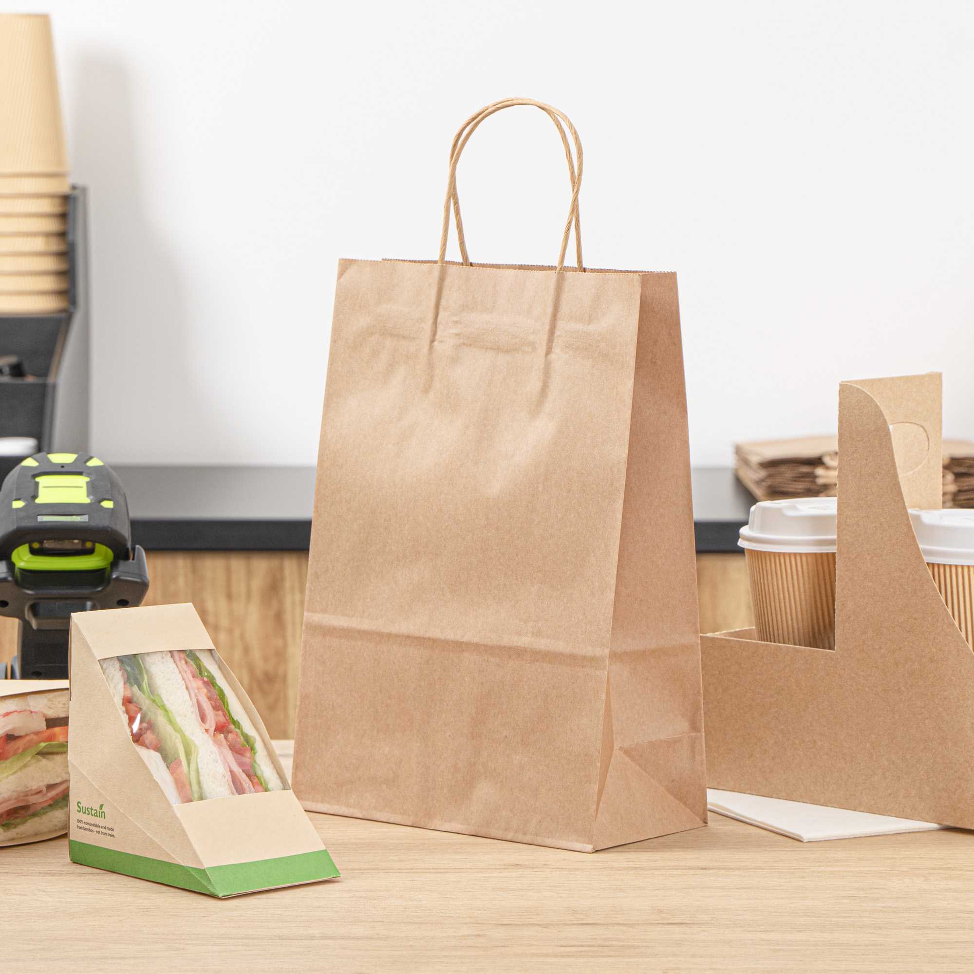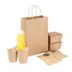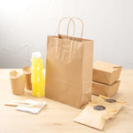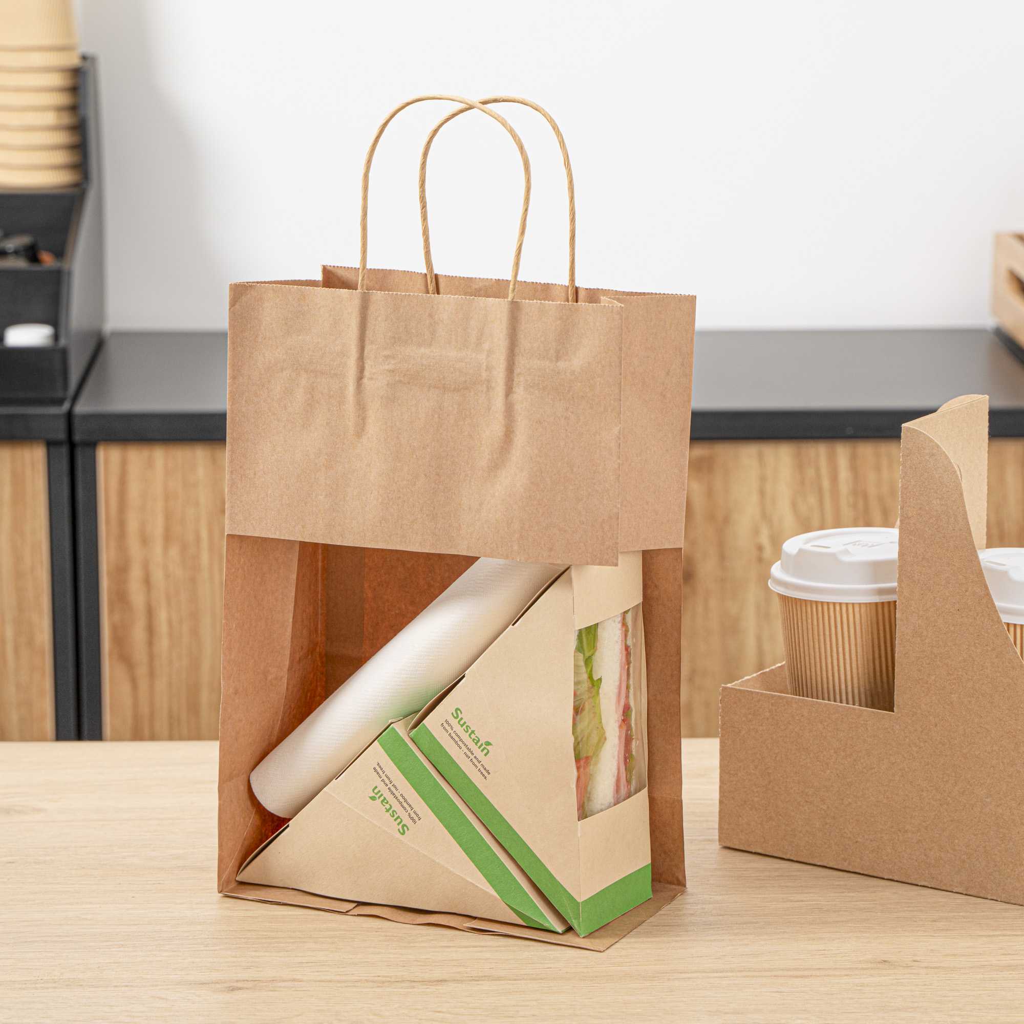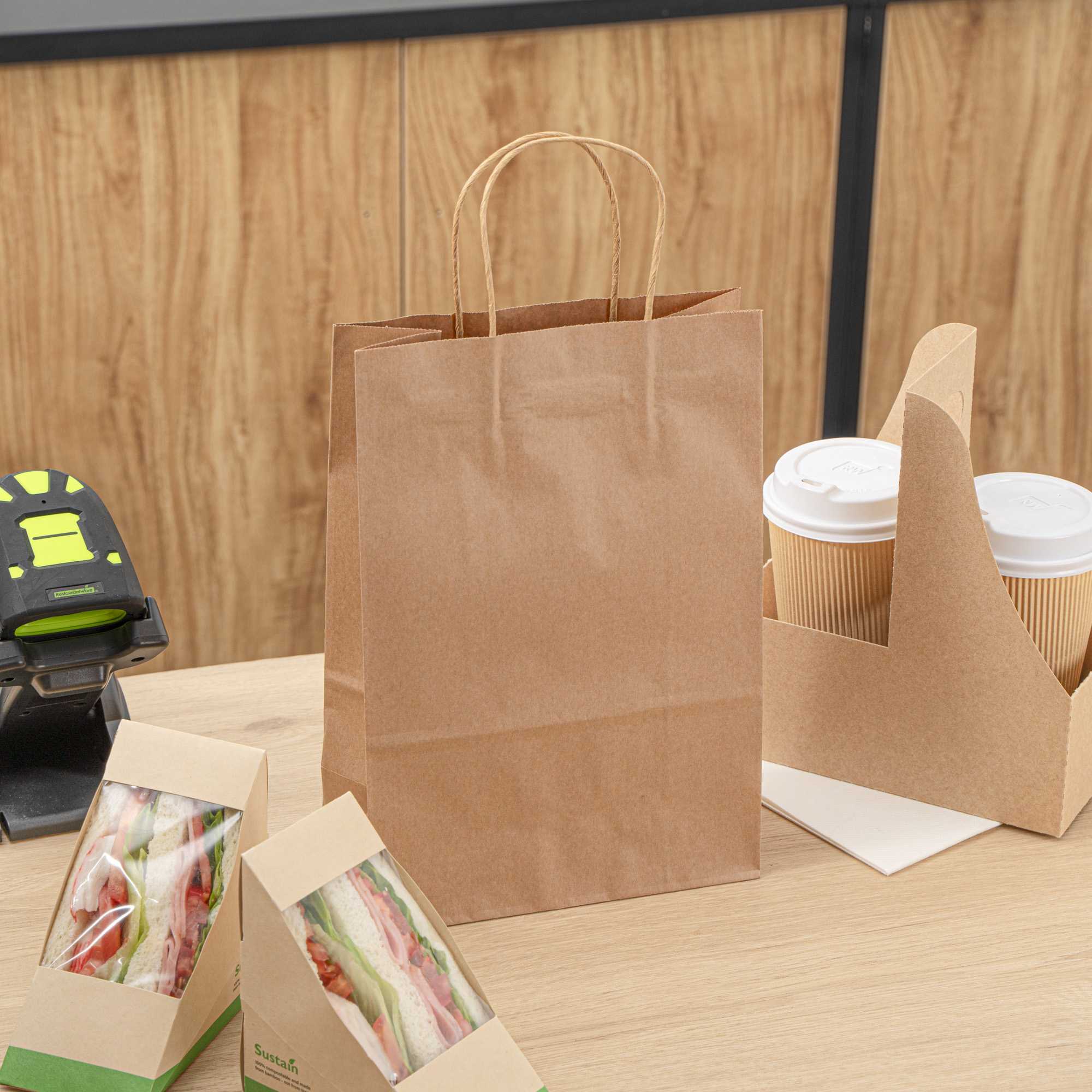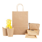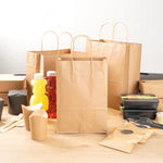 Pack up retail items with our Saving Nature Kraft Paper Retail Bags. To easily take multiple meals on the go, these paper shopping bags have built-in handles. Made from 90 gsm kraft paper, these brown takeaway bags are strong and sturdy for sustaining the weight of hefty fare. Featuring a kraft finish, these kraft gift bags are made without bleach to avoid food contamination. The stand-open structure of these brown take away bags allows you to easily stack boxes inside when wrapping up orders. To reduce your carbon footprint at your restaurant or bakery, these paper gift bags are recyclable and commercially compostable. These paper grocery bags measure 7.75 inches long by 4 inches wide by 11.5 inches tall. Sold in a 100 count box.