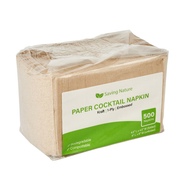 Easily wipe off any mess using our Saving Nature Square Kraft Paper Cocktail Napkins. Made from premium kraft paper, these square napkins do not tear easily, even when used to clean liquid mess. To avoid the need to use multiple napkins, these 1-ply table napkins last throughout your meal. Embossed with snowflake designs, these cocktail napkins beautify the look of your tables at restaurants. To speed up the cleaning process, these napkins for restaurants can be disposed of after use, as they are recyclable. These kraft paper napkins complement your table settings with their subtle finish. Pre-folded in ¼ style, these commercially compostable paper napkins with design do not occupy much space on your tables. These square paper napkins measure 9 inches in length by 9 inches in width when unfolded and 4.5 inches in length by 4.5 inches in width when folded. Shipped in a 500 count box.