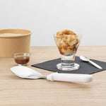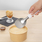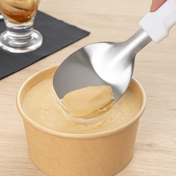Efficiently scoop hard or soft ice cream with ease. The Scoop Haus Stainless Steel Precision Head Ice Cream Scoop features a precision-rounded head that ensures even ice cream scoops, making it an essential tool for dessert stations. Crafted from stainless steel, this ice cream scoop provides exceptional strength and corrosion resistance, enhancing its longevity in high-traffic kitchens. The food-contact safe handle protects users and food, ensuring safety during every use. Its sleek, 9.8-inch by 2.9-inch design seamlessly works with standard ice cream containers for effortless serving, offering versatility as an ice cream spade and more. The clean white handle design adds a modern aesthetic, complementing any kitchen setting. Elevate your serving experience by incorporating this durable, hard ice cream scoop into your operations. Each order includes 40 Scoop Haus Stainless Steel Precision Head Ice Cream Scoops.