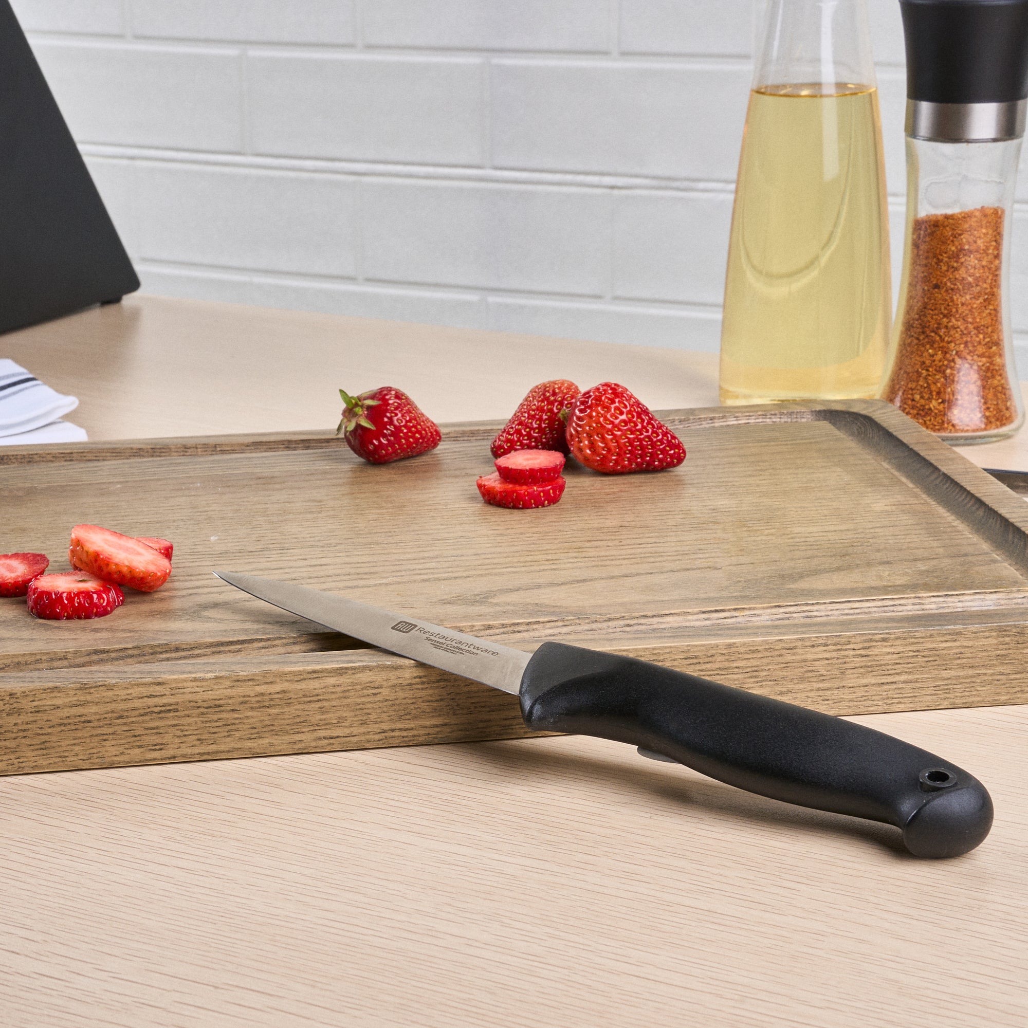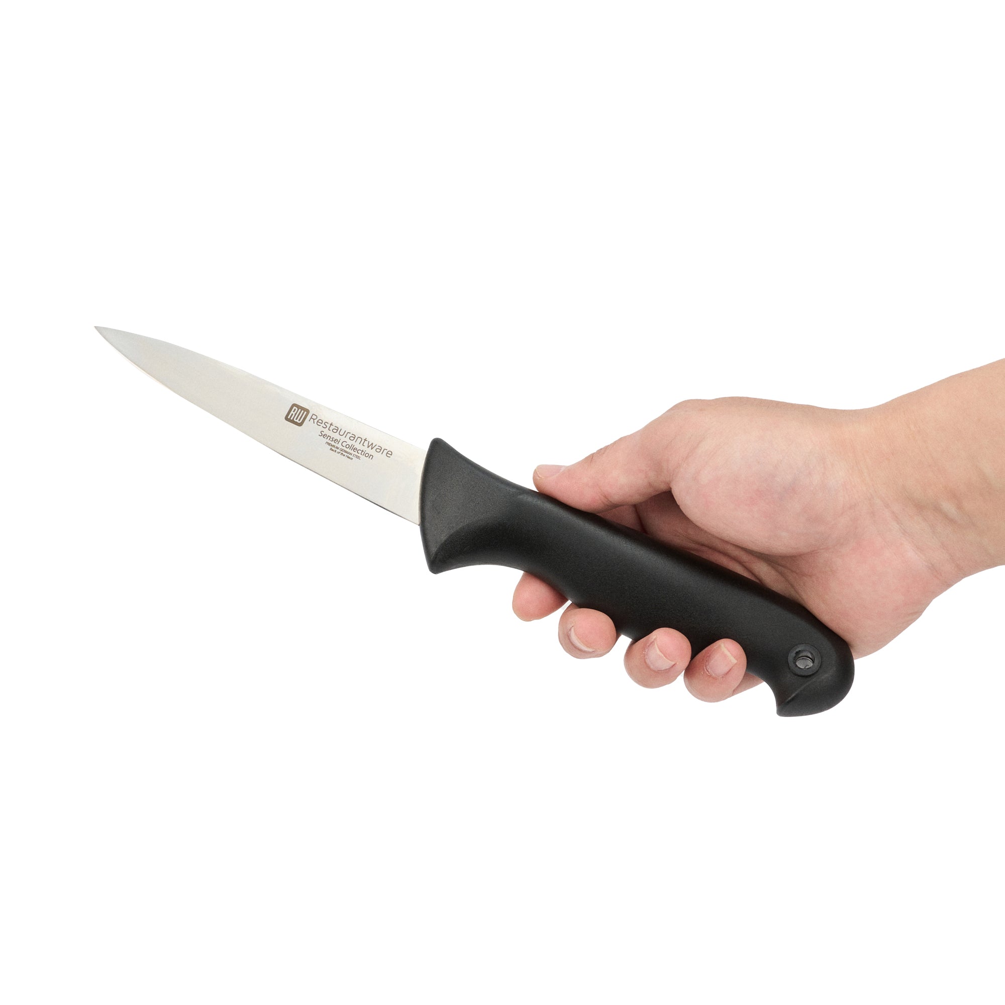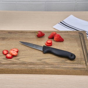 These kitchen knives feature ergonomic plastic handle that provide a secure grip while prepping foods. Designed for optimal comfort while performing multiple tasks.