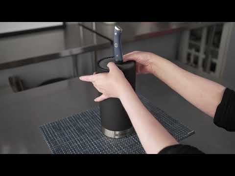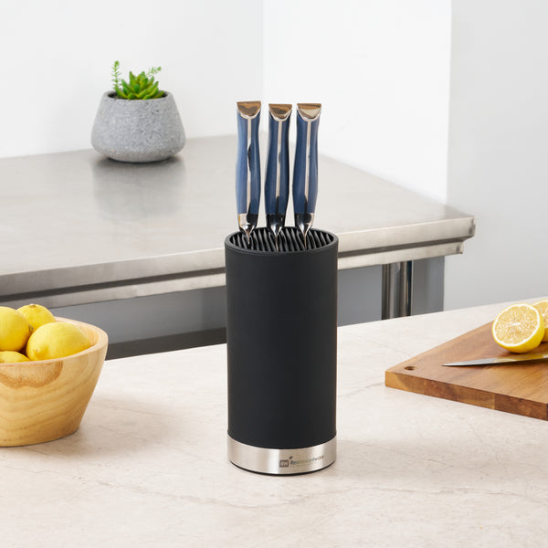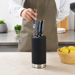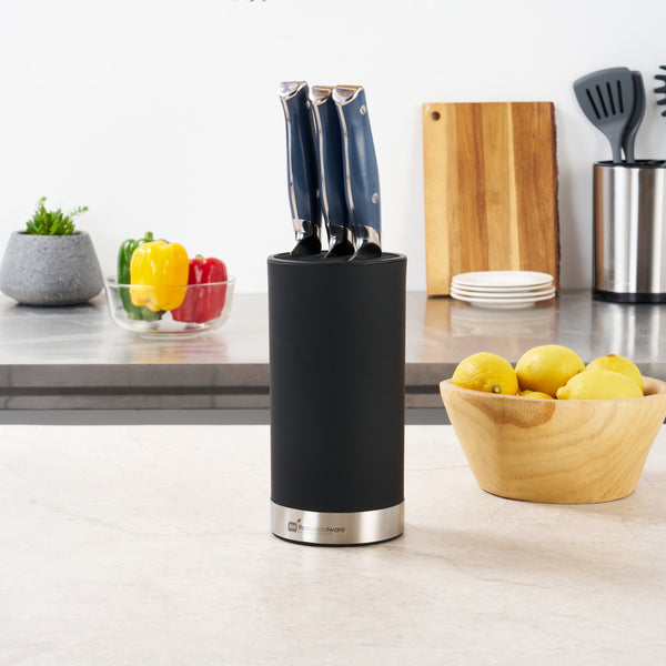 Safely store your kitchen knives while keeping them easily accessible with our Sensei Round Black Knife Block. The slotted top design of this kitchen knife block insert securely holds up to 9 knives without scratching the blades. Plus, the soft touch insert is conveniently removable, providing you with an easy way to thoroughly clean the insert after service hours. With a compact design, this countertop knife block keeps all of your cutlery in one location and maximizes counter space to provide you with plenty of room to cut, slice, or dice ingredients. Crafted from durable plastic with a stainless steel band, this black knife effortlessly complements the color of your kitchen appliances and is built to maintain its exceptional design. This knife holder measures 4.25 inches in diameter by 9 inches in height. Shipped in a 1 count box.