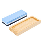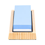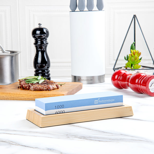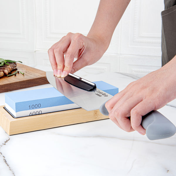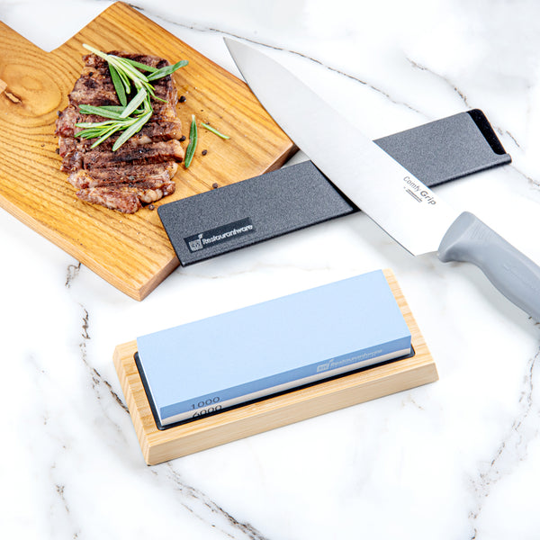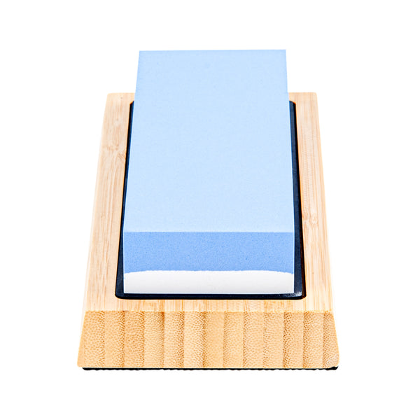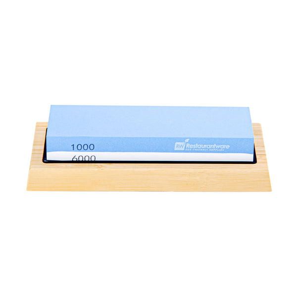 Keep your knives in prime condition with our Sensei Whetstone Knife Sharpening Set. Featuring a whetstone knife sharpener, a bamboo base, and an angle guide, this knife sharpening set has all the tools you need to keep your knives in good shape. The non-slip bamboo base of this whetstone knife sharpening set helps keep it in place during use to prevent potential accidents. This knife sharpening stone set has a two-side grit for a full sharpening process; the 1000 side allows for a more classic and basic sharpening, while the 6000 side is used for super fine finishing. Including an angle guide, this sharpening set lets you expertly sharpen various dull knives such as steak knives, sushi knives, or butcher knives. Made from strong corundum, the sharpening stone in this whetstone set is durable. Measuring 8.25 inches long by 3.5 inches wide by 2.25 inches tall, this whetstone knife sharpening set is sold in a 1 count box.