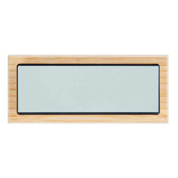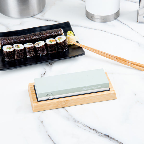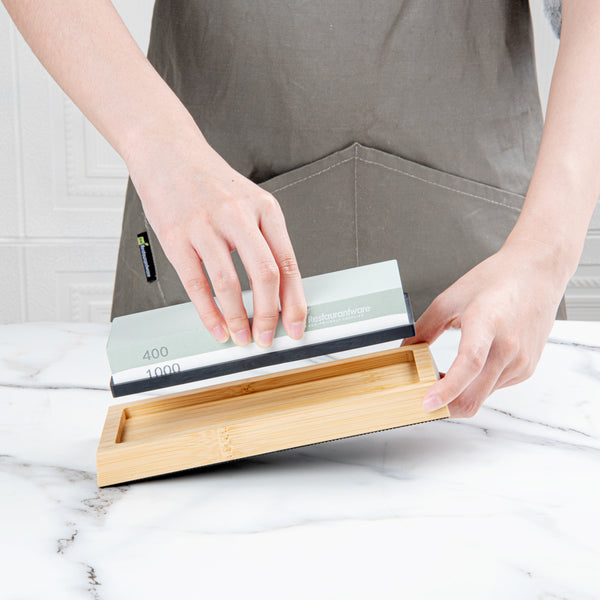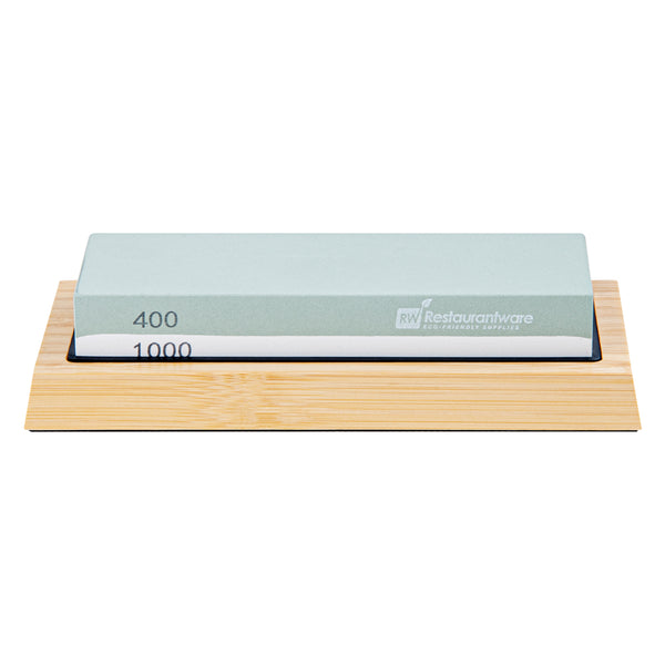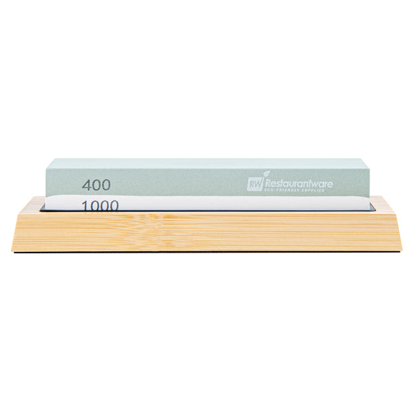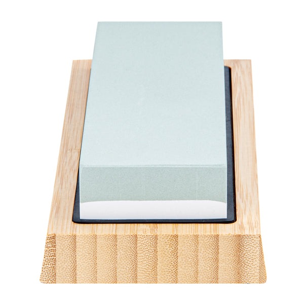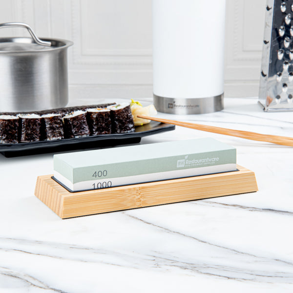 Expertly sharpen dull kitchen knives with our Sensei Whetstone Knife Sharpening Set. With a whetstone knife sharpener, angle guide, and a bamboo base, this knife sharpening stone set is perfect for refining your knives' edges and keeping them in pristine condition. This sharpening set features a non-slip bamboo base that safely keeps the stone in place while in use to avoid accidents. The two-side grit of this whetstone knife sharpening set allows you to use the 400 grit side for any chipped edges and the 1000 grit side to sharpen your knife. This knife whetstone set includes an angle guide to expertly sharpen all kinds of knives, such as sushi knives, steak knives, or santoku knives. The sharpening stone of this whetstone set is made from strong corundum for durability. Measuring 8.25 inches in length by 3.5 inches in width by 2.25 inches in height, this knife sharpening set is sold in a 1 count box.