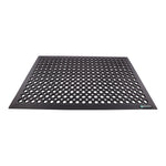 Provide a slip-resistant surface in your foodservice establishment with our Serve Secure Rectangle Black Rubber Floor Mat. Constructed from high-quality rubber, this black floor mat is anti-fatigue and robust for long-lasting use. This rubber floor mat is lined with beveled edges on all sides to minimize the risk of tripping or falling over. The honeycomb holes on this rubber mat easily drain liquids and create a stable surface for balanced footing. Ideal for prep areas or service counters, this floor mat is easy to roll out and clean after use. This doormat measures 36 inches in length by 24 inches in width. Shipped in a 1 count box.