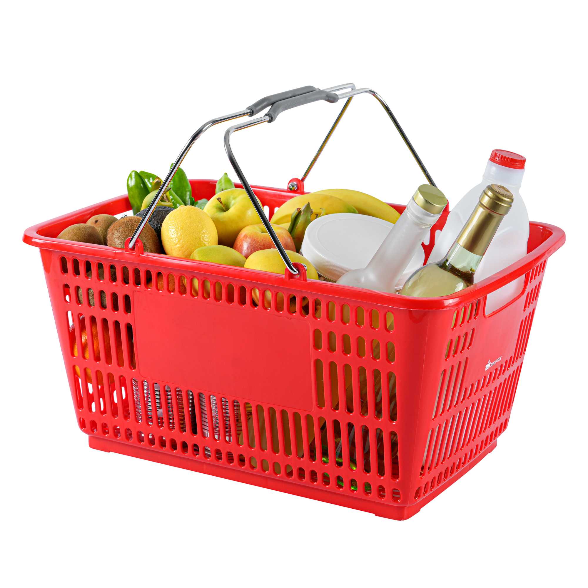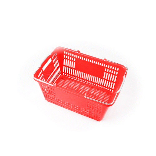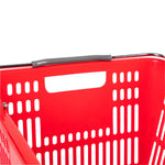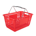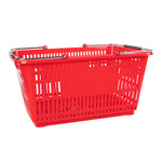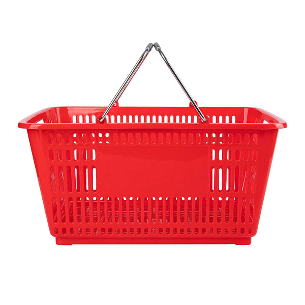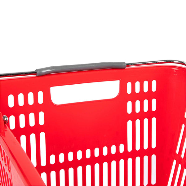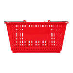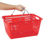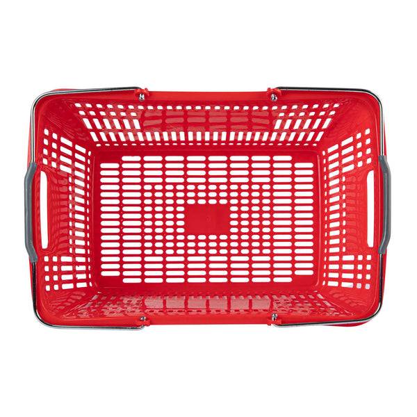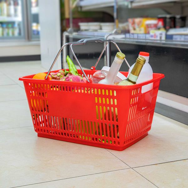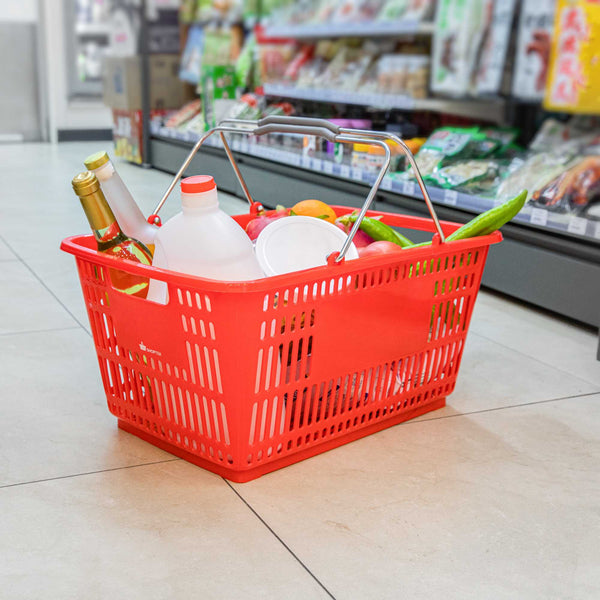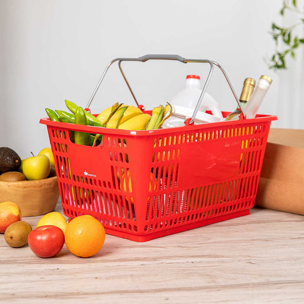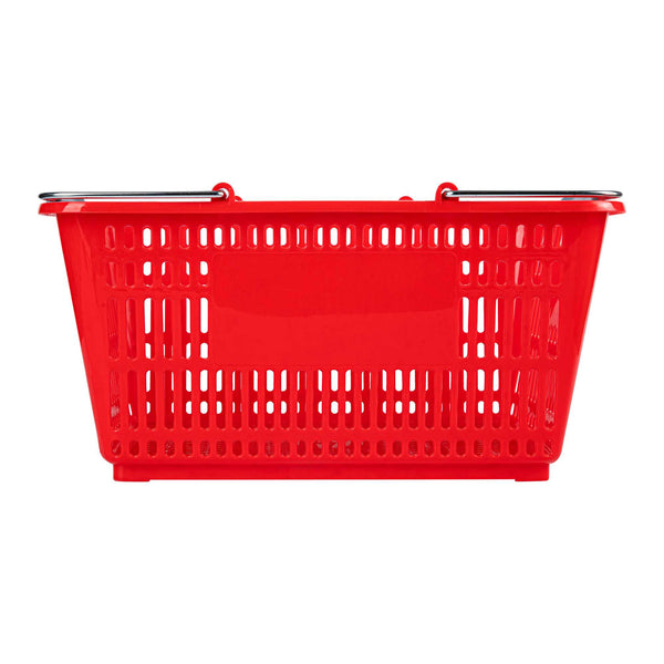 Keep your store running smoothly with the Shop Tek Red Plastic Grocery Market Shopping Basket. Designed from durable plastic, it stands up to constant use while maintaining its lightweight feel. The spacious interior, measuring 19.29 inches by 12.99 inches by 9.25 inches, easily accommodates groceries, household items, or market goods, making it practical for a wide range of retail settings. Strong steel handles provide lasting support and a steady grip, even when carrying heavier loads. Its stackable structure reduces clutter and maximizes storage space when baskets are not in use. The bold red finish not only adds a vibrant touch but also makes baskets easy for customers to spot quickly. Ideal for everyday use in supermarkets, convenience stores, or farmers’ markets, this basket offers durability, functionality, and convenience in one. Each order includes 10 Shop Tek Plastic Shopping Baskets.