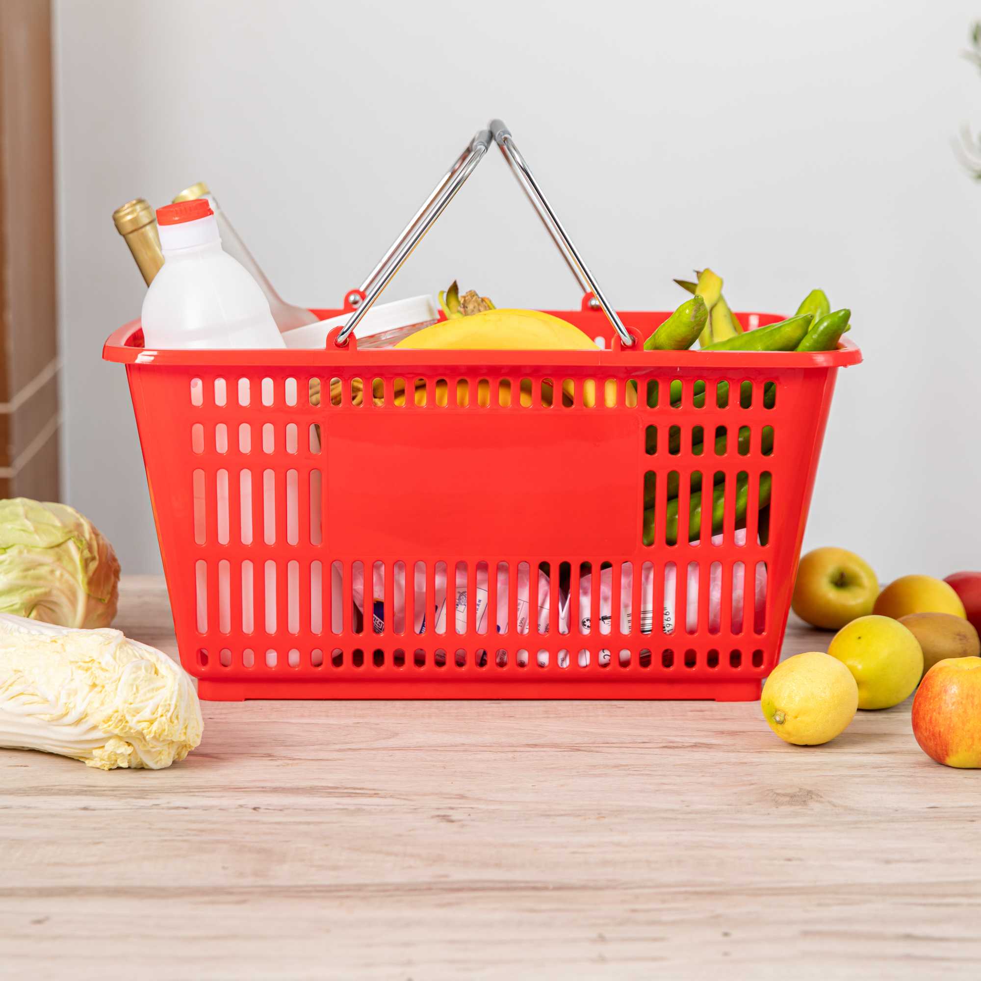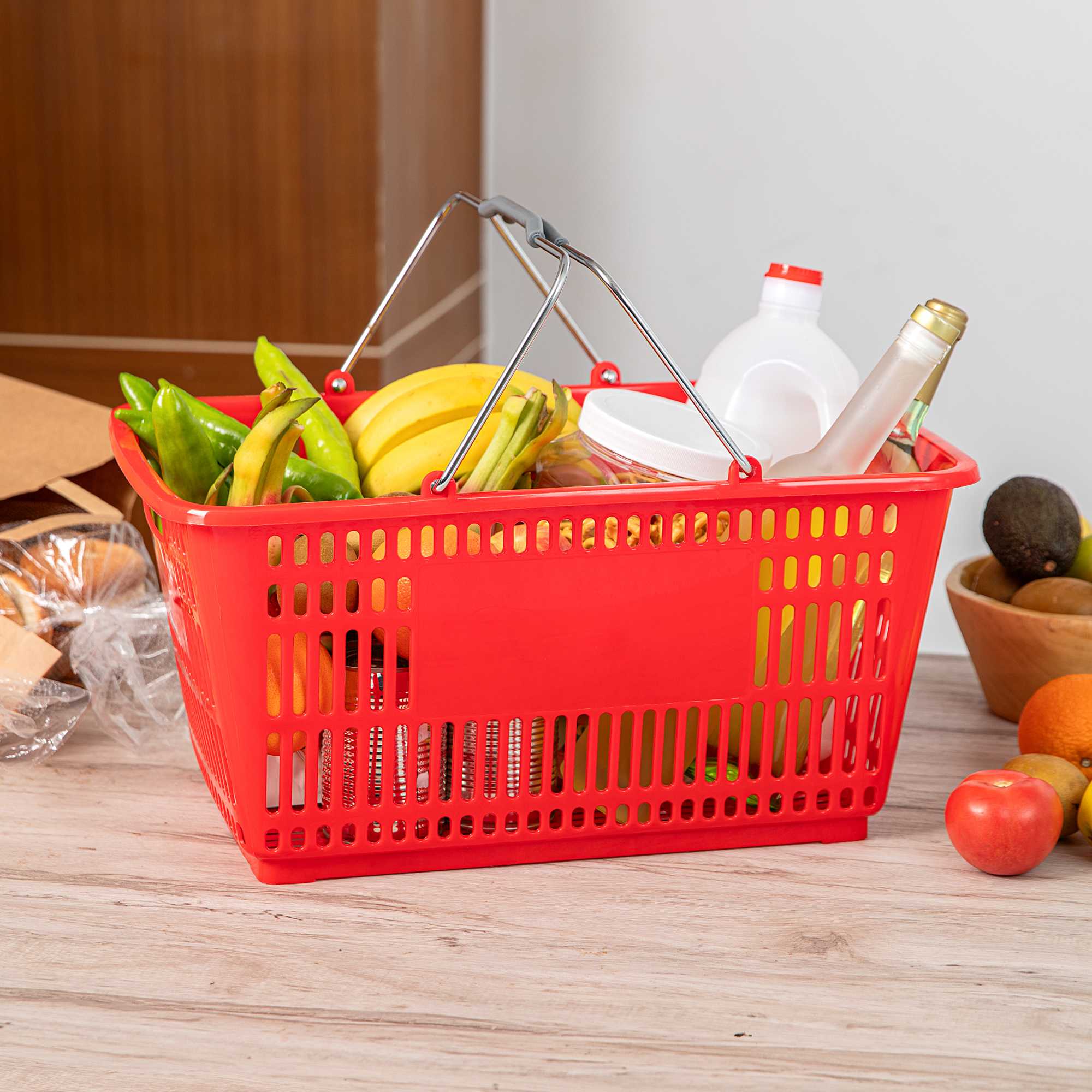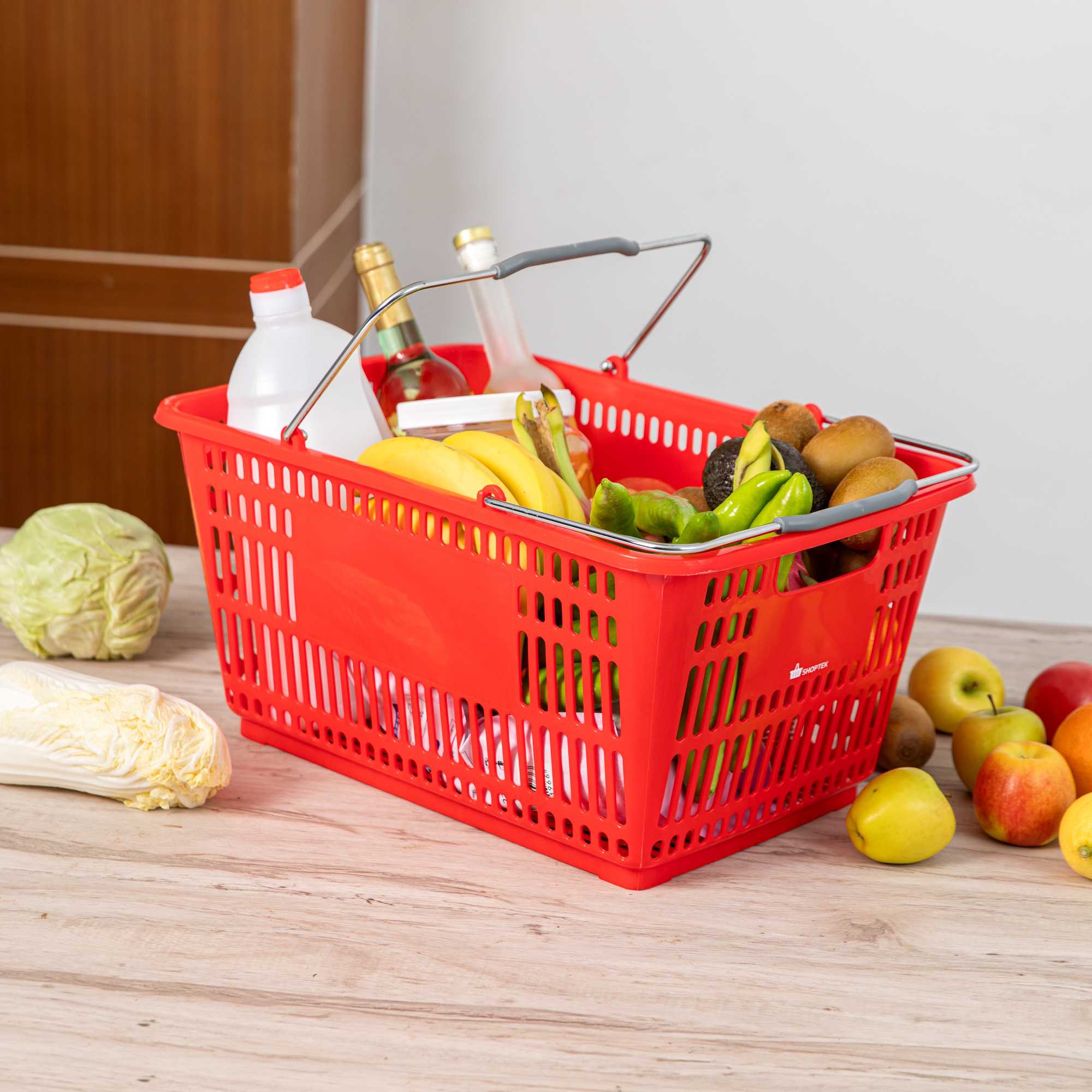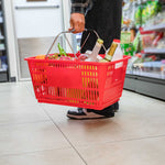 Keep your store running smoothly with the Shop Tek Red Plastic Grocery Market Shopping Basket. Designed from durable plastic, it stands up to constant use while maintaining its lightweight feel. The spacious interior, measuring 19.29 inches by 12.99 inches by 9.25 inches, easily accommodates groceries, household items, or market goods, making it practical for a wide range of retail settings. Strong steel handles provide lasting support and a steady grip, even when carrying heavier loads. Its stackable structure reduces clutter and maximizes storage space when baskets are not in use. The bold red finish not only adds a vibrant touch but also makes baskets easy for customers to spot quickly. Ideal for everyday use in supermarkets, convenience stores, or farmers’ markets, this basket offers durability, functionality, and convenience in one. Each order includes 10 Shop Tek Plastic Shopping Baskets.