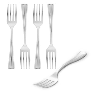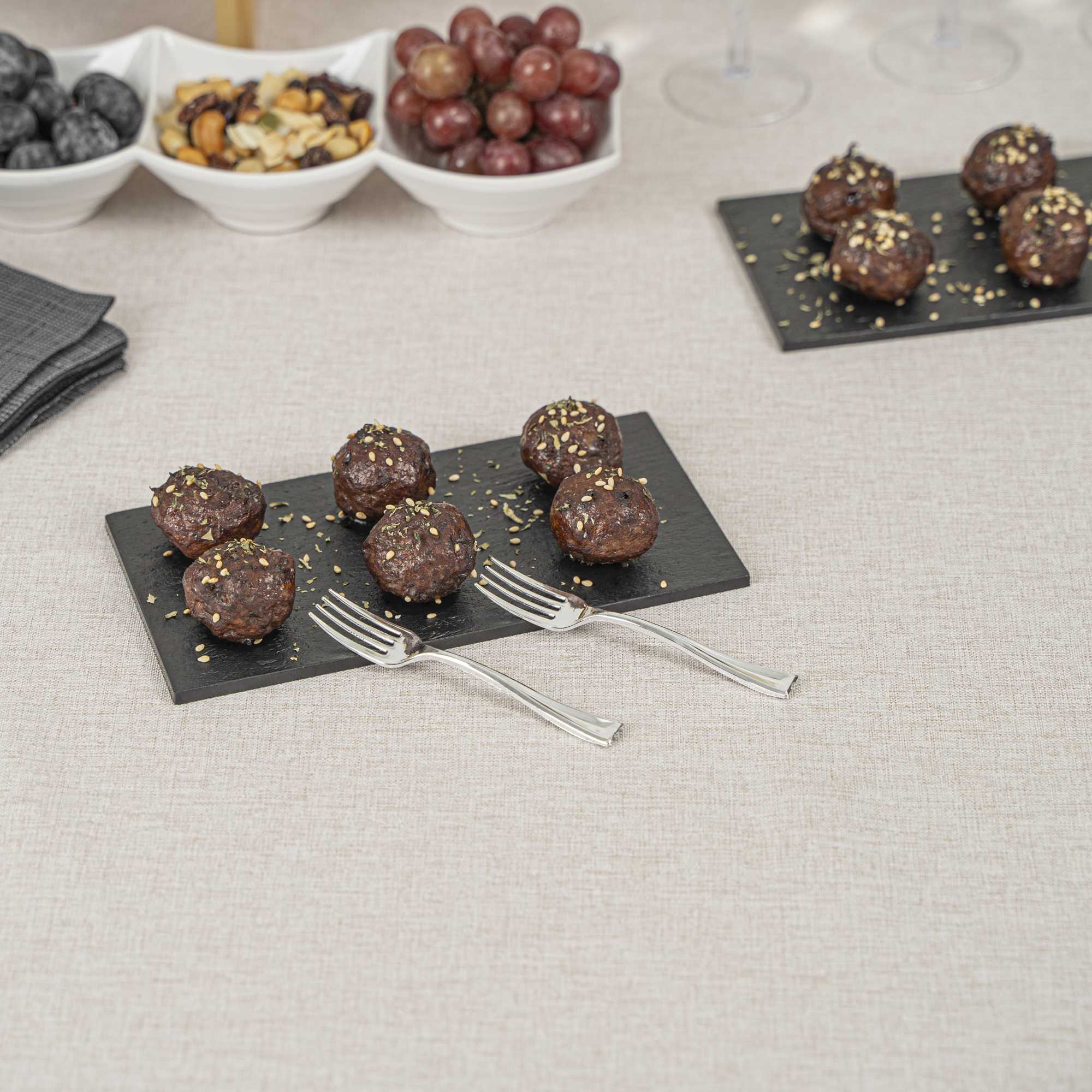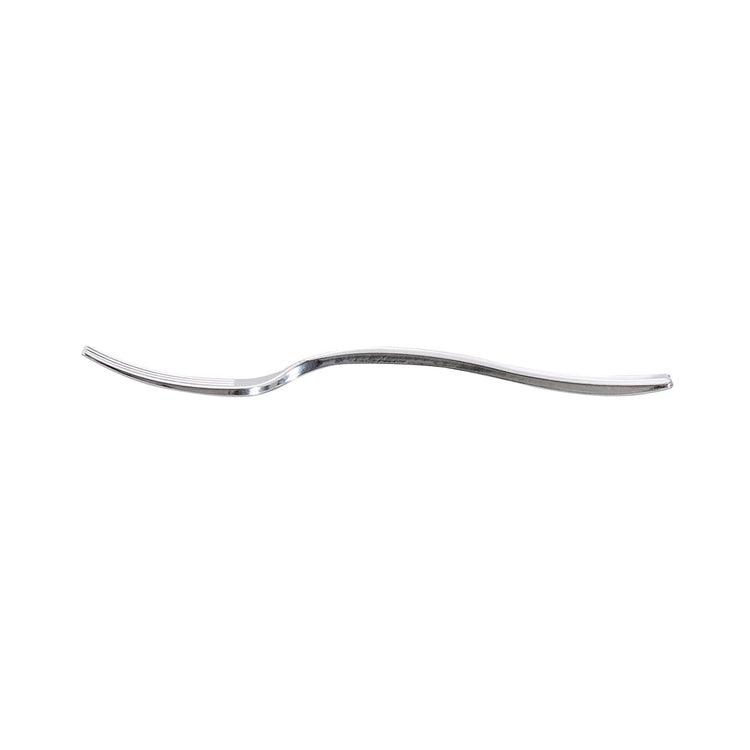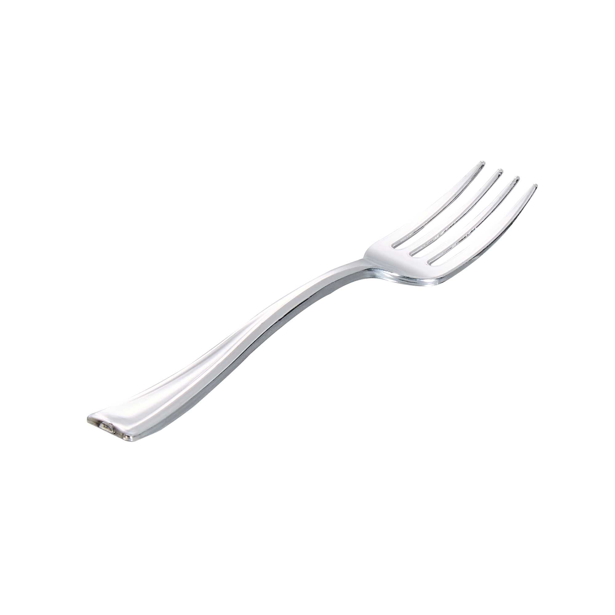 Elevate the look of your table setting with our Mini Serve Silver Plastic Mini Forks. Featuring a shiny silver finish, these silver plastic forks are designed to effortlessly enhance the presentation of your tantalizing dishes. With their strong and sturdy handles, these cake forks are built to stand up to hefty bites of polenta and big scoops of gelato. Made from premium plastic, these appetizer forks are conveniently disposable and recyclable, making them a perfect flatware option for eco-conscious cafes, venues, and clients. Measuring 4 inches in length, these single-use forks are the ideal size to accompany miniature tuna tartare or personal-sized strawberry shortcakes. Shipped in a 500 count box.