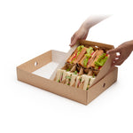Keep your entrees separated from your appetizers with our Slide Tek Rectangle Kraft Paper Medium Inserts. These sturdy tray inserts fit perfectly in our coordinating catering boxes (SKU: RWA0866K) to keep dishes organized and provide caterers with a simple way to transport dishes from their workstations to events. Each kraft food tray insert is designed with high walls and a sturdy base to prevent meals from mixing together and easily contain hefty foods. These disposable serving tray inserts are grease-resistant to lock in oils and eliminate leaks. Constructed from kraft paper, these disposable catering tray inserts are recyclable for a quick and eco-friendly way to dispose of inserts after catered events. Each rectangle tray insert measures 12 inches long by 8.75 inches wide by 3.25 inches tall and is shipped flat for space-saving storage in your foodservice establishment. Up to 2 of these medium food tray inserts fit in our compatible catering tray. Sold in a 10 count box. Catering trays are available and sold separately.