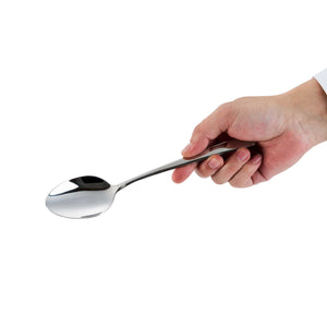 Bring a sophisticated touch to your silverware with these Stainless Steel Tablespoons from our chic Speculo Flatware Collection. Pairing contemporary design with curved lines, these stainless steel spoons provide refined luxury for any occasion. This stainless steel silverware features a high-shine polished finish and subtly rounded details. Made from heavyweight 18/10 stainless steel, these spoons have an impressive weight and feel superbly well-balanced in your hands. Ideal for use as catering or restaurant flatware, these spoons are dishwasher-safe, corrosion-resistant, and dent-resistant. Each of these large spoons measures 8 inches in length. Sold in a 2 count box.