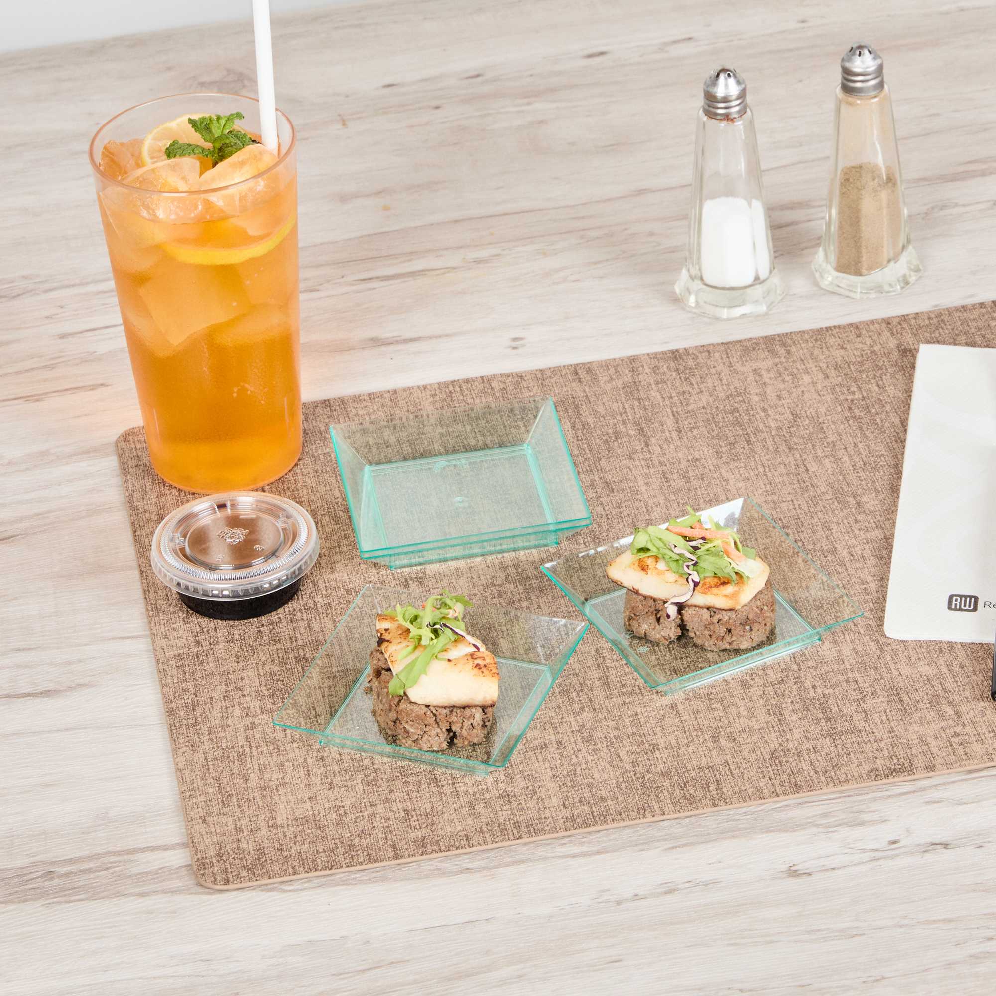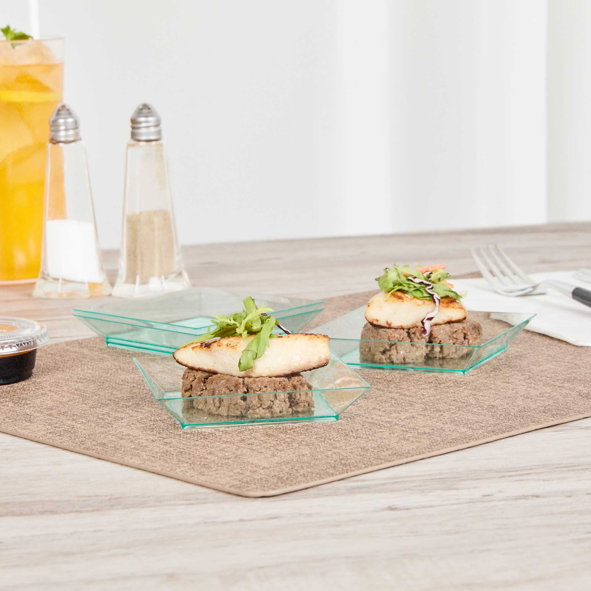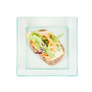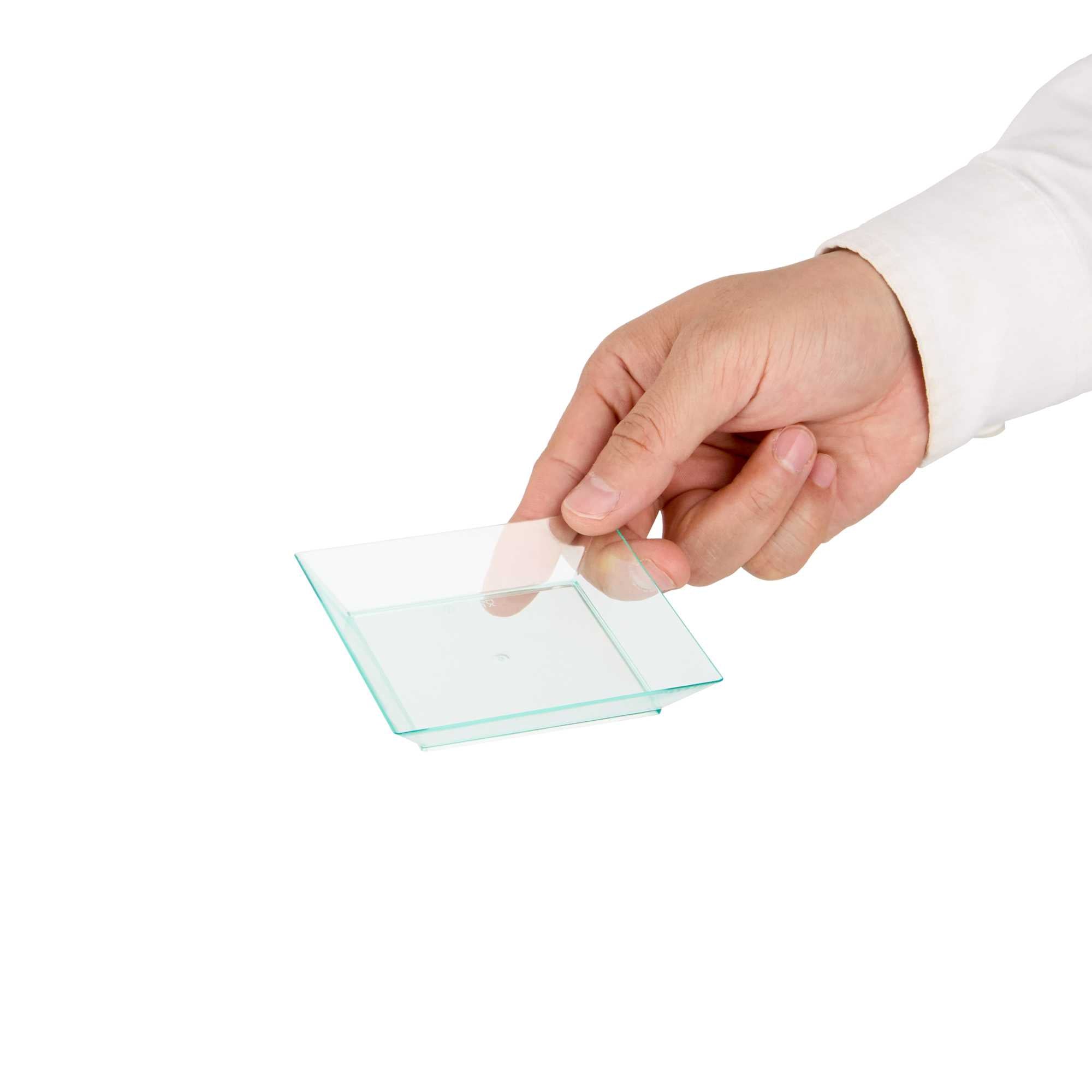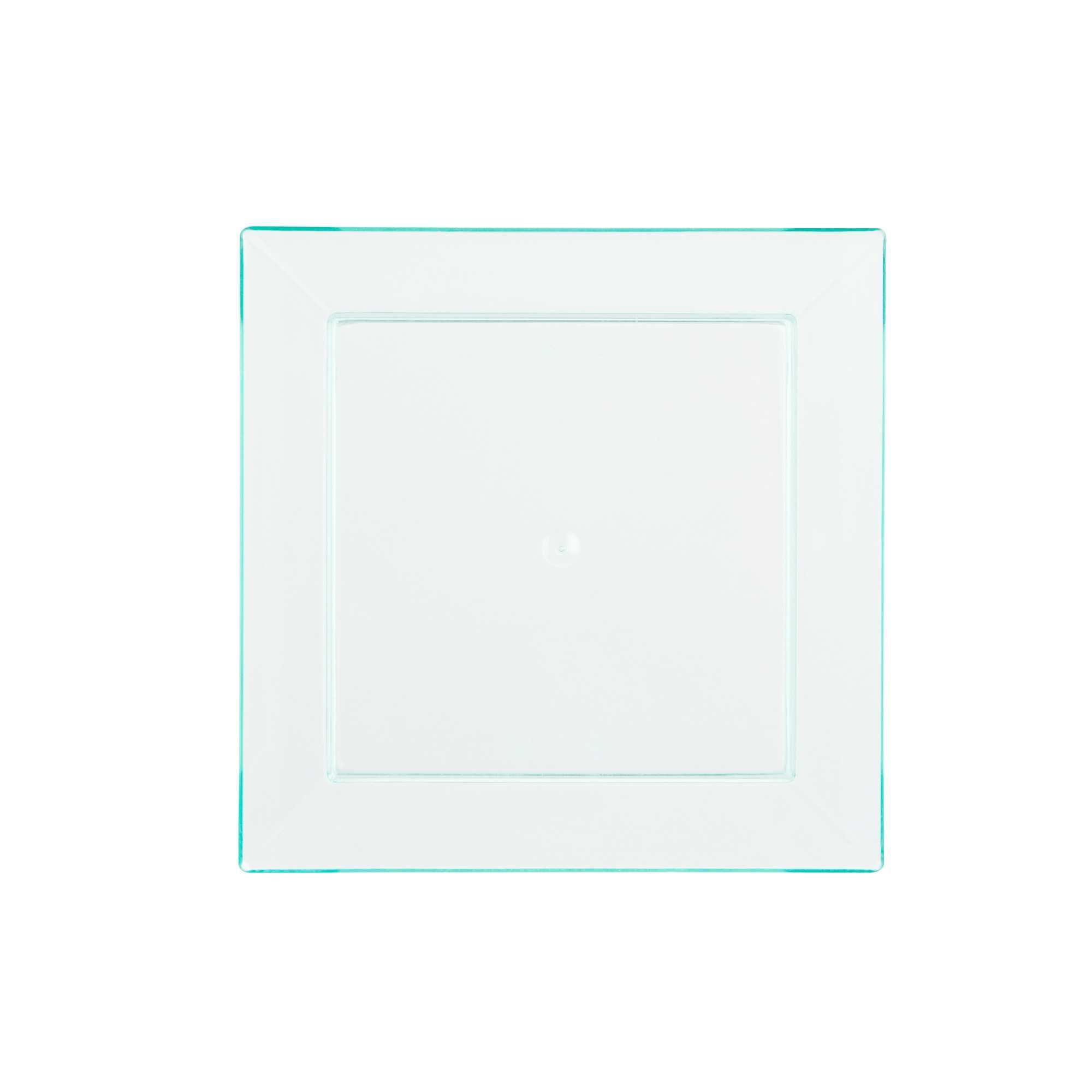 Neatly display personal-sized appetizers and desserts using our Mini Serve Square Seagreen Plastic Small Modern Plates. Ideal for catering services, restaurants, or other foodservice establishments, these plastic plates are crafted with premium plastic and are recyclable to streamline your cleaning process after use. Featuring a beautiful seagreen finish and squared design, these appetizer plates are perfect for adding a unique look to traditional hors d'oeuvres. These plastic disposable plates are designed with raised edges to beautifully frame dishes and avoid messes. To prevent foods from spilling on guests, these durable plastic plates are crack-resistant and leak-resistant. Great for maximizing storage space in your commercial kitchen or prep area, these appetizer plates are conveniently stackable. Measuring 3.9 inches in length by 3.9 inches in width and 0.6 inches in height, these plastic disposable plates are sold in a 100 count box.