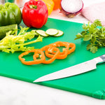 Precisely cut up produce with our Green Sure Grip Commercial Grade Non-Slip Cutting Board. Featuring 4 non-slip grips on each corner, this large cutting board is equipped to stay in place while chopping crisp greens on top of wet and greasy surfaces. This 24-inch wide green chopping board provides quick and easy measurements and portion control with embossed inch and centimeter rulers on either side. Constructed from durable plastic, this cutting board is the solution to protecting your pristine countertops and maintaining the quality of your knives. With a convenient handle, this plastic chopping board is easy to transport and store at your restaurant, cafe, catered event, and more. Our line of Sure Grip Cutting Boards is available in multiple colors to help keep your kitchens organized and prevent cross-contamination of foods. Measuring 18-inches long and 24-inches wide, this green cutting board is intended for delicious produce but can be used for any desired purpose. Available in a 1 count box.