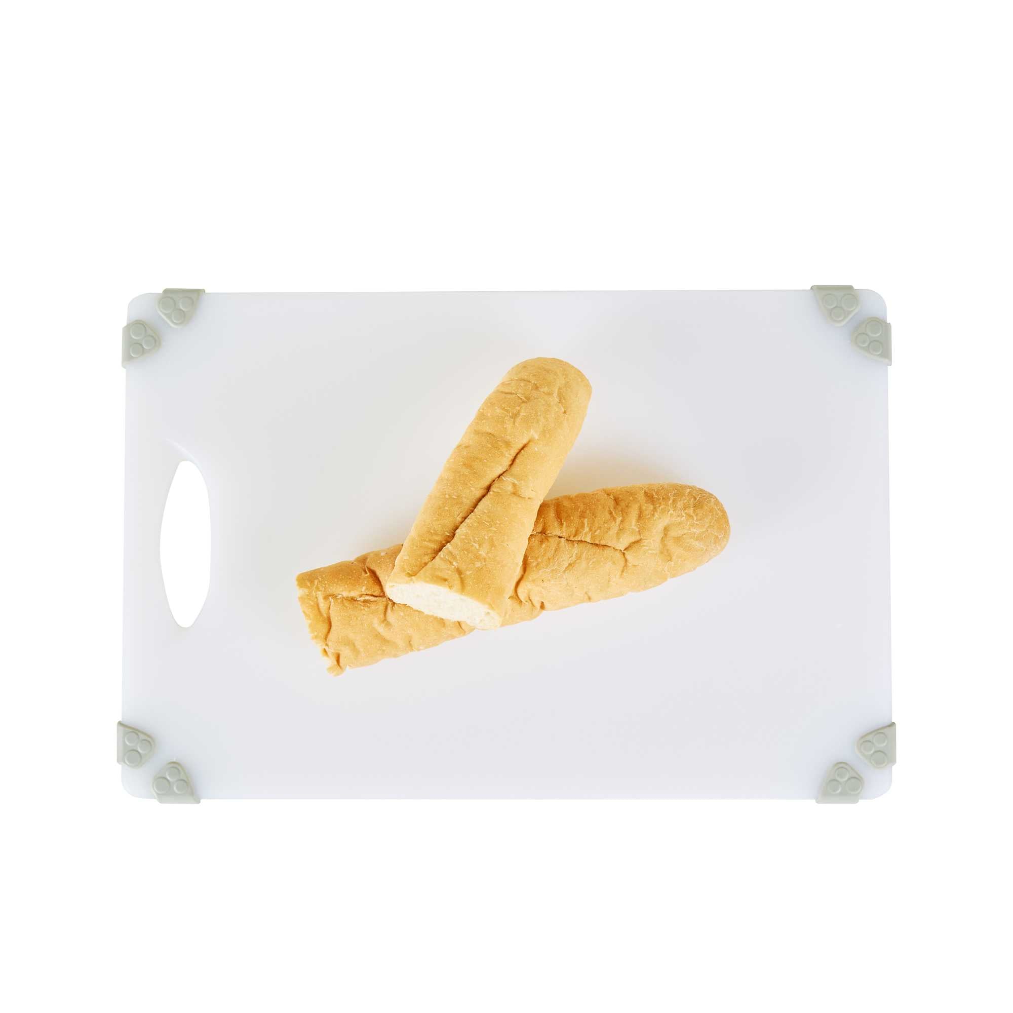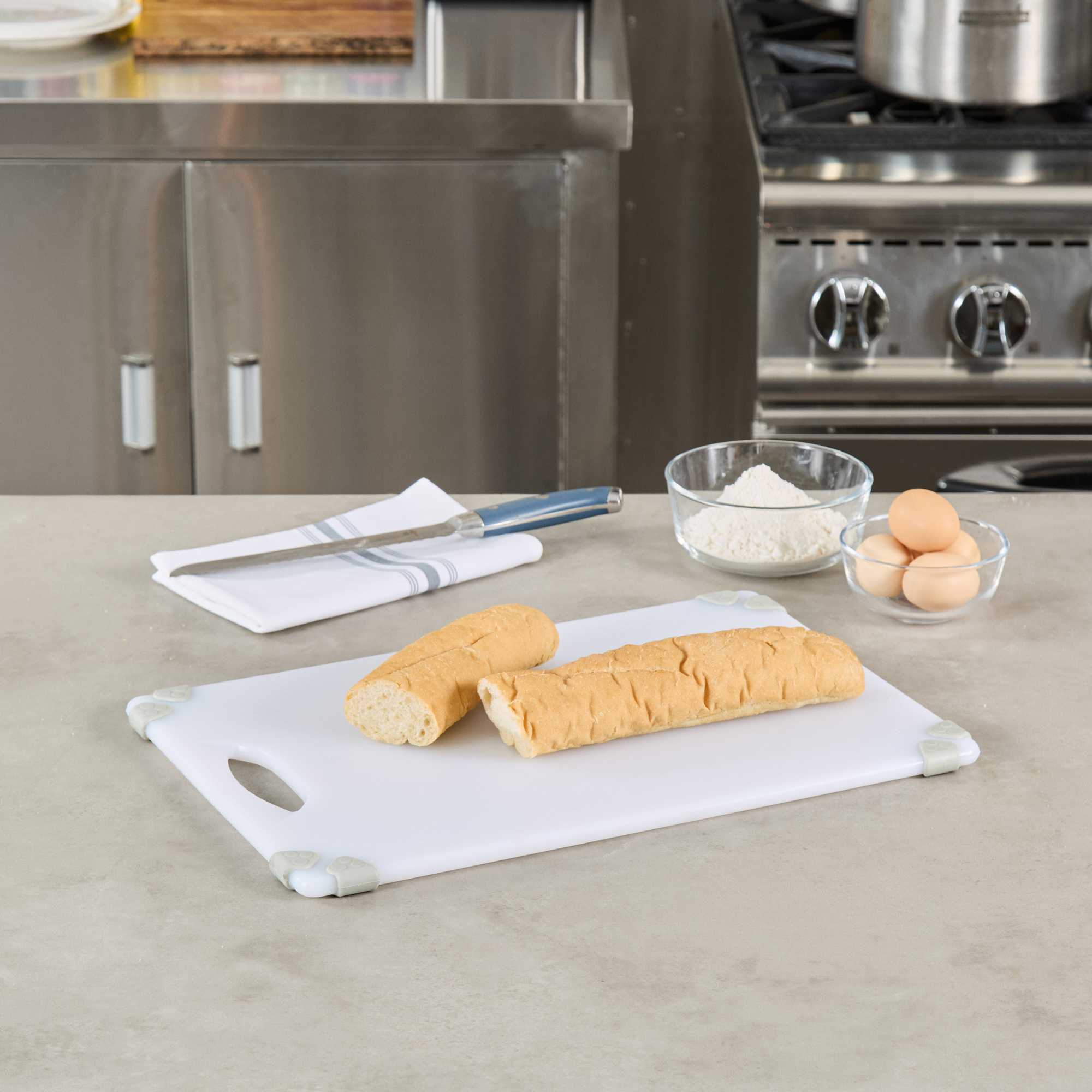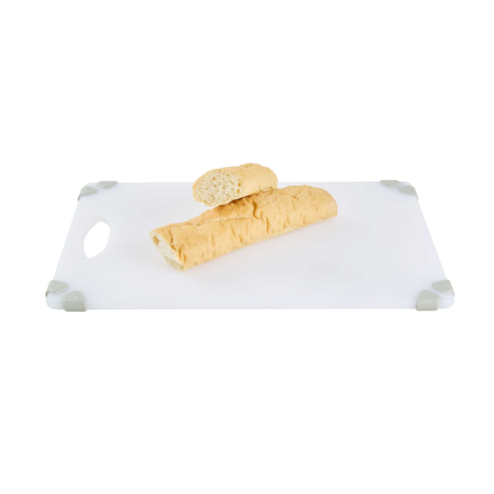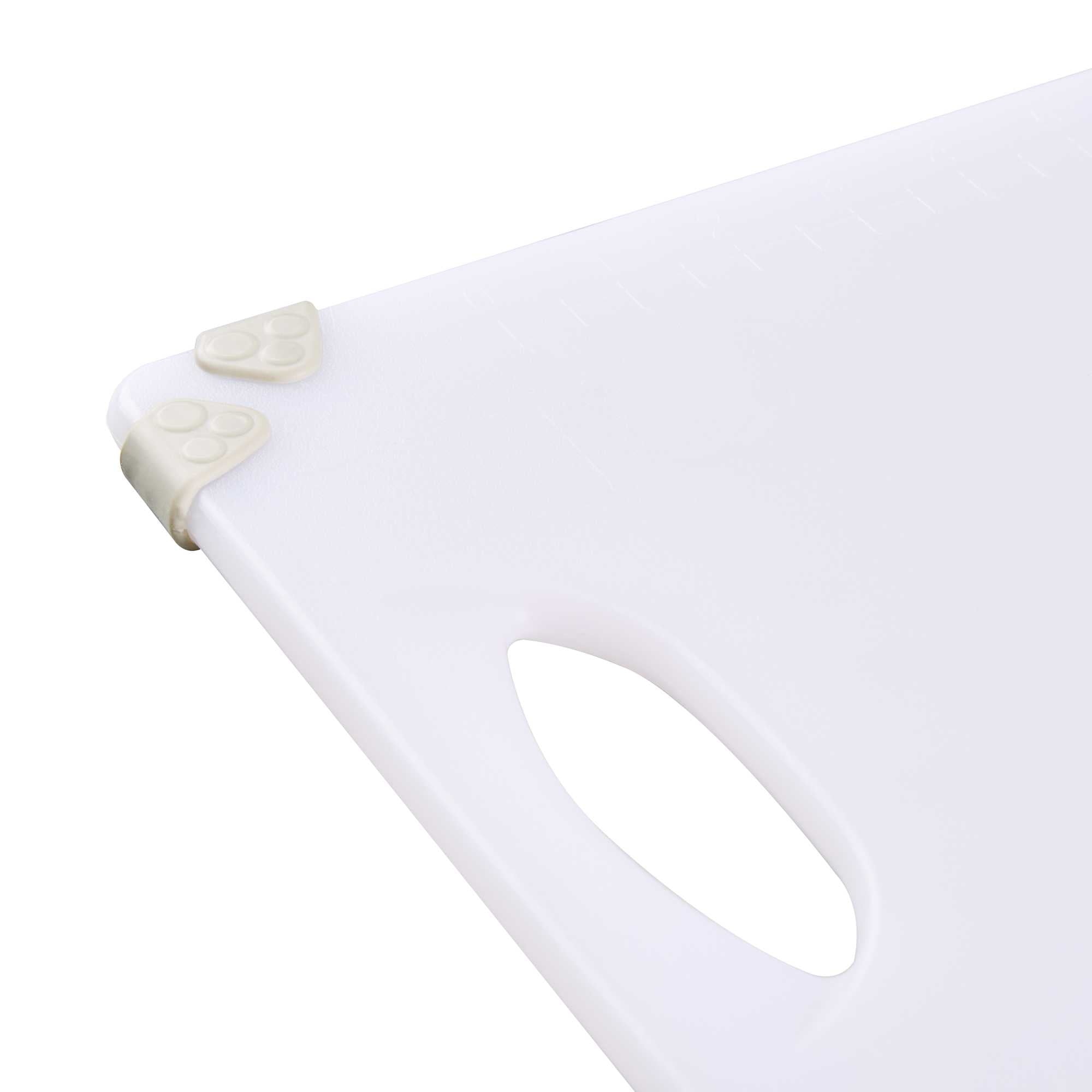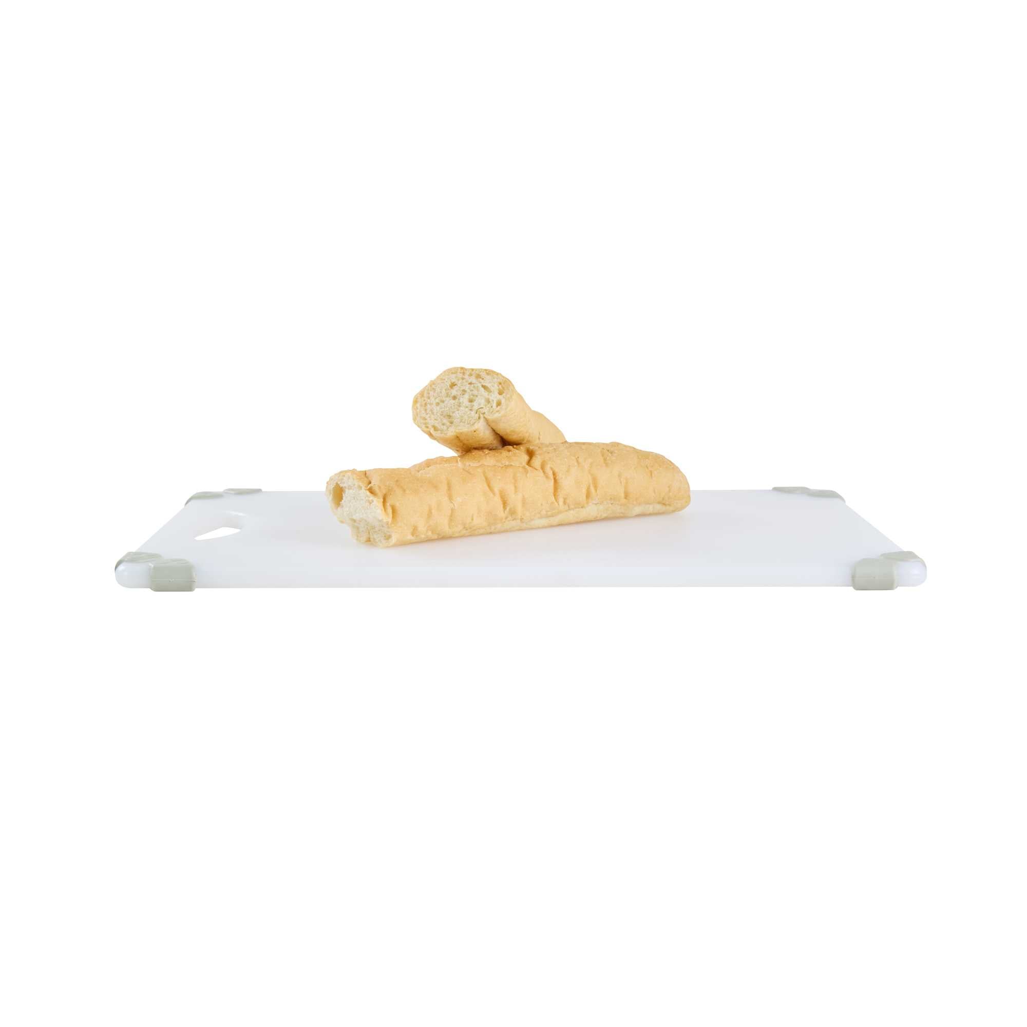 Effortlessly slice baked goods with our White Sure Grip Commercial Grade Non-Slip Cutting Board. Featuring etched measurement markers on either side, this white cutting board provides a quick and easy measuring of dairy and baked products. With 4 non-slip grips on each corner, this white chopping board effectively stays in place on top of wet and greasy surfaces. This cutting board with handle can be easily transported and stored at your restaurant, deli, catering event, and more. This plastic chopping board is the durable solution to protecting your kitchen countertops and maintaining the quality of your knives. This white cutting board is intended for dairy or baked goods but can be used universally. Measuring 12 inches long by 18 inches wide, this non-slip cutting board is sold in a 1 count box.