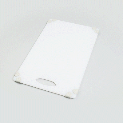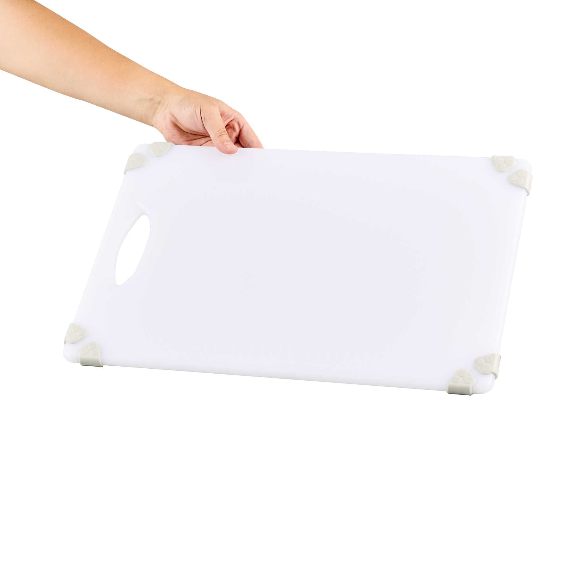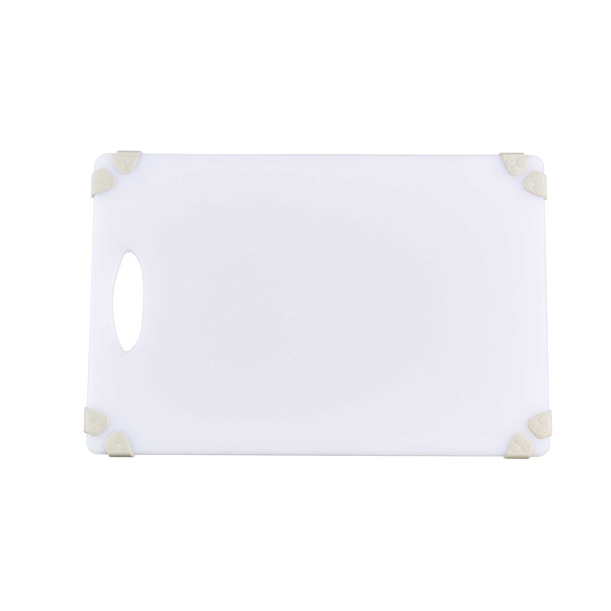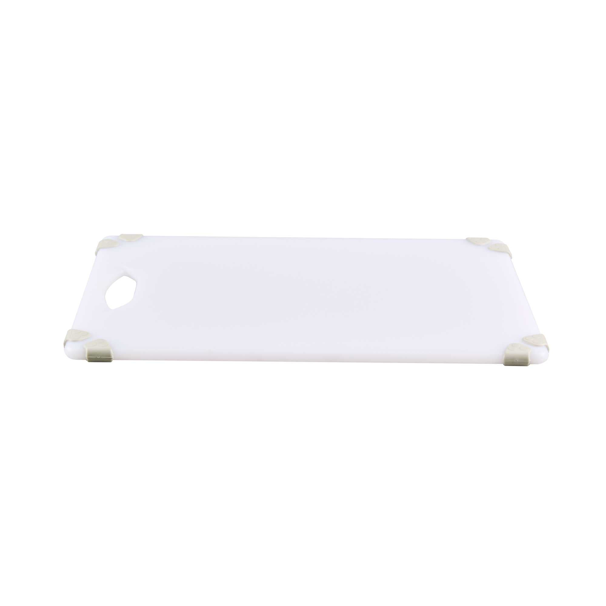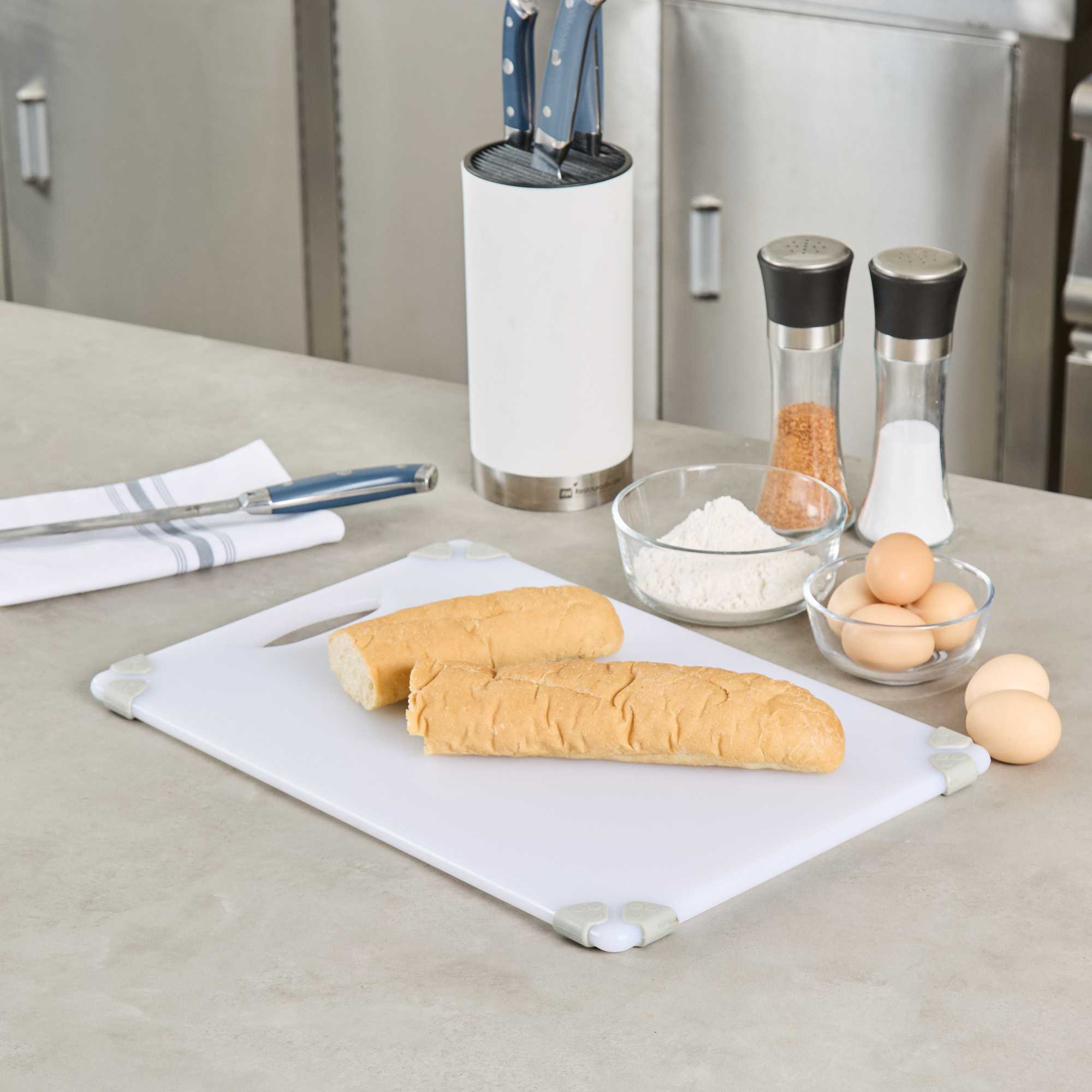 Effortlessly slice baked goods with our White Sure Grip Commercial Grade Non-Slip Cutting Board. Featuring etched measurement markers on either side, this white cutting board provides a quick and easy measuring of dairy and baked products. With 4 non-slip grips on each corner, this white chopping board effectively stays in place on top of wet and greasy surfaces. This cutting board with handle can be easily transported and stored at your restaurant, deli, catering event, and more. This plastic chopping board is the durable solution to protecting your kitchen countertops and maintaining the quality of your knives. This white cutting board is intended for dairy or baked goods but can be used universally. Measuring 12 inches long by 18 inches wide, this non-slip cutting board is sold in a 1 count box.