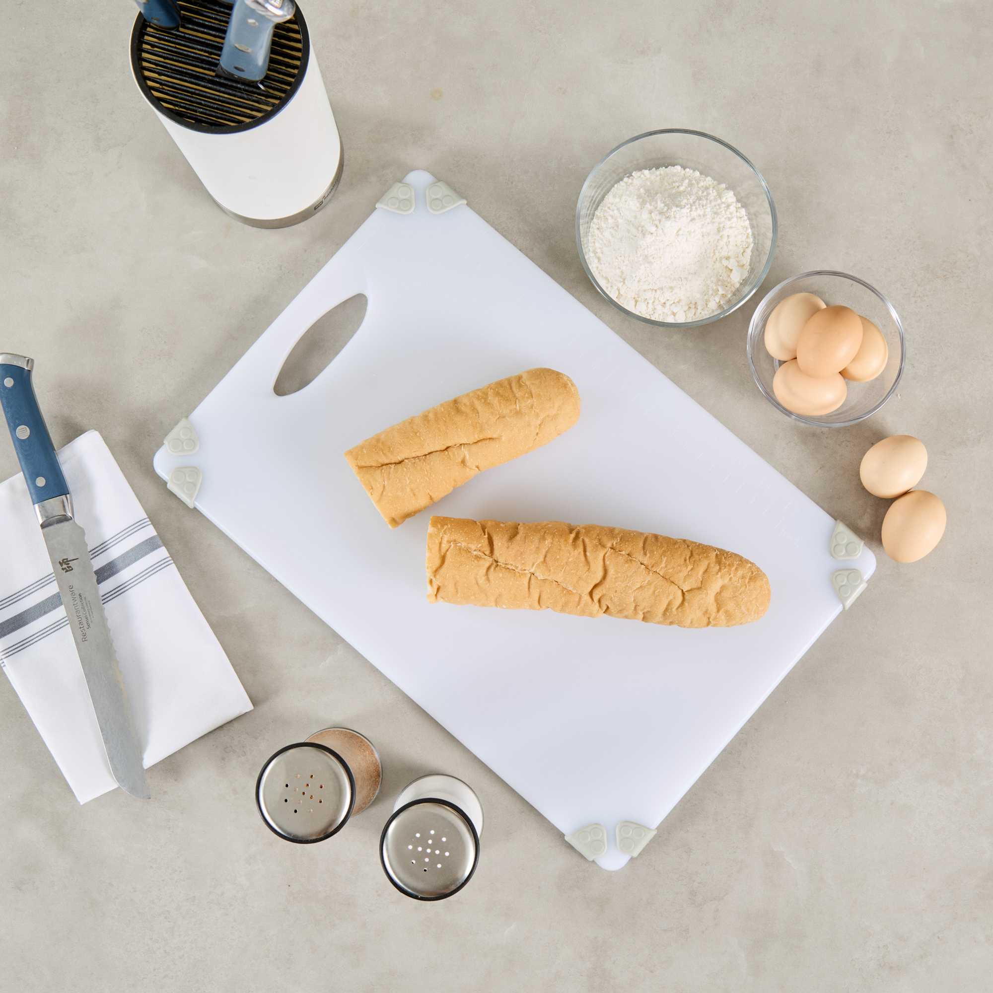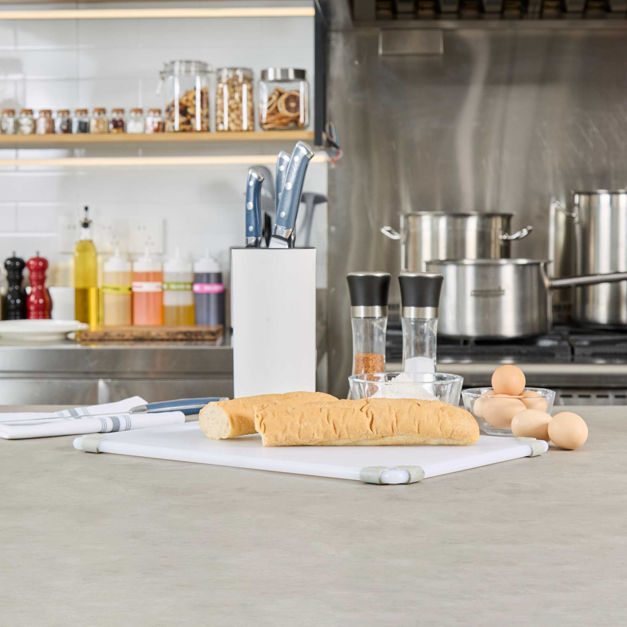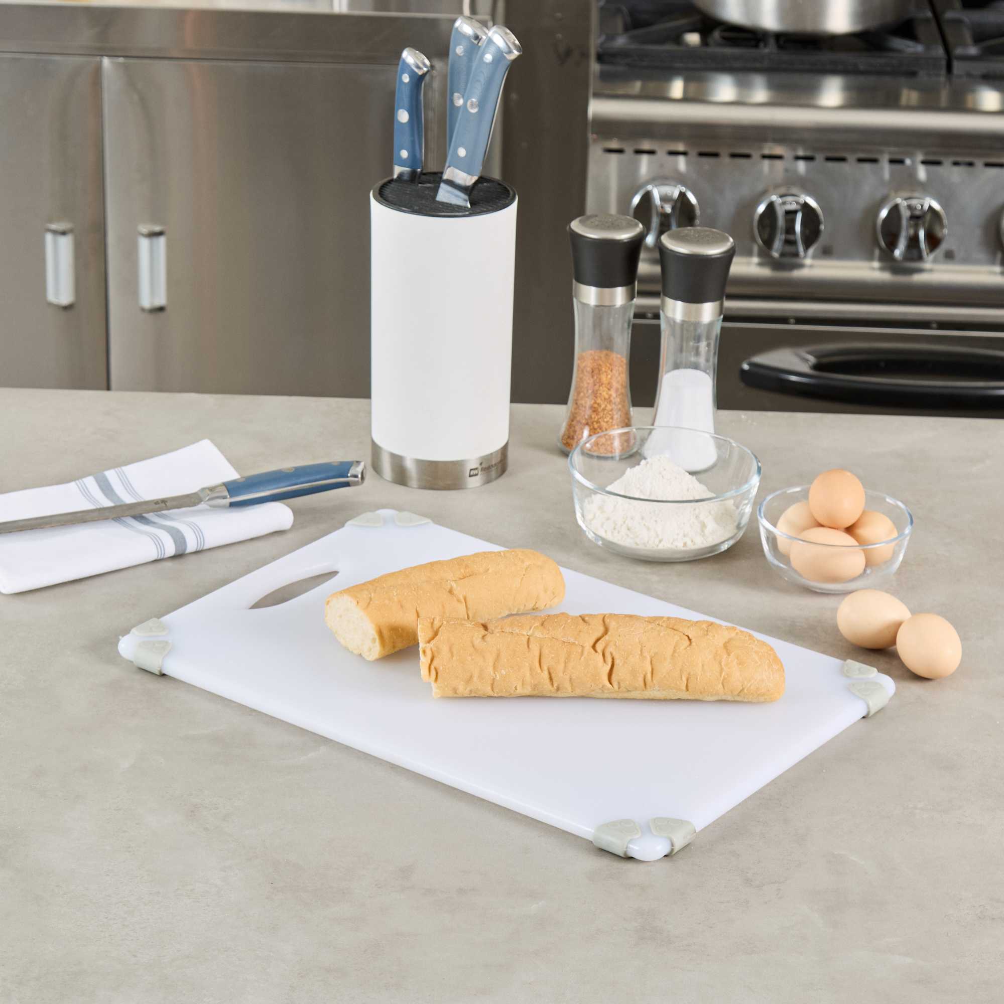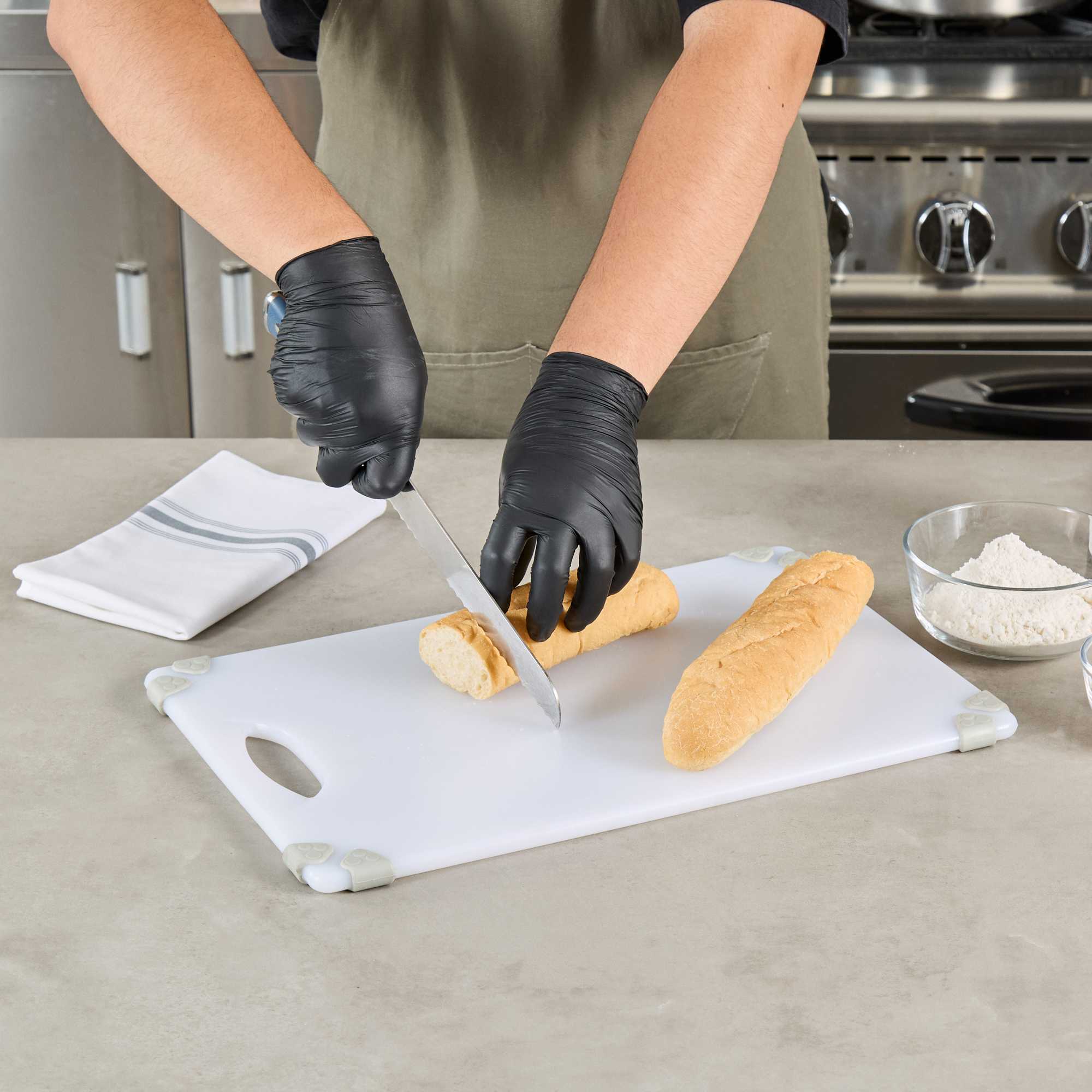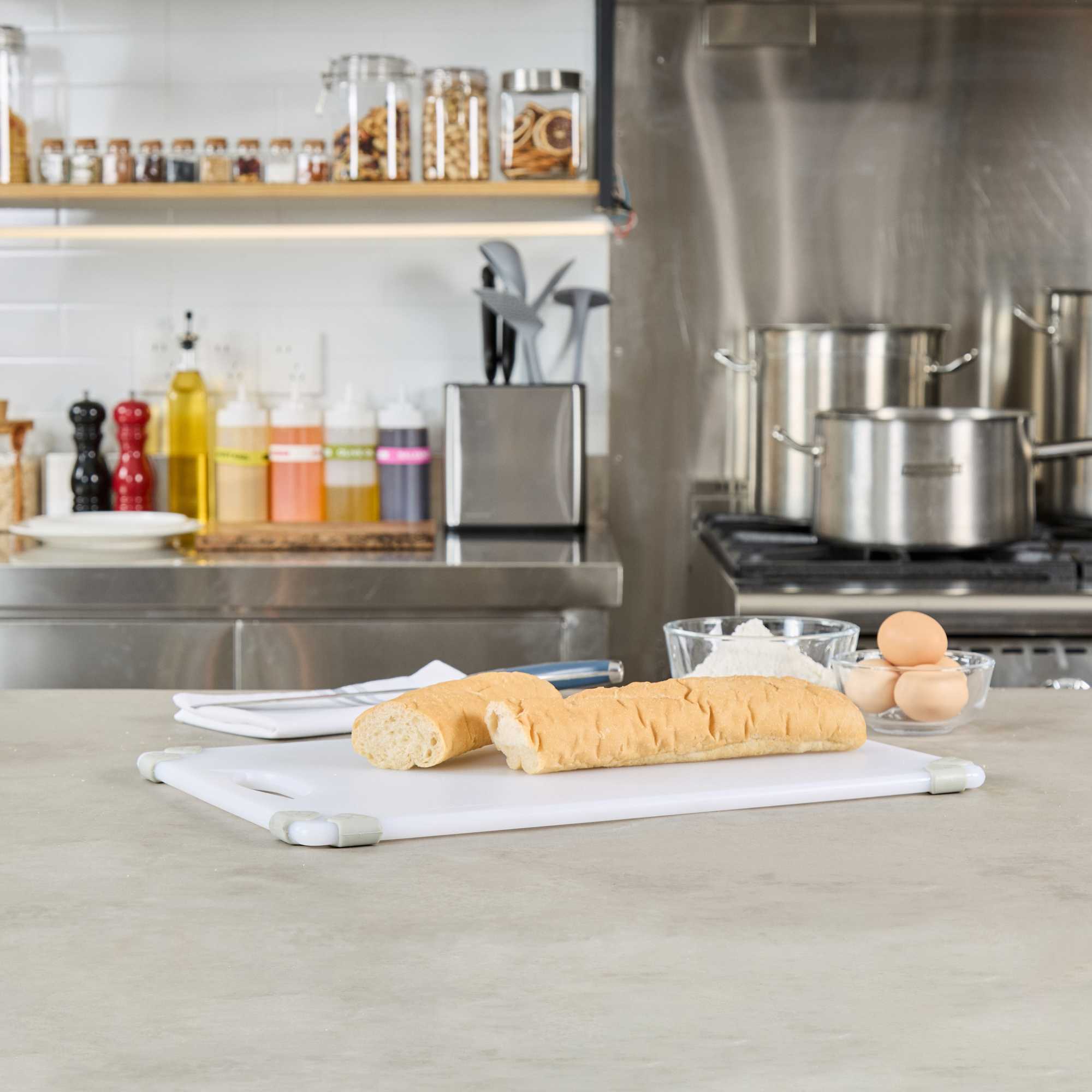 Effortlessly slice baked goods with our White Sure Grip Commercial Grade Non-Slip Cutting Board. Featuring etched measurement markers on either side, this white cutting board provides a quick and easy measuring of dairy and baked products. With 4 non-slip grips on each corner, this white chopping board effectively stays in place on top of wet and greasy surfaces. This cutting board with handle can be easily transported and stored at your restaurant, deli, catering event, and more. This plastic chopping board is the durable solution to protecting your kitchen countertops and maintaining the quality of your knives. This white cutting board is intended for dairy or baked goods but can be used universally. Measuring 12 inches long by 18 inches wide, this non-slip cutting board is sold in a 1 count box.